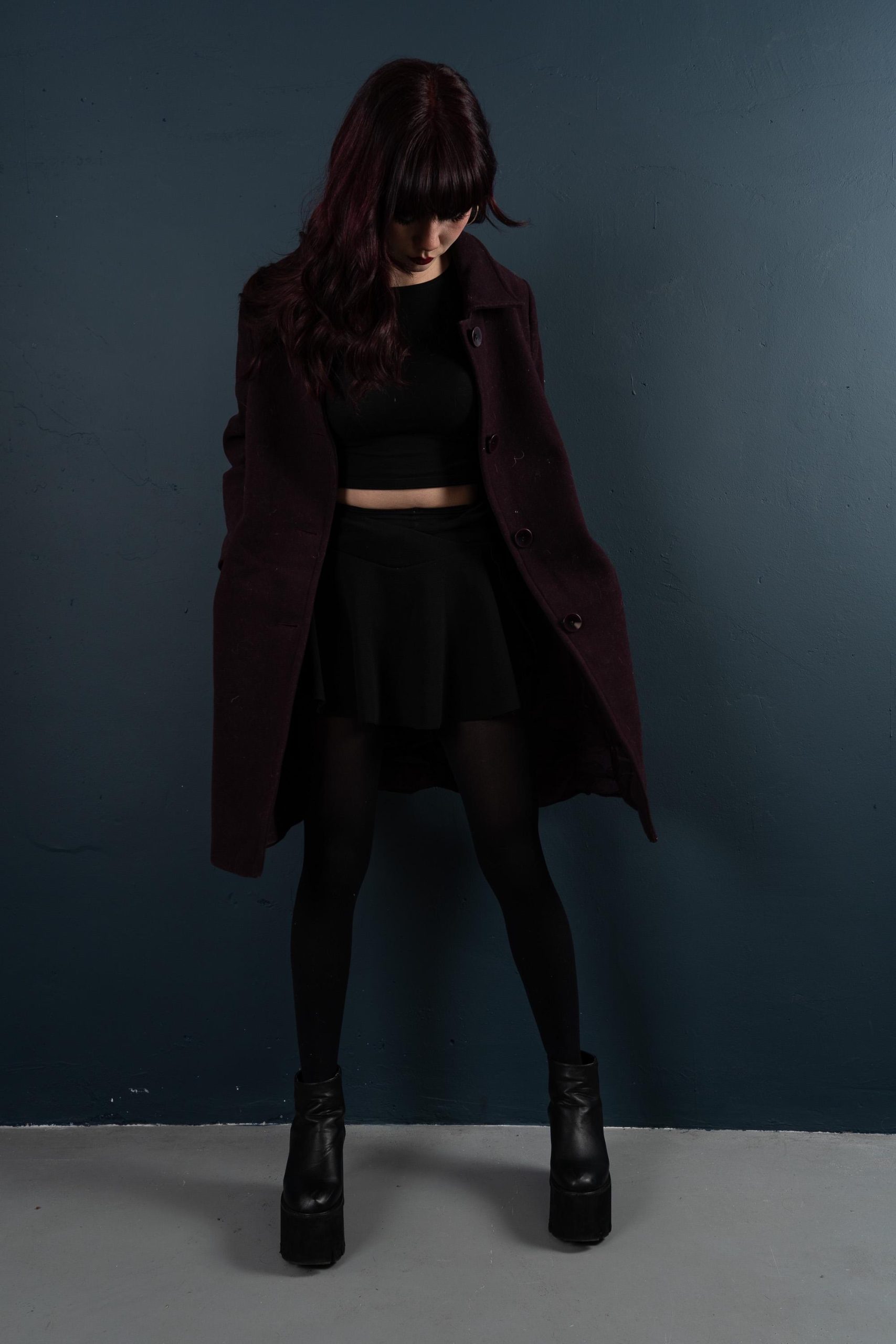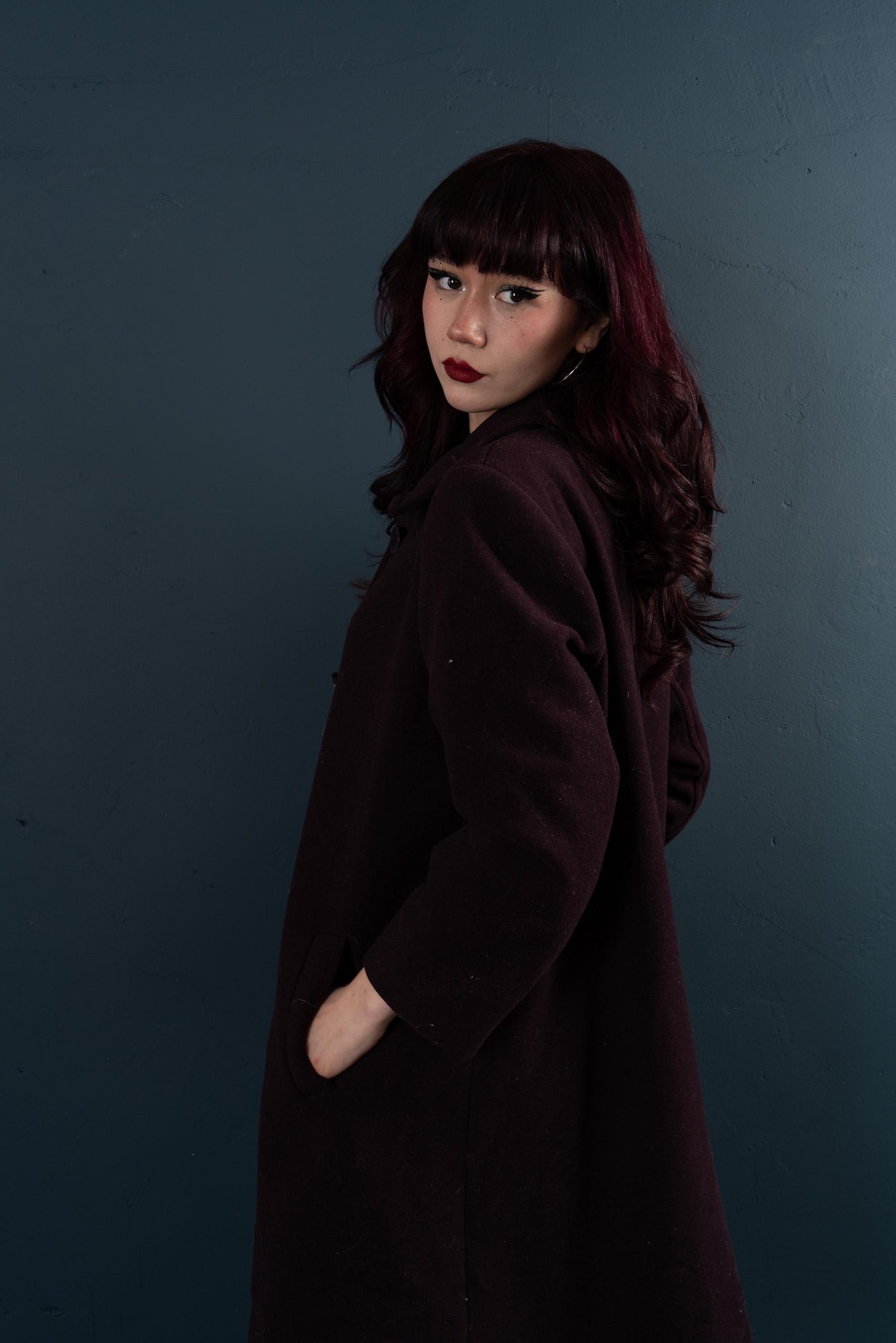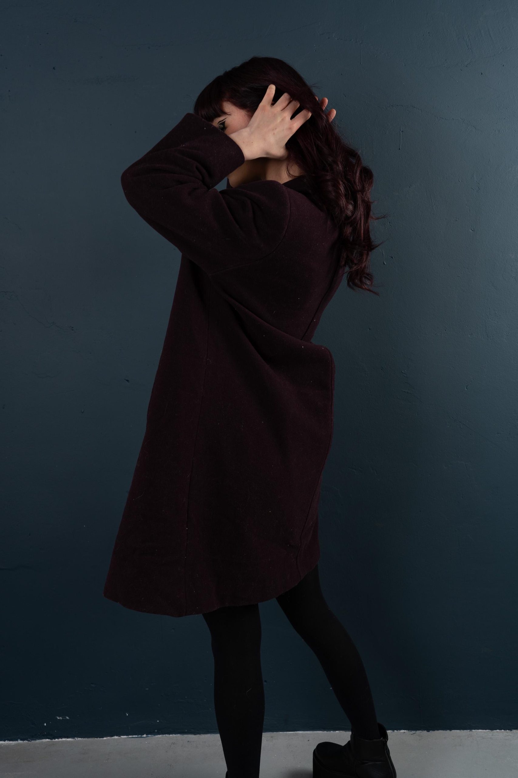 This understated yet elegant coat boasts a rich, deep plum hue. The single-breasted design and simple lapel enhance its sophistication, while the relaxed shoulders and soft A-line silhouette create a modern yet flattering shape. The knee-length cut pairs easily with cardigans or dresses, and features concealed side pockets for convenient storage of everyday essentials. Simple details and tonal buttons make it ideal for a variety of occasions, from work and evening events to weekend relaxation.
