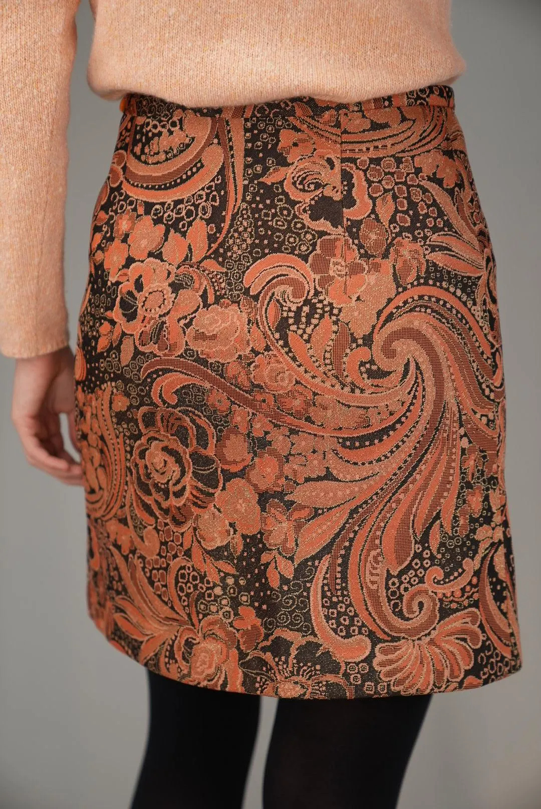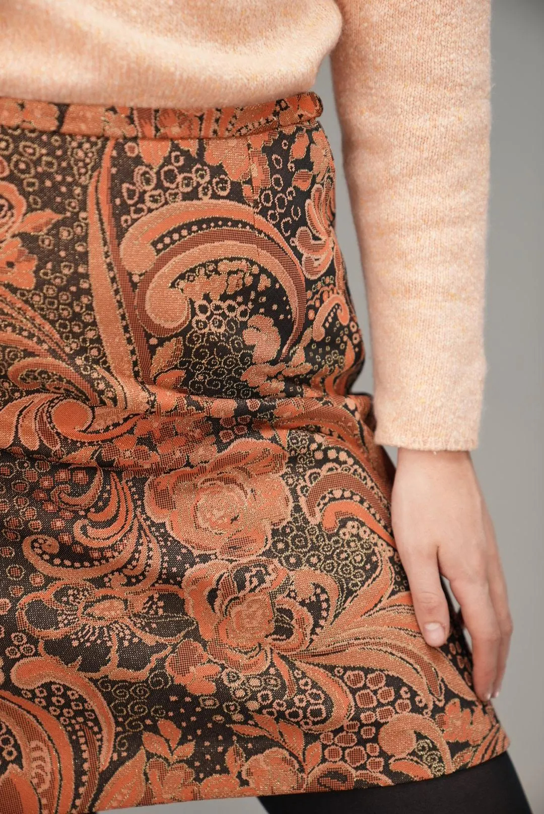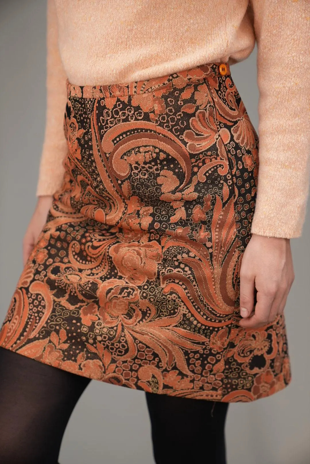 This mini skirt features an ornate baroque-inspired floral print in warm terracotta and soft peach tones set against a deep, dark background. The intricate swirls, florals, and paisley-style motifs give it a rich, vintage feel, while the simple straight silhouette keeps it easy to wear. It is a bold little piece that instantly adds personality to simple knits and tops.