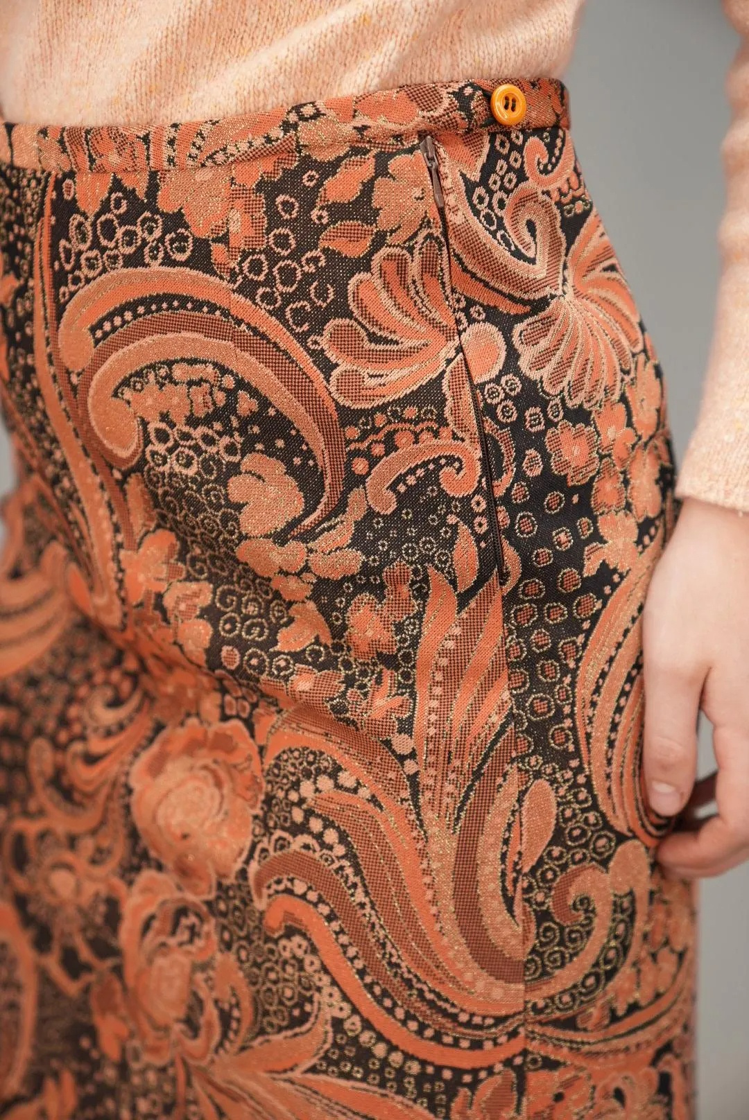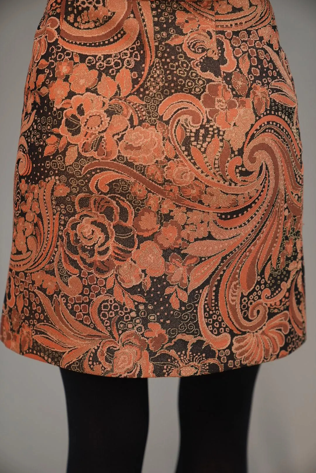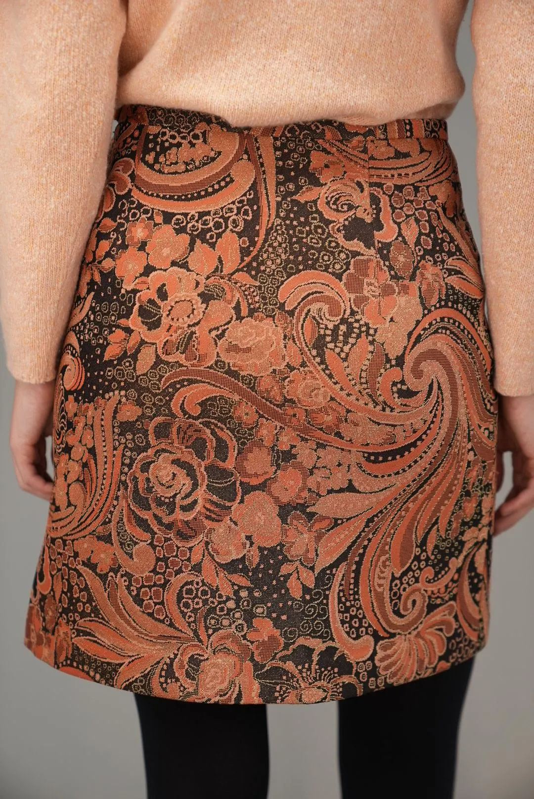 This mini skirt features an ornate baroque-inspired floral print in warm terracotta and soft peach tones set against a deep, dark background. The intricate swirls, florals, and paisley-style motifs give it a rich, vintage feel, while the simple straight silhouette keeps it easy to wear. It is a bold little piece that instantly adds personality to simple knits and tops.