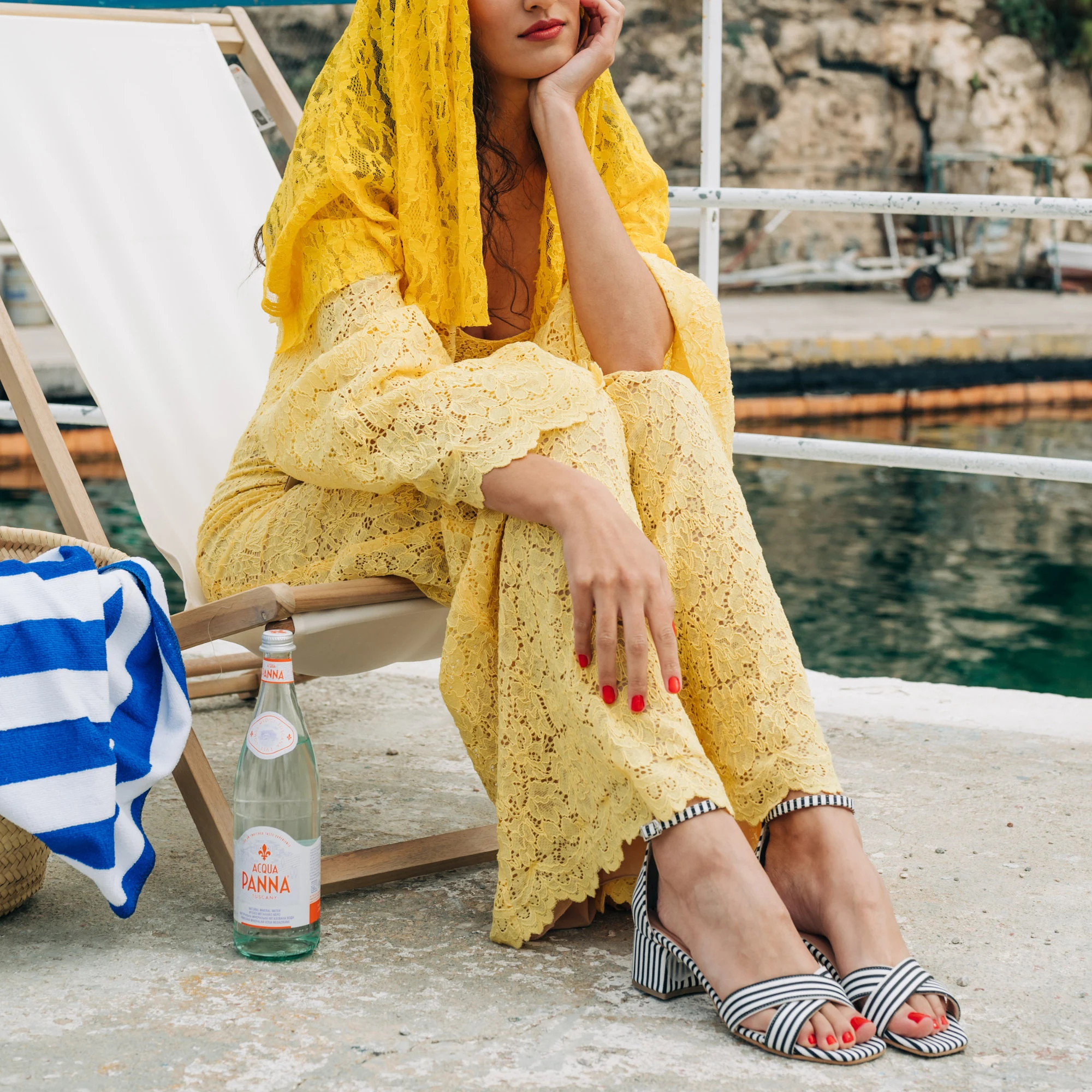 Pair with a white linen dress, a yellow lace midi skirt, or cropped jeans for a fresh contrast. Complete the look with a straw tote bag and gold earrings for a perfect beachy vibe.