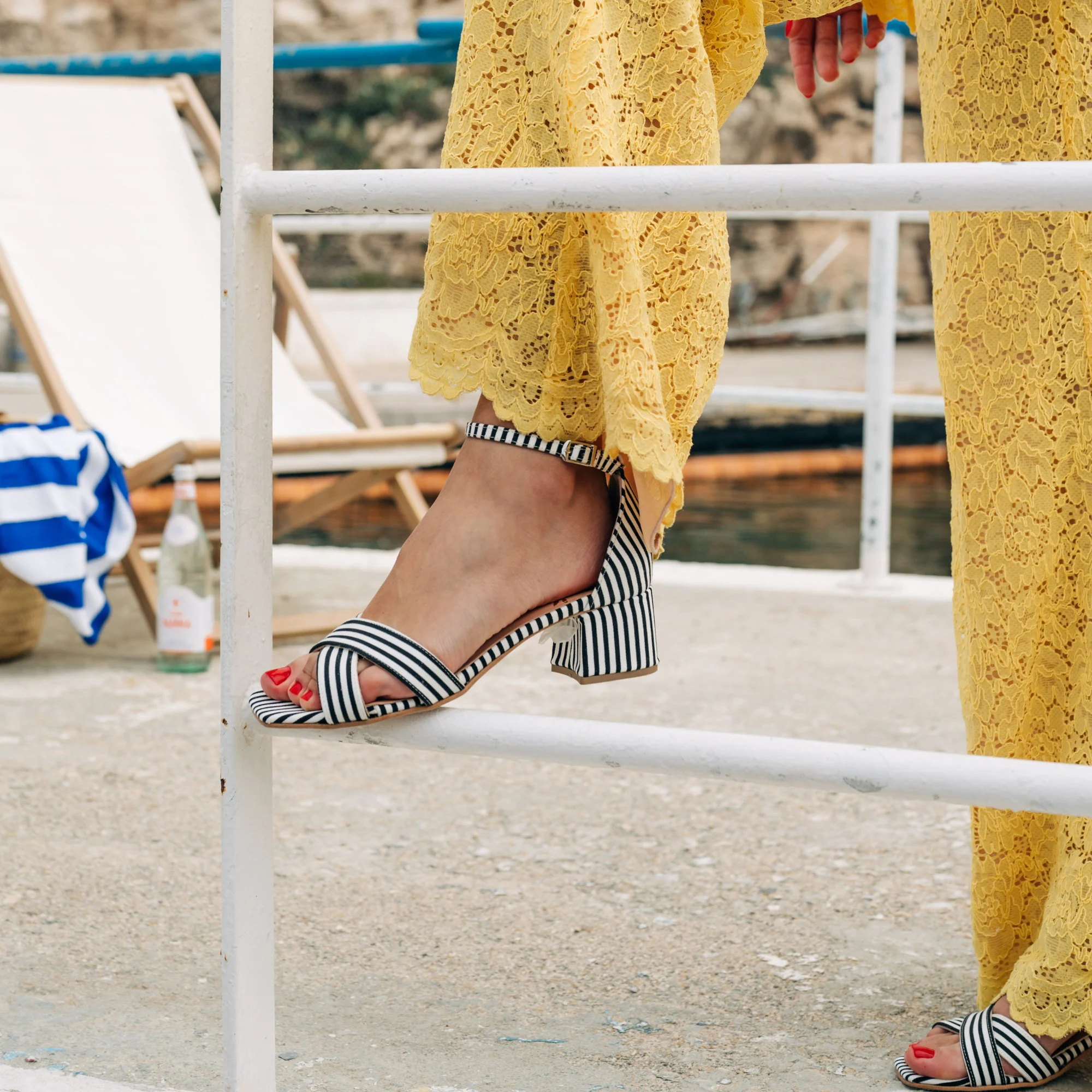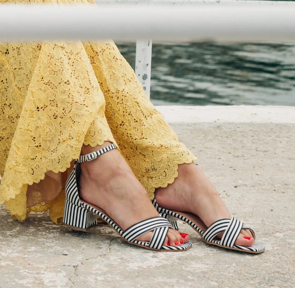 These sandals feature a refreshing crisscross strap design with classic black and white stripes, creating a relaxed and comfortable summer look. The slim, adjustable ankle strap ensures a comfortable fit, while the soft square peep toe and comfortable low block heel allow for light and easy strides, making them perfect for strolling through the market or enjoying a sunset dinner.