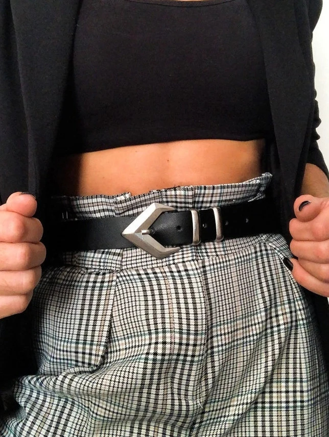 Cool Arrow-Shaped Silver Buckle: This geometric silver buckle is an absolute visual focal point. Its sharp arrowhead silhouette breaks the monotony of conventional belt buckles, embodying the casual, uninhibited spirit of vintage Americana with a modern, cool geometric design. It injects a unique spirit into any black belt, instantly transforming a basic outfit (like plaid pants and a crop top) into a statement-making, eye-catching look, elevating it from a practical accessory to a style icon.