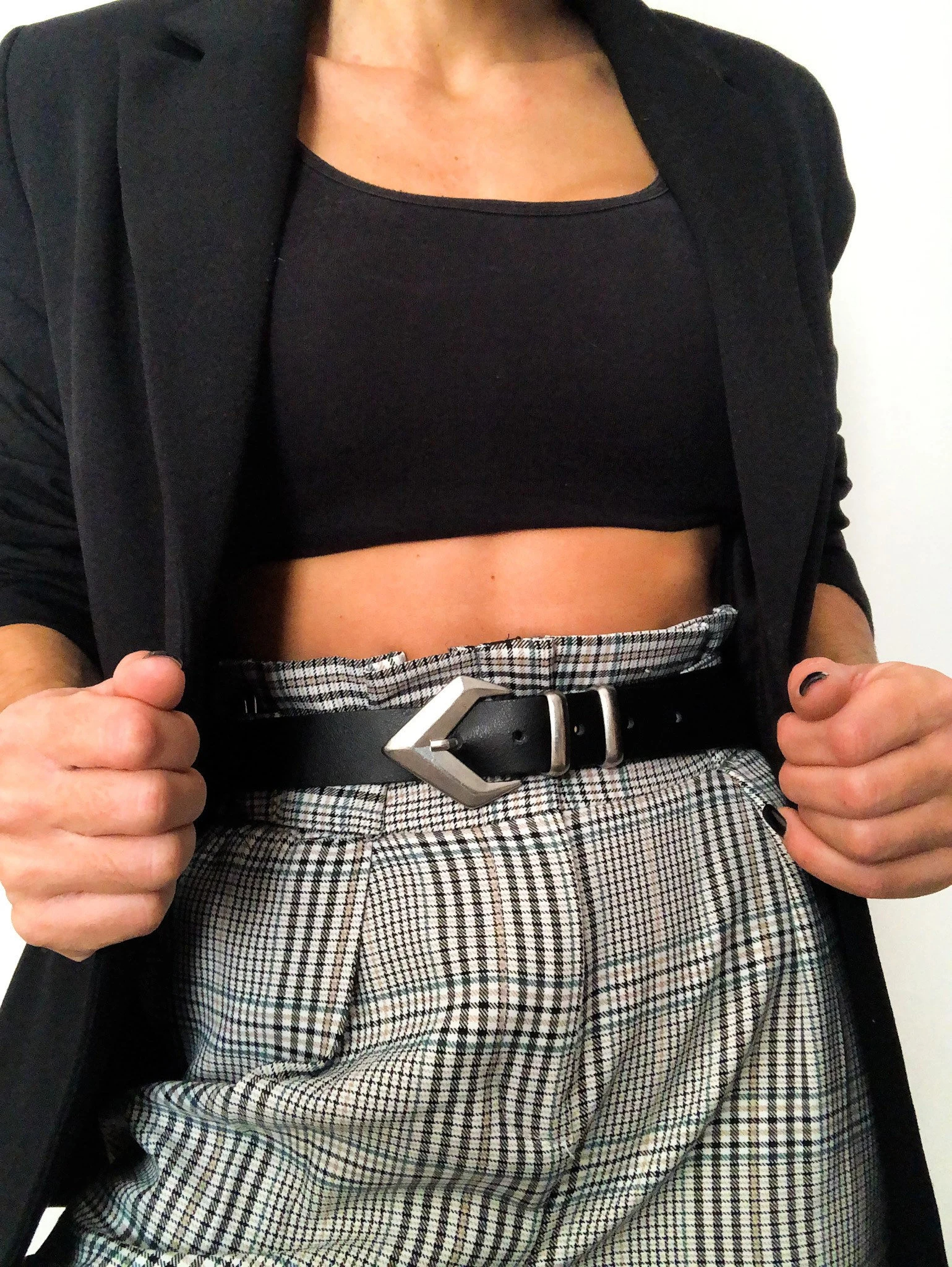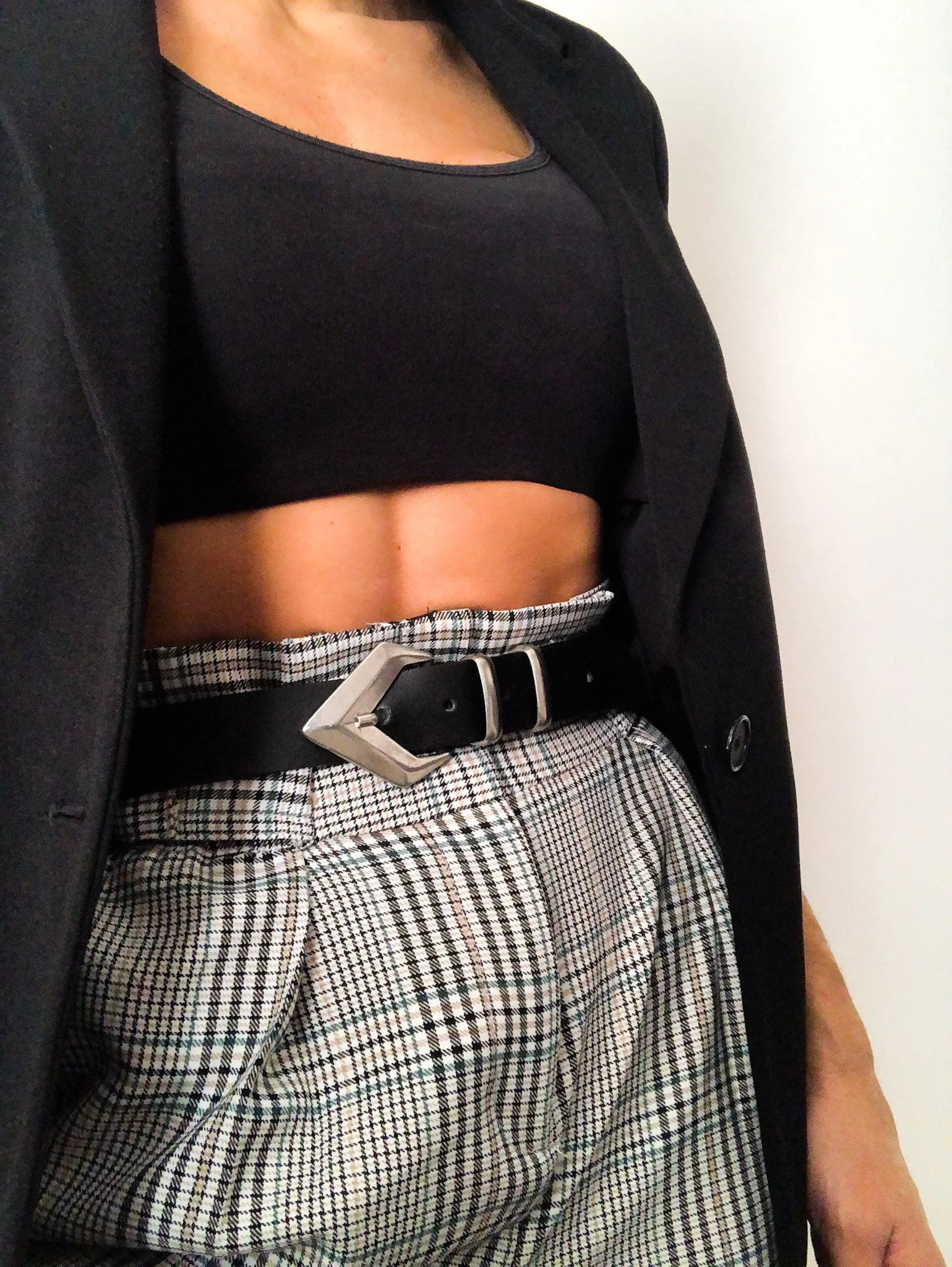 Retro-cool style: Paired with plaid pants and a crop top (as shown), a black belt neatly cinches the waistline, and the silver arrowhead buckle complements the retro feel of the plaid, instantly creating a casual yet stylish retro-cool vibe. It’s sure to turn heads whether you’re out and about or at a coffee shop.