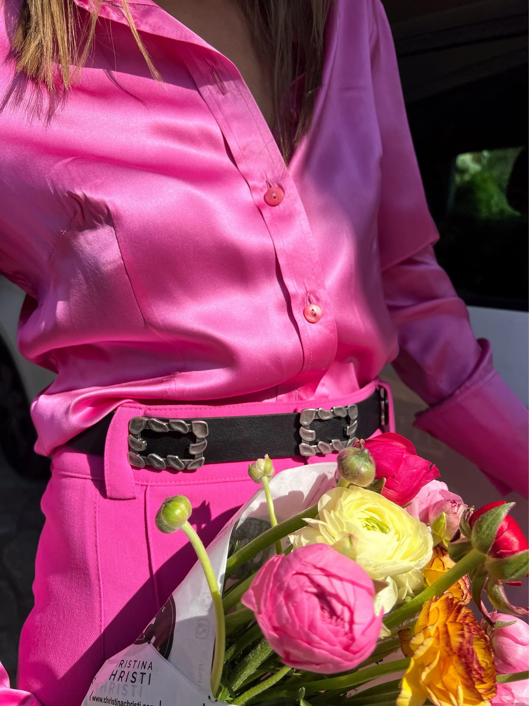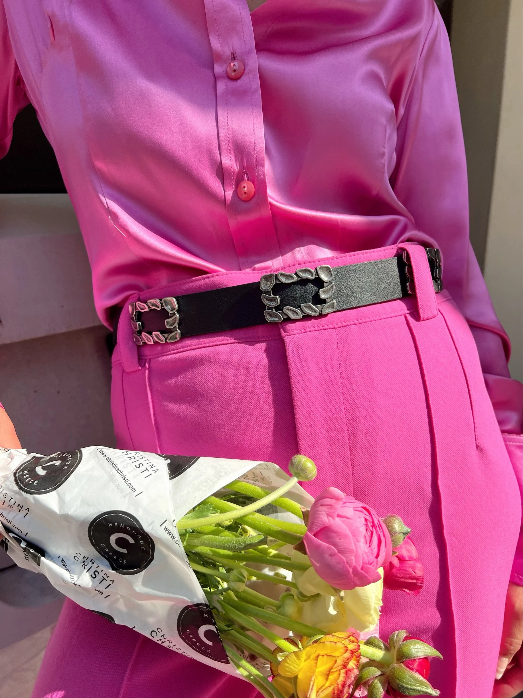 Perfectly matched widths for a balanced color palette: The belt’s moderate width neatly cinches the waistline (as seen with a bright pink outfit, it easily defines body proportions, making a vibrant color look more streamlined and polished), yet doesn’t overshadow the outfit, creating the perfect balance for a colorful outfit.