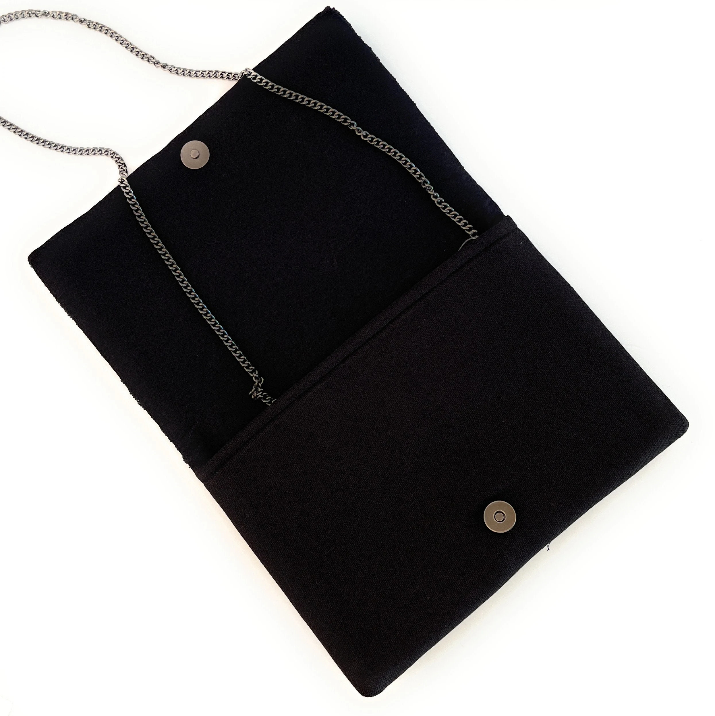 The silver metal chain shoulder strap, treated with multiple layers of anti-oxidation for a long-lasting shine, allows for flexible switching between a clutch and a mini crossbody. The flap design features a hidden pocket for convenient access and secure storage.