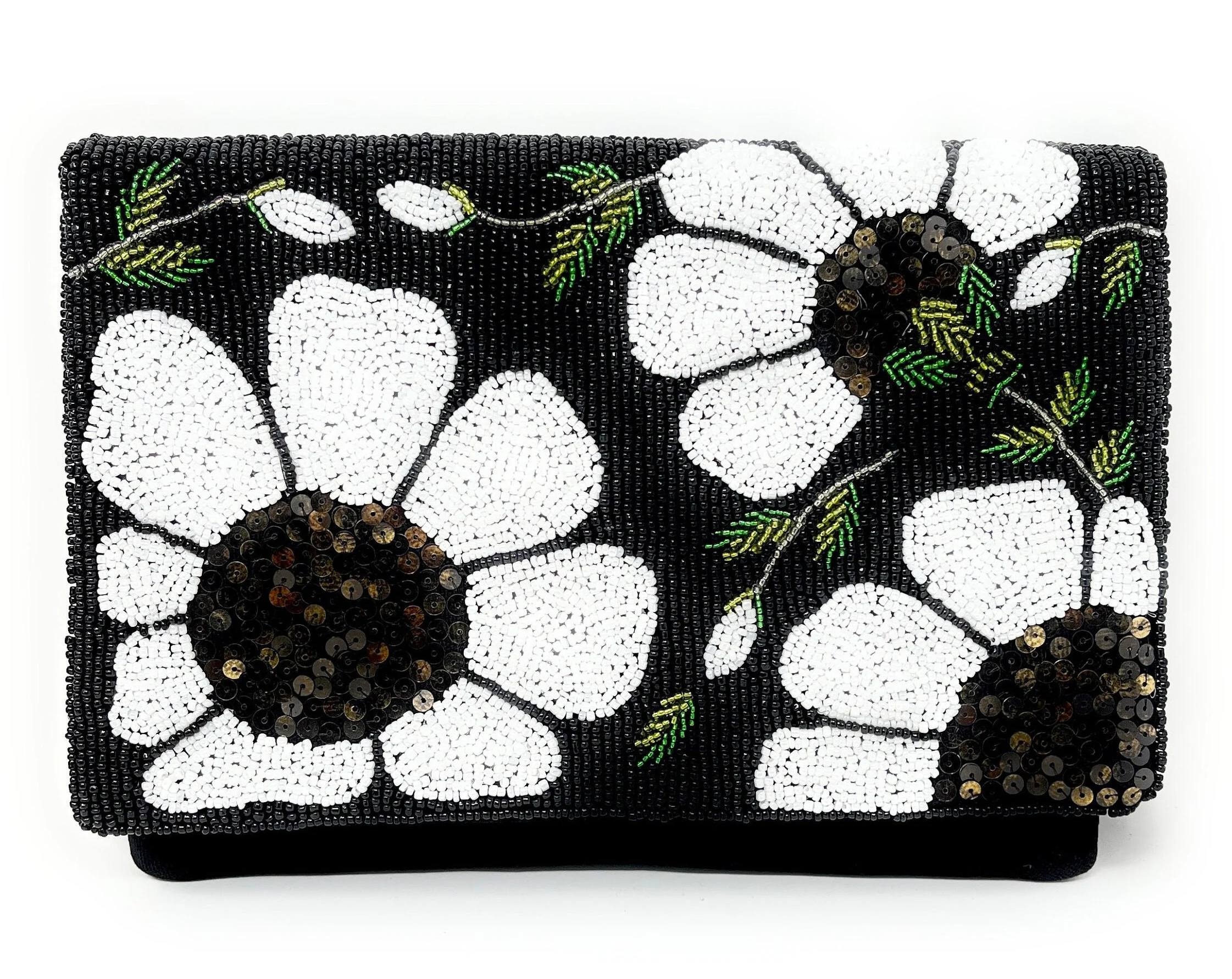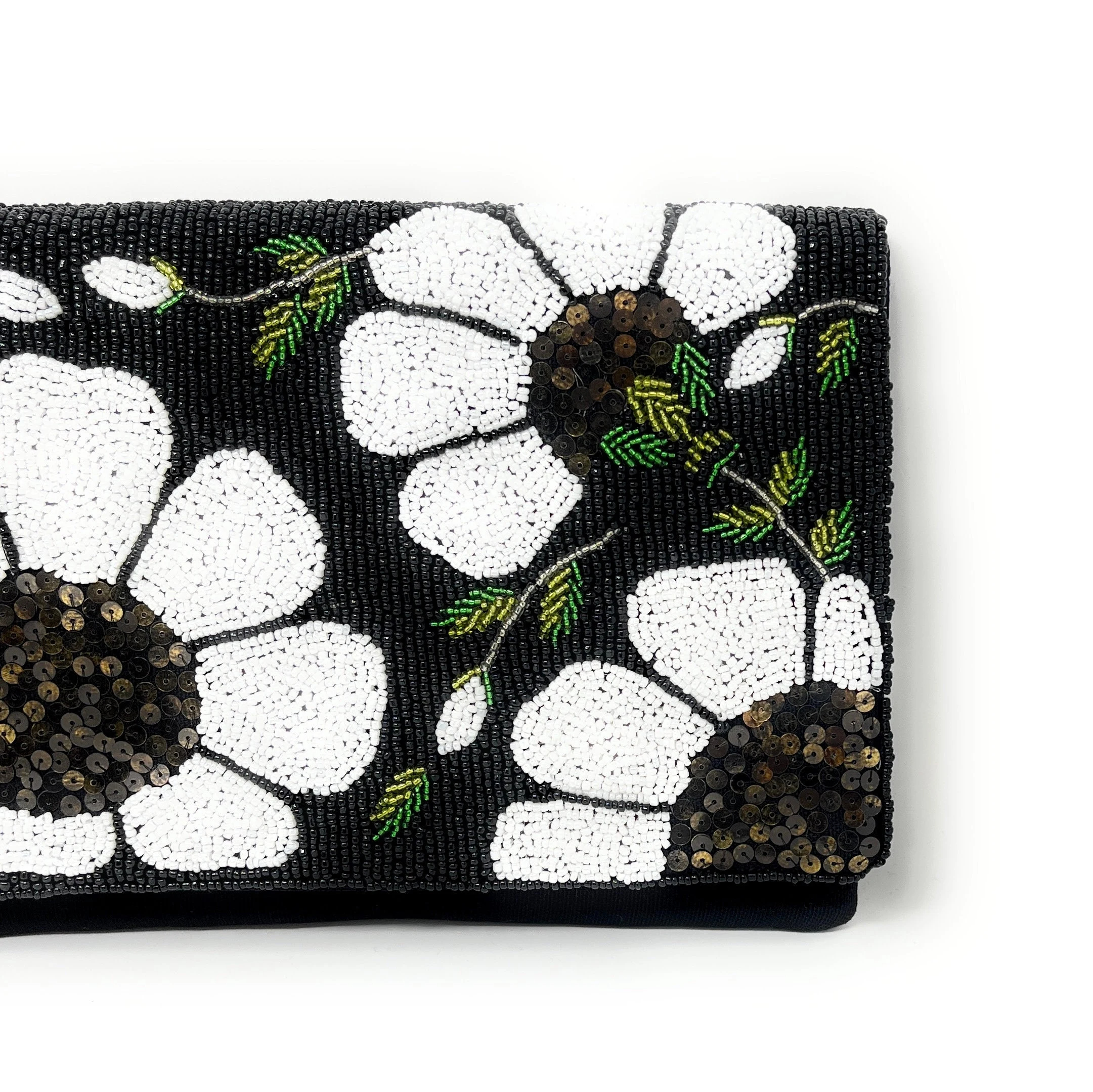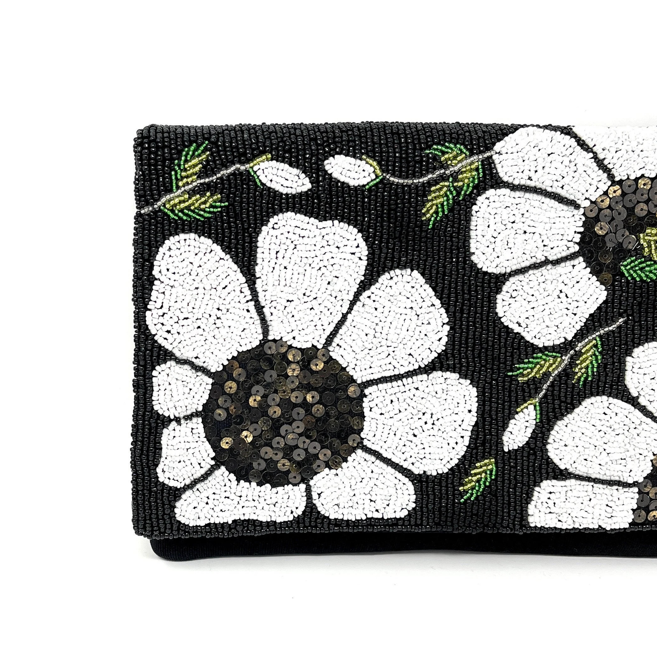 Beading and Sequins: Selected high-gloss black and white glass beads are hand-woven one by one to create the petal texture, creating distinct layers of white beaded flowers. The center of the flower is inlaid with metallic sequins, which shimmer brilliantly under the light, simulating the vibrant details of a flower’s pistil.