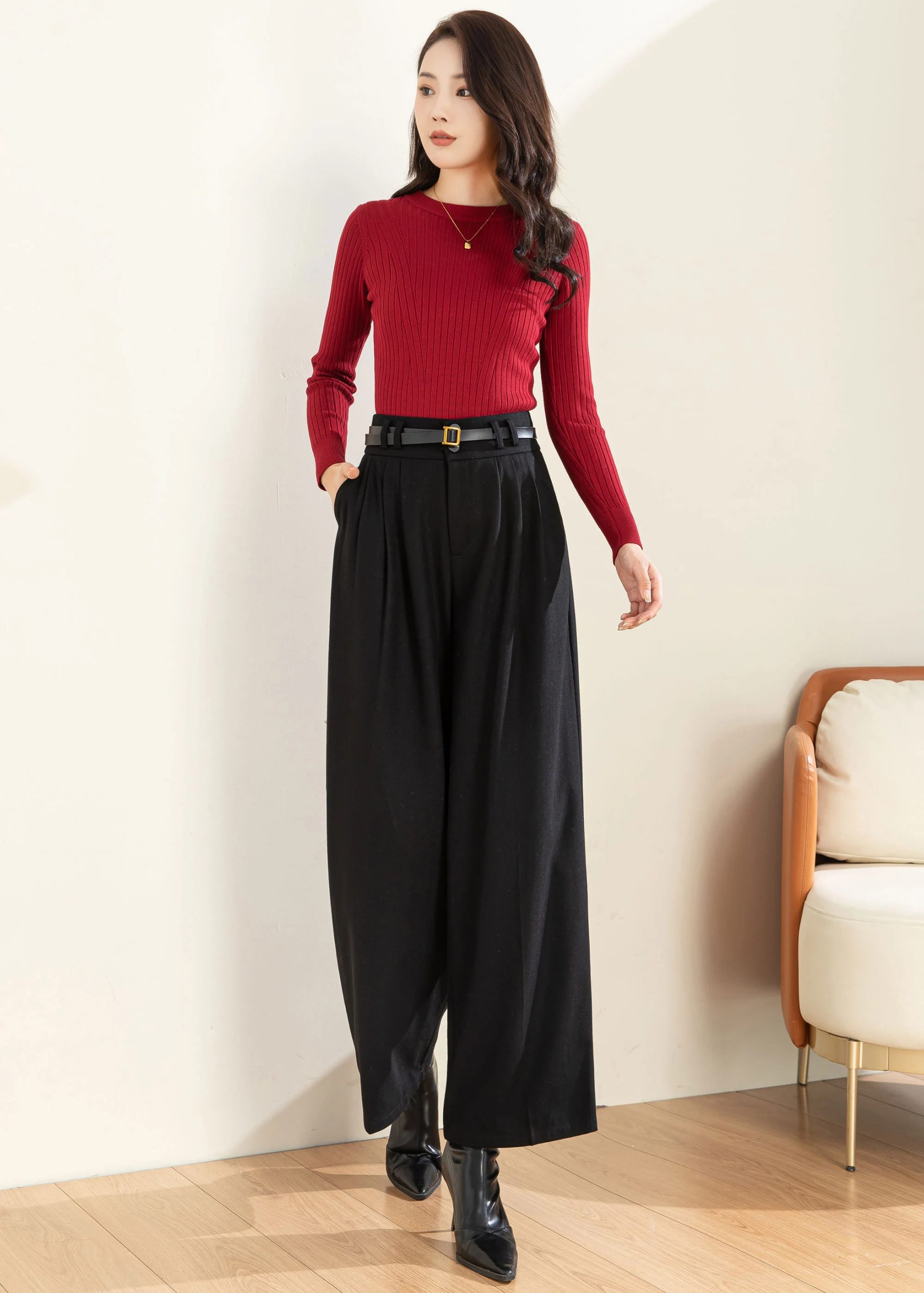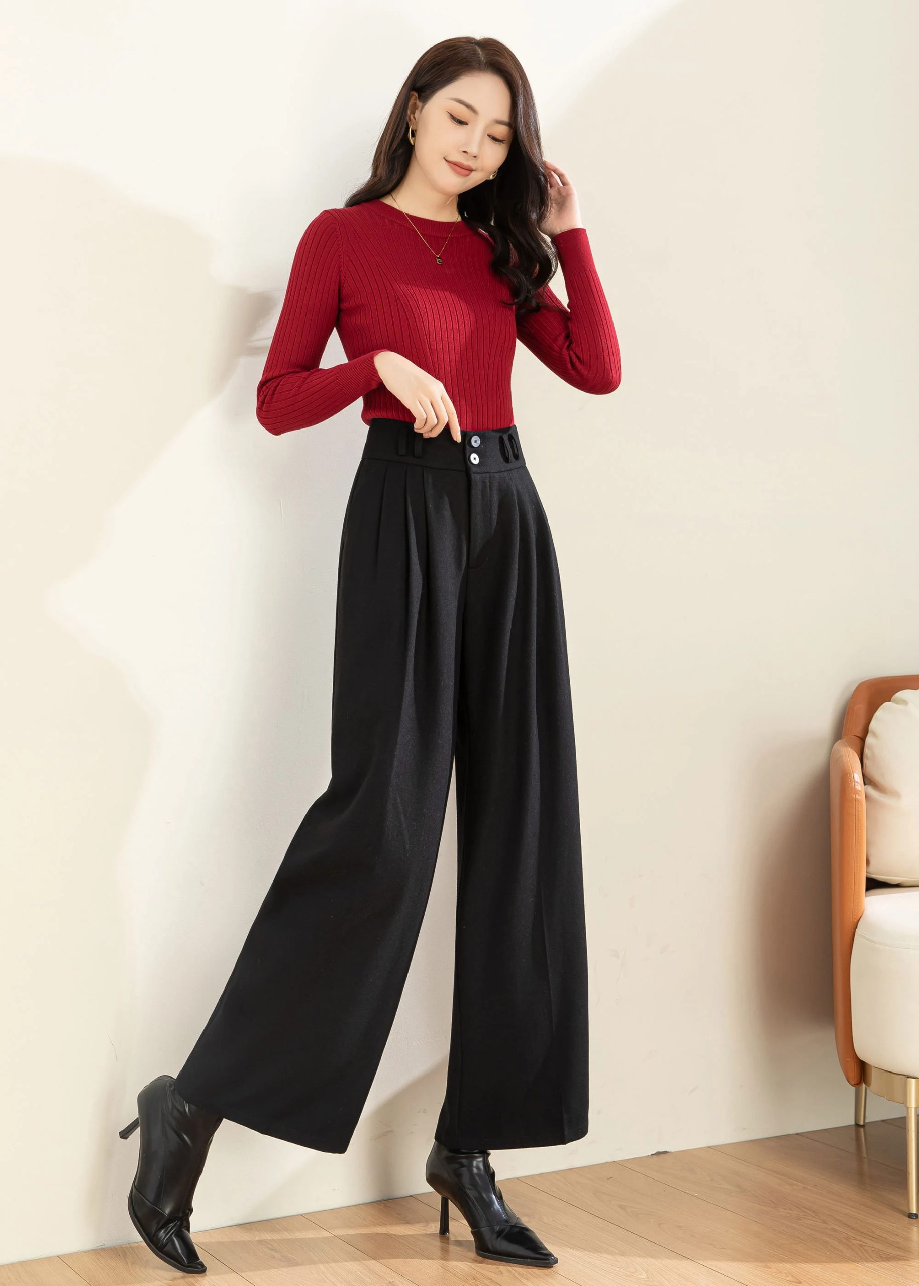 Wide-leg cut from thigh to hem flatters the leg shape and enhances elegance.