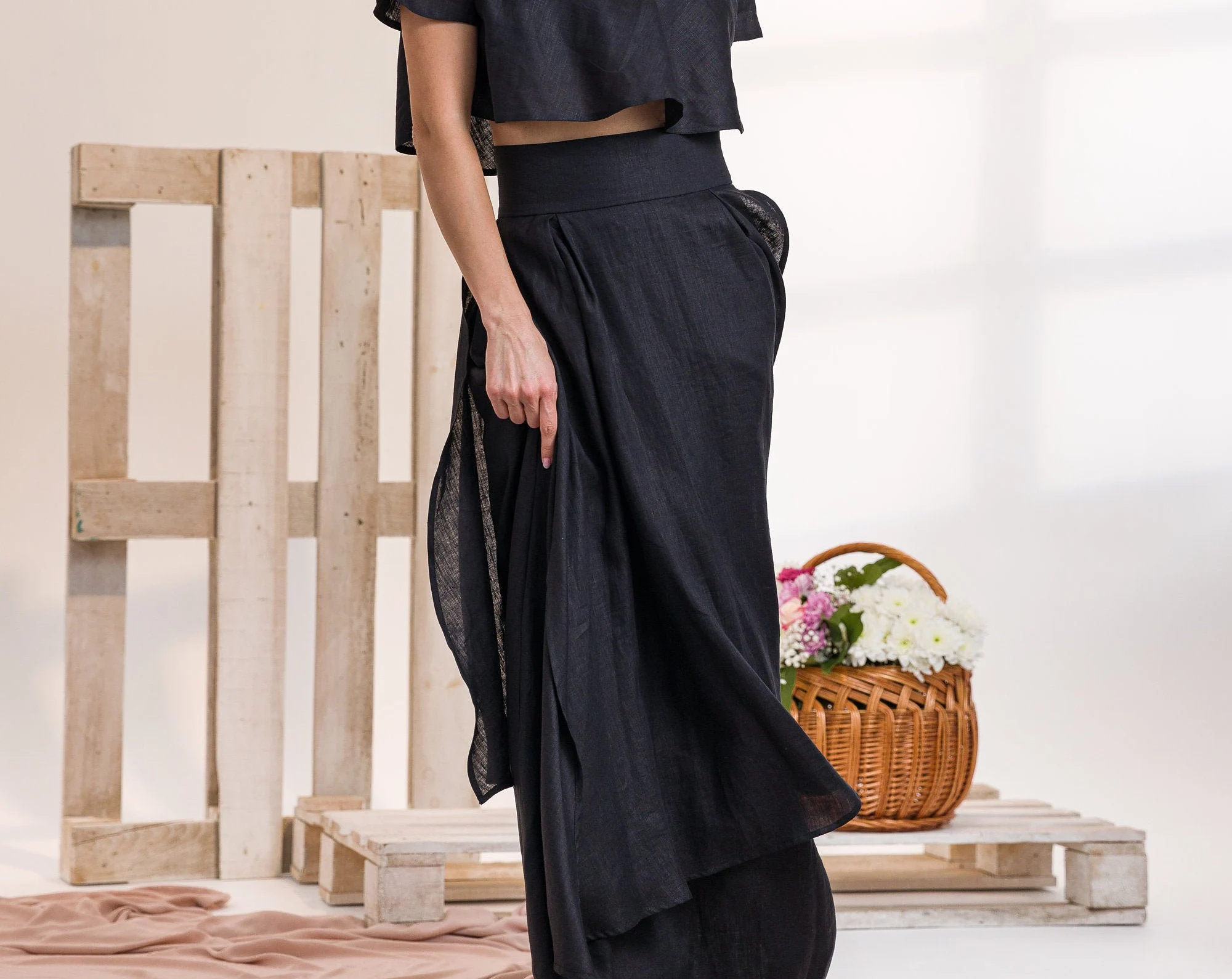 This black tiered linen maxi skirt is refined yet free-spirited, capturing the essence of effortless artistry. The cascading layers and soft texture create a graceful movement with every step, creating a look that’s both modern and timeless.
