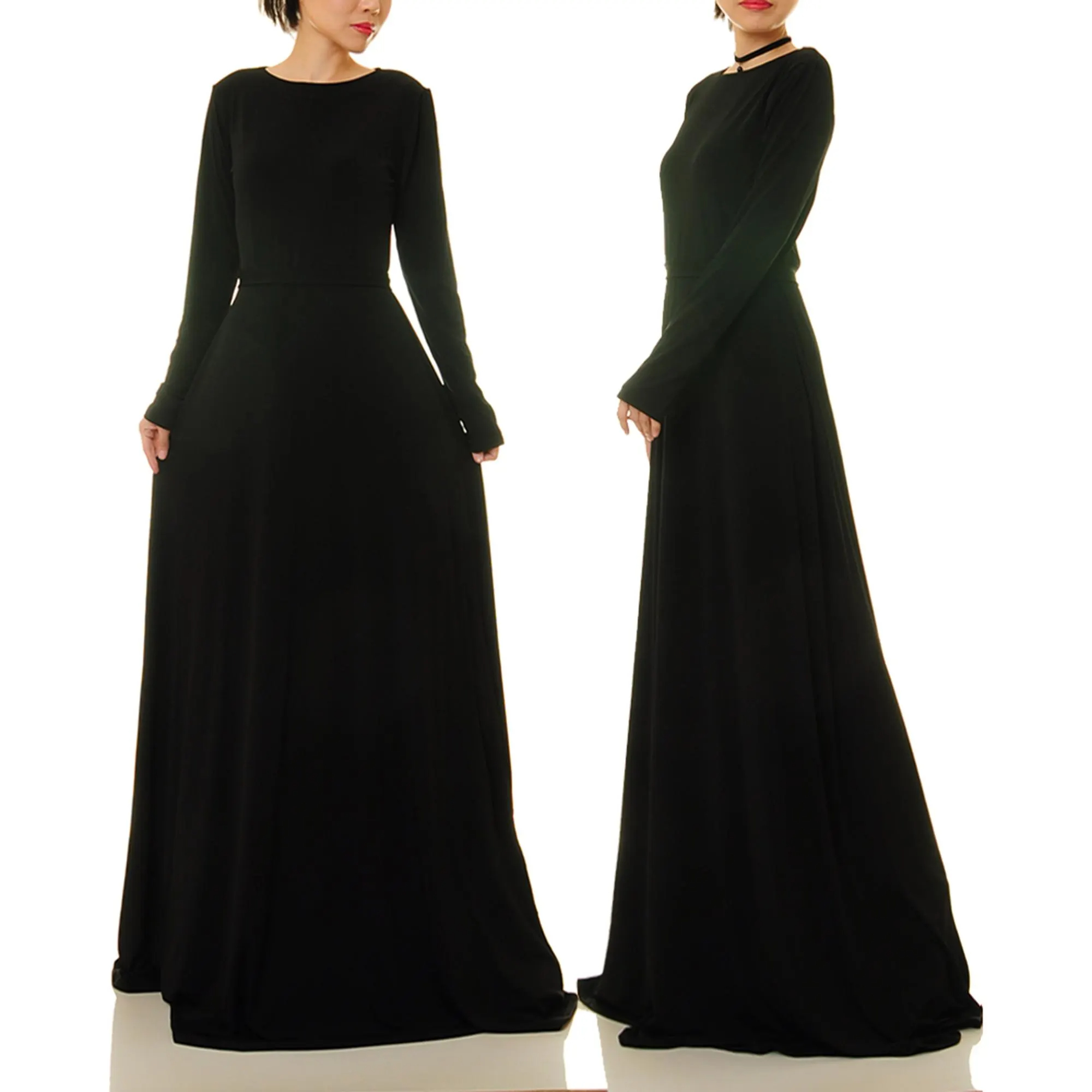 Minimalism meets fashion. This black maxi dress features a clean boat neckline and long sleeves. The fitted bodice and flowing hem create an effortless, graceful look that’s effortless and effortless, perfect for both on the go and in front of the camera. Pair it with simple flats and a trench coat, or add heels, a clutch, and sparkling jewelry for a more elegant look.