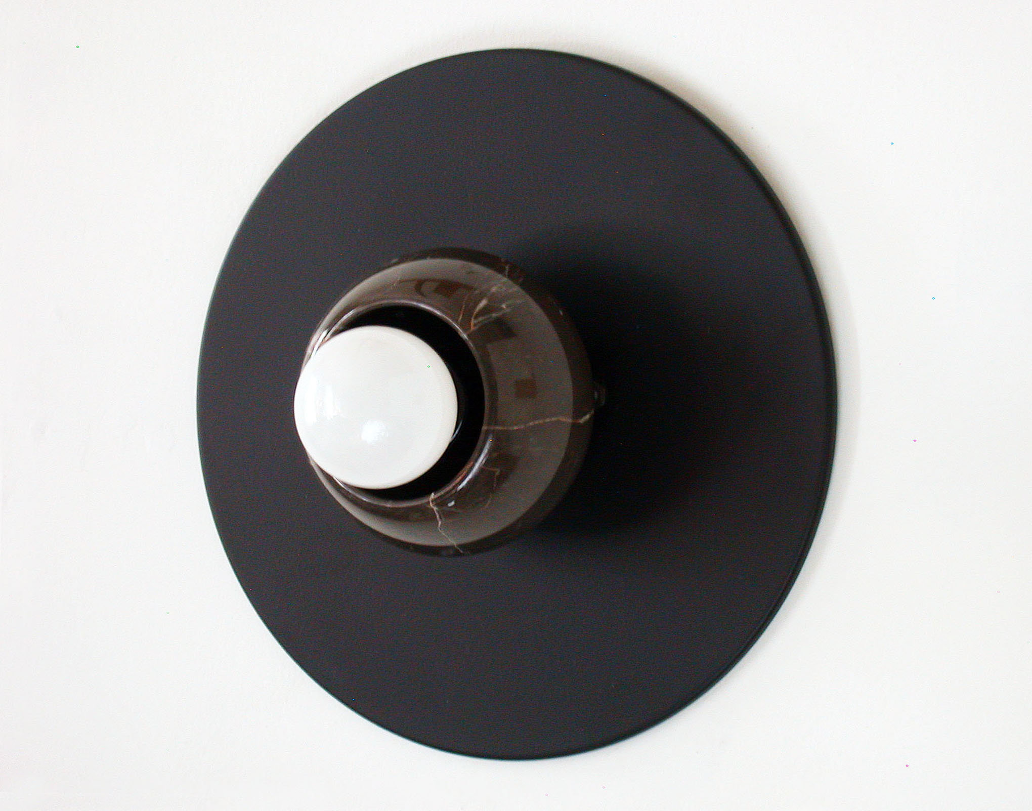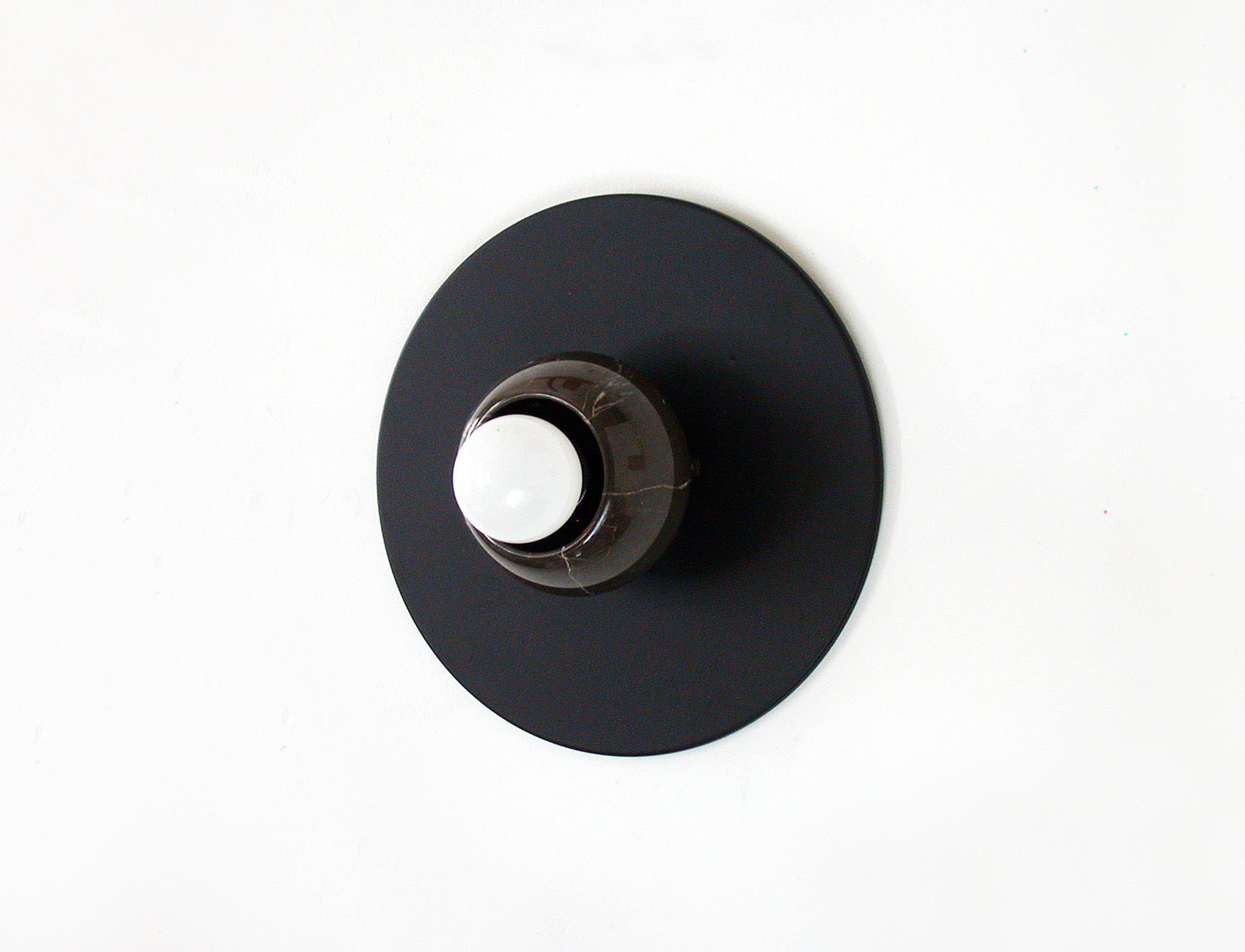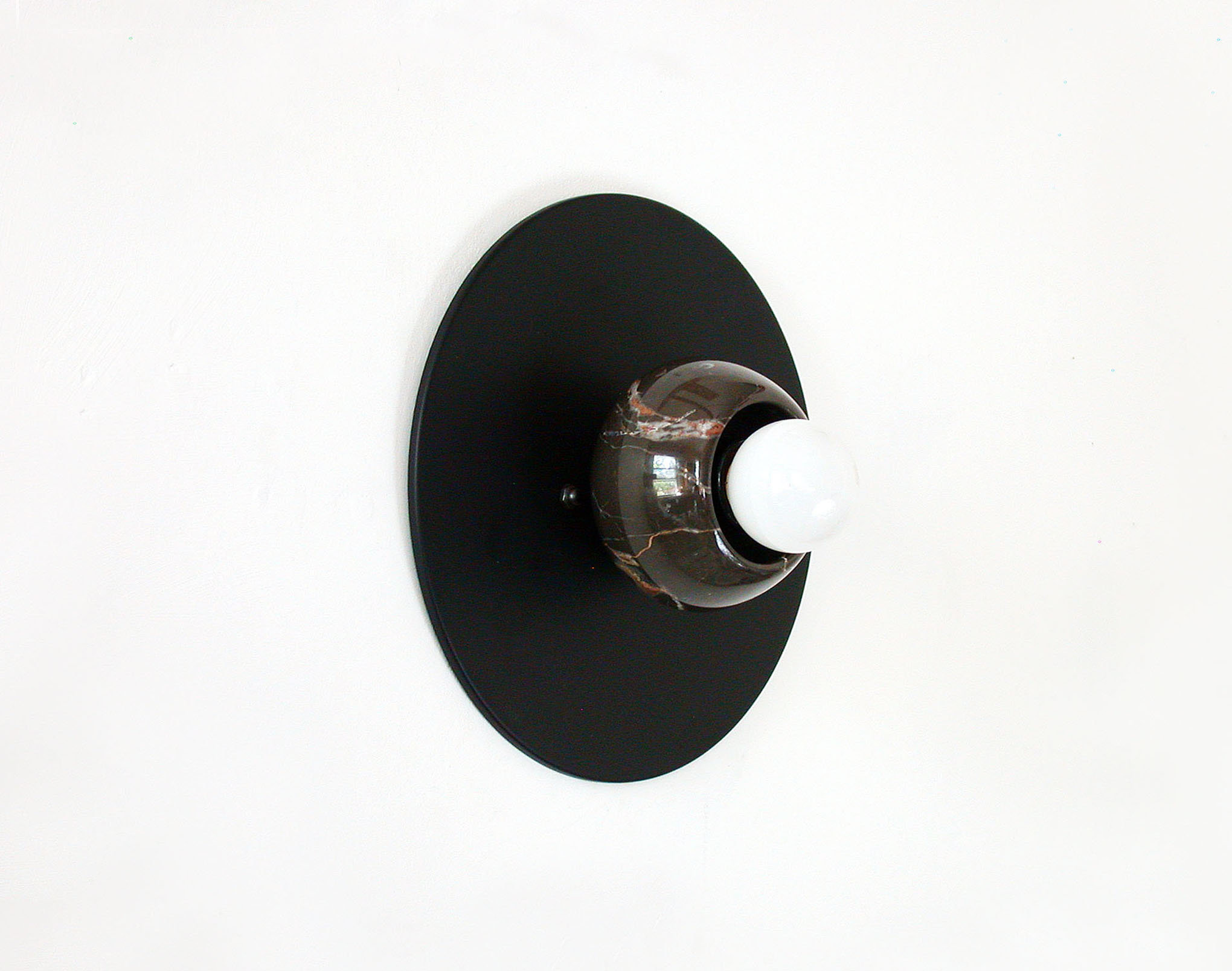 — A matte black circular backplate paired with a sculptural dark marble cup and opal bulb creates a soft, glare-free, diffused effect.