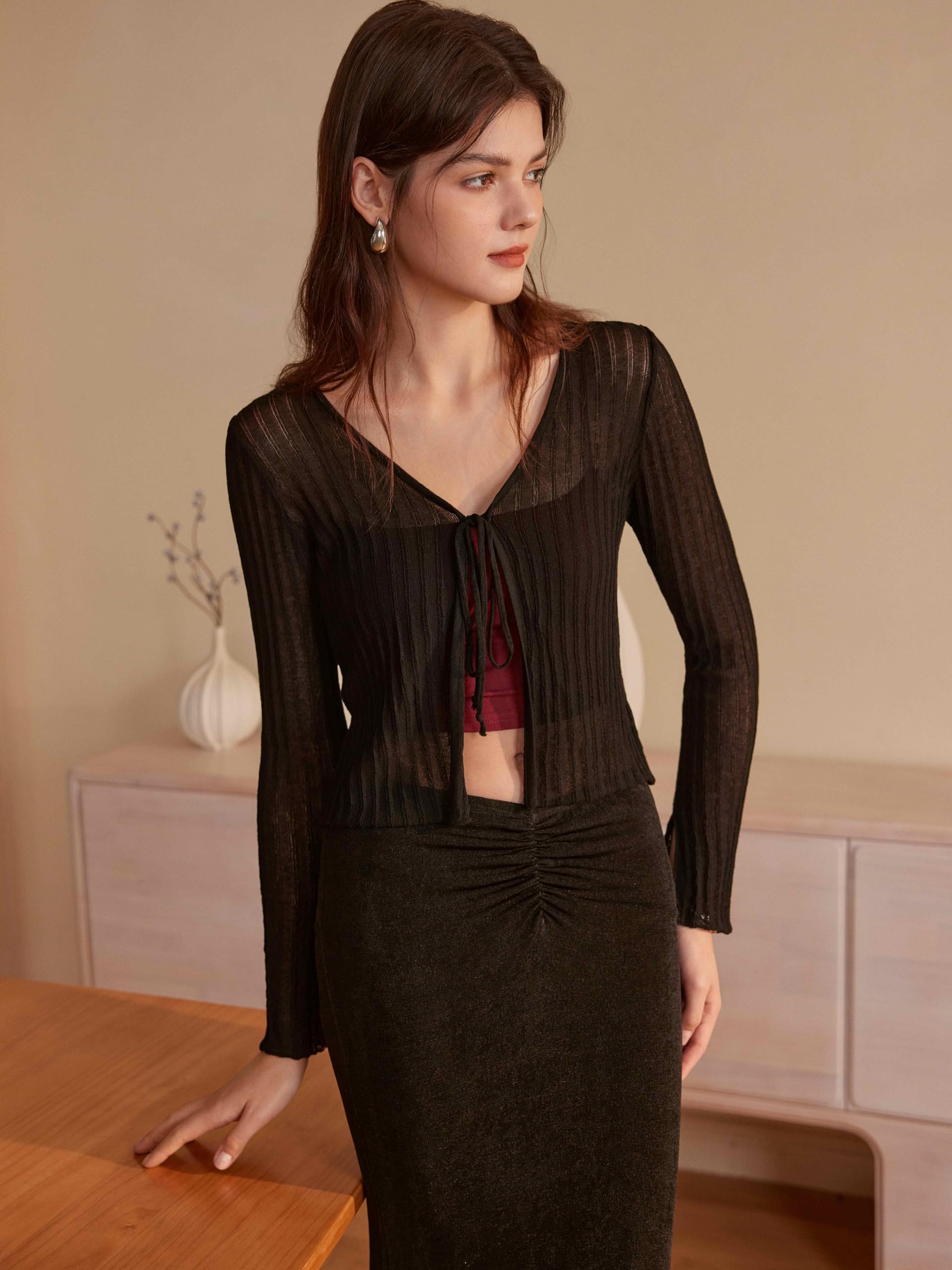 V-neck with tie closure—adjustable, sophisticated and elegant; perfect for layering.