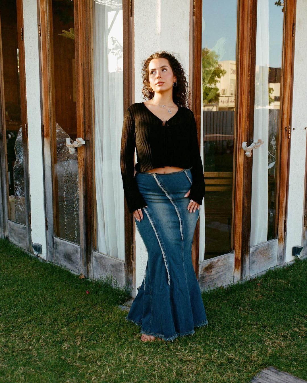 Slim-fit, slightly flared silhouette—definitively defines the waistline, highlighting feminine curves.