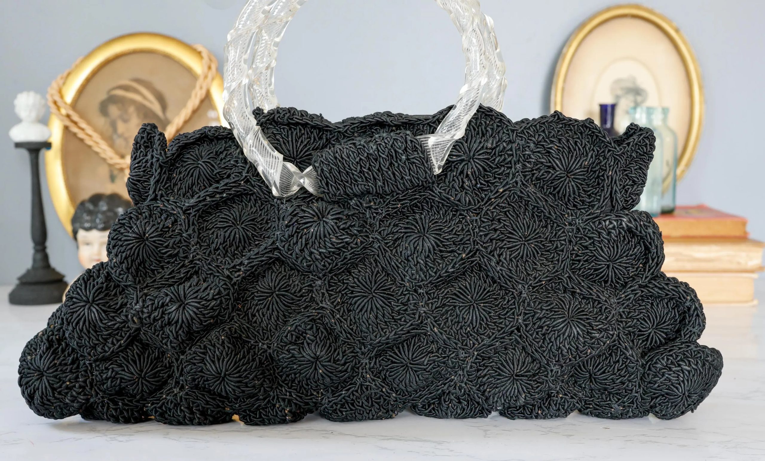 3D Floral Embodies and Acrylic Handle: The bag features handcrafted 3D floral embellishments, each meticulously crafted by artisans, resulting in a rich, three-dimensional texture and a rich, vintage-inspired aesthetic. The black base is classic and durable, offering a durable and wear-resistant finish. The transparent acrylic handle, with its translucent material and exquisite texture, exudes a luxurious, mid-century charm. The metal fasteners on the handles are expertly crafted for durability, showcasing the craftsmanship of vintage craftsmanship.