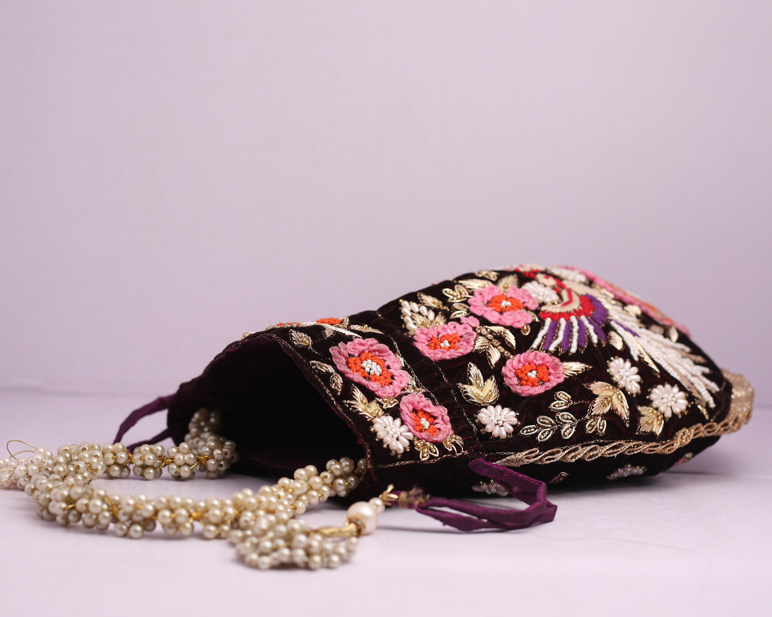 This striking Potli bag is crafted from jet-black velvet, embellished with vibrant floral patterns in shades of rose, coral, blush, and ivory, and accented with gold foil and shimmering feather motifs. It features cluster-beaded handles and a pearl-tasseled drawstring for a shimmering finish.