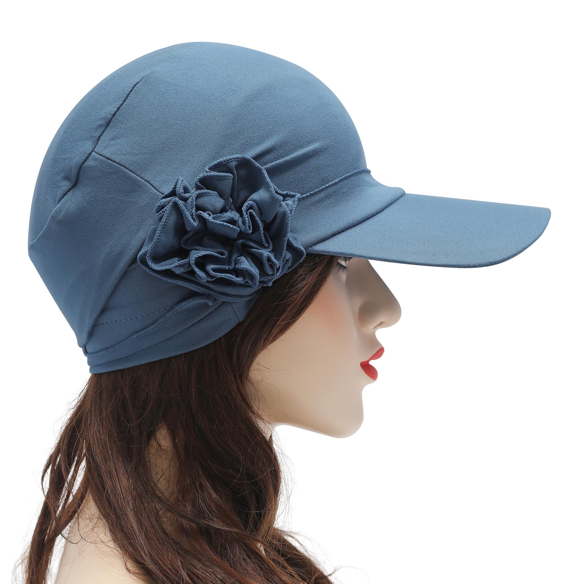 This blue sun hat is soft, elegant, and practical, combining sporty comfort with a romantic touch. The slightly curved brim provides sun protection, and one side is adorned with layered fabric petals forming a delicate flower.
