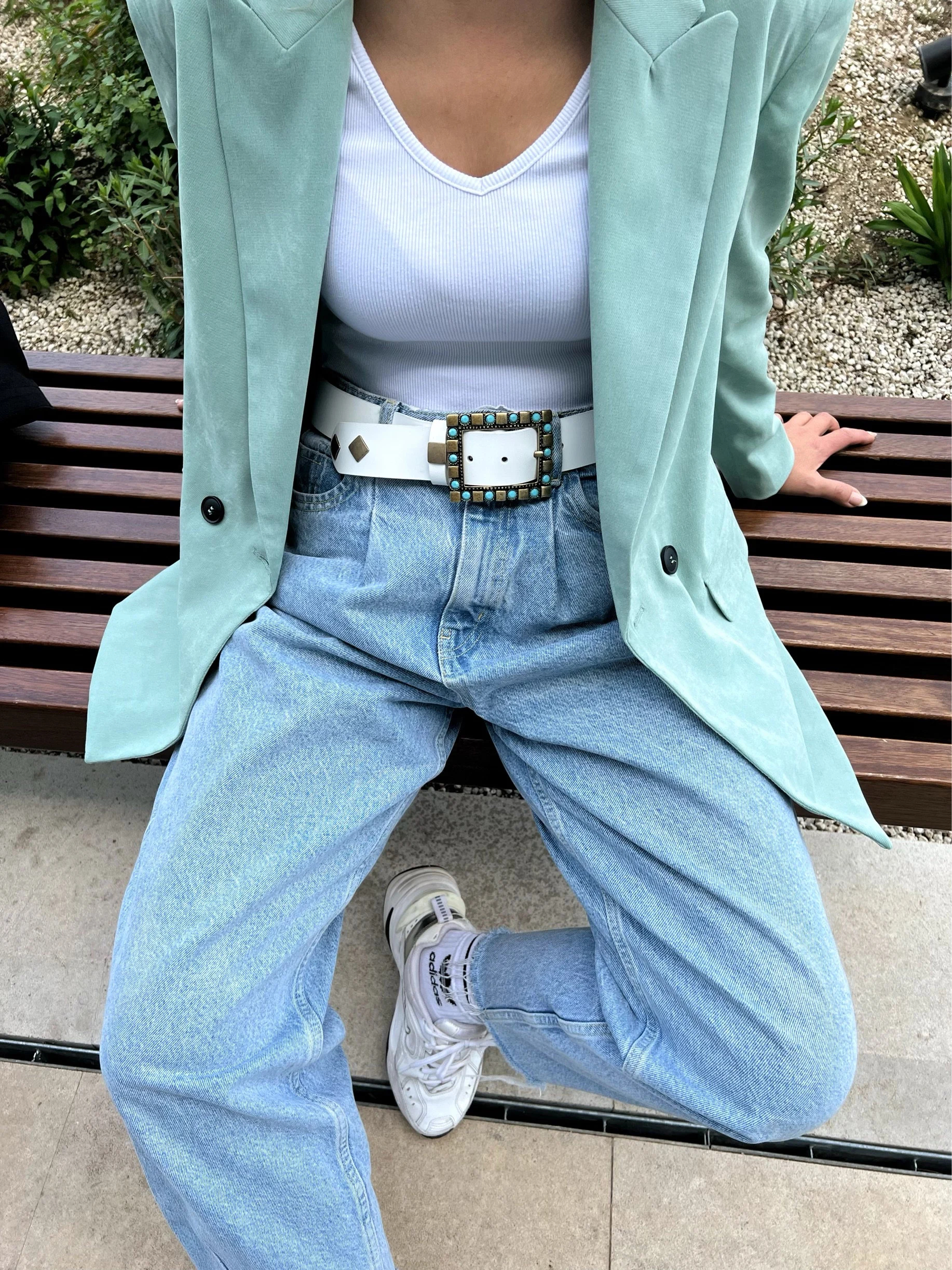 White x Colored Stone x Retro Gold: A refreshing and retro clash: The white belt is refreshingly versatile and perfectly balances colorful outfits (as seen with denim and a teal top, it instantly brightens the look). The square colored stone buckle is the focal point, while the teal stones add a bohemian romance. The retro metal frame adds a tough detail, elevating the belt from a “basic accessory” to a “styling centerpiece,” adding a fresh and retro touch to any outfit, including denim and brightly colored pieces.