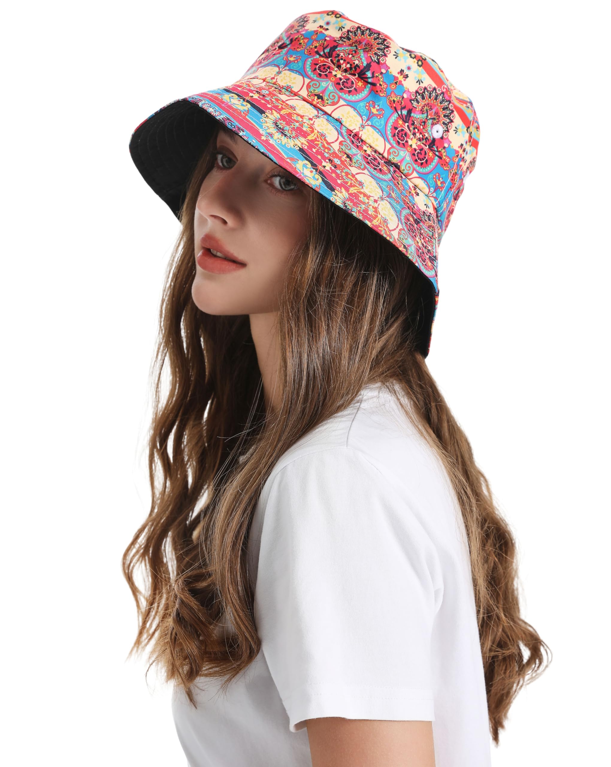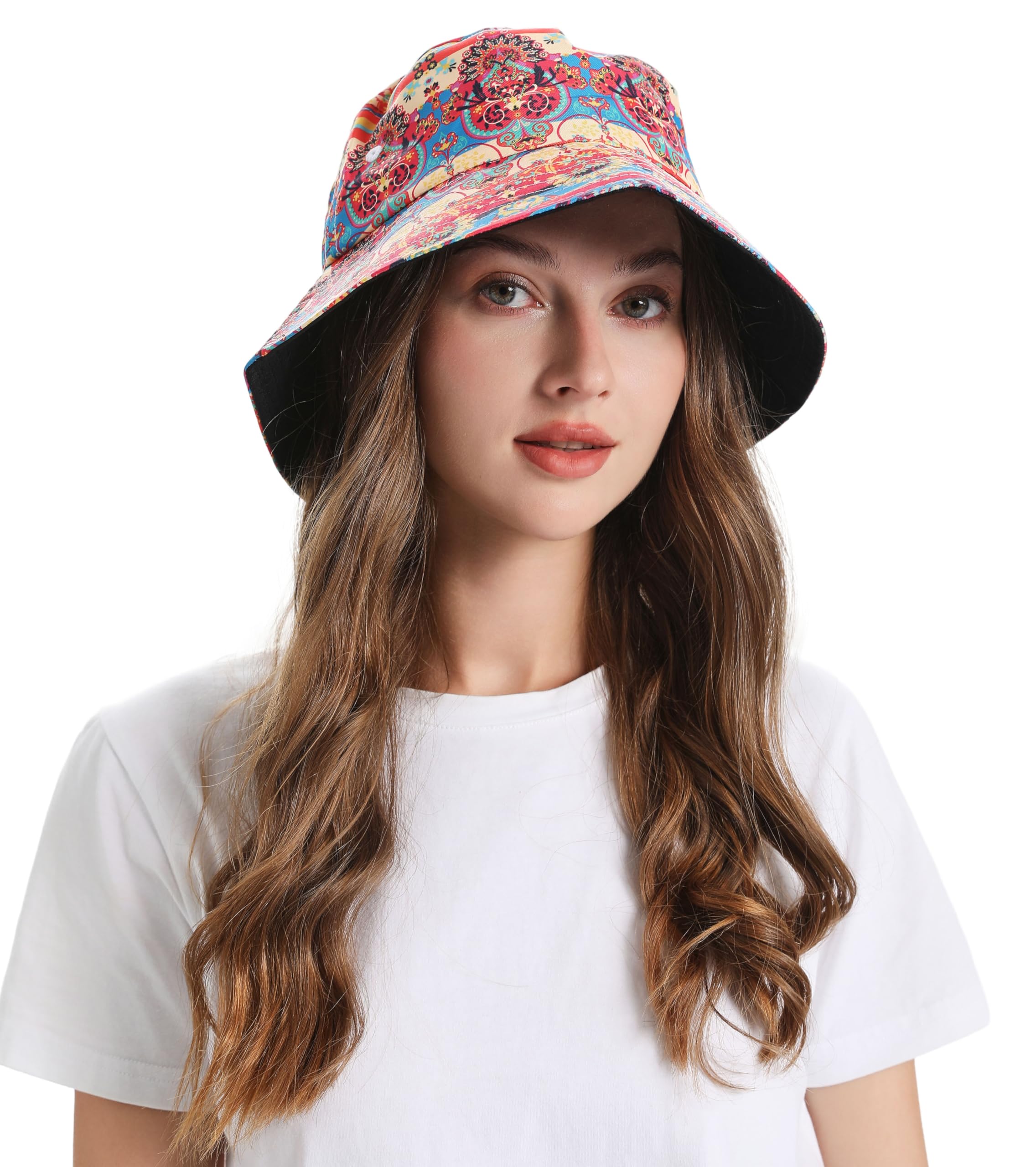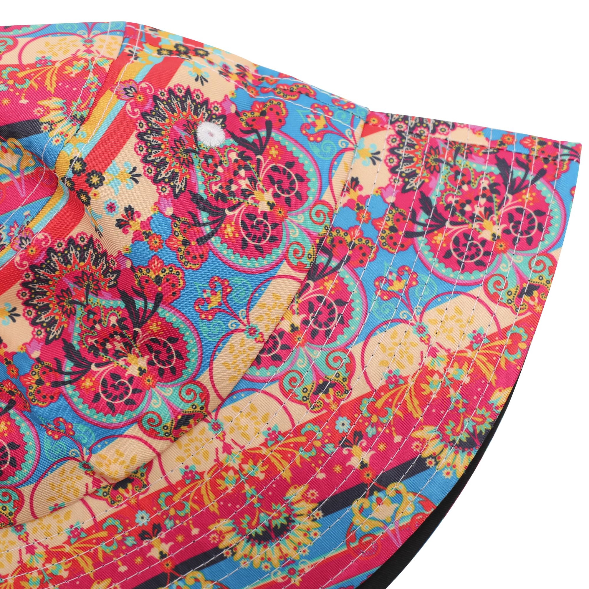 This bucket hat features an intricate and vibrant print in pink, turquoise, yellow, and blue, making it ideal for music festivals. Decorative patterns, floral motifs, and adorable elephant details surround the hat and brim, creating a richly layered bohemian style that will make you stand out from the crowd.