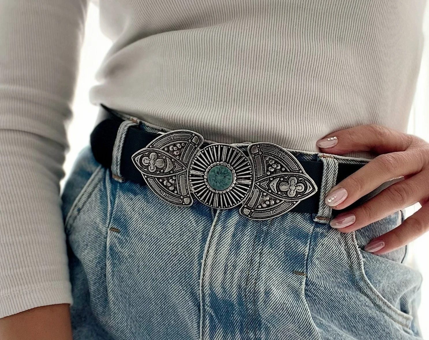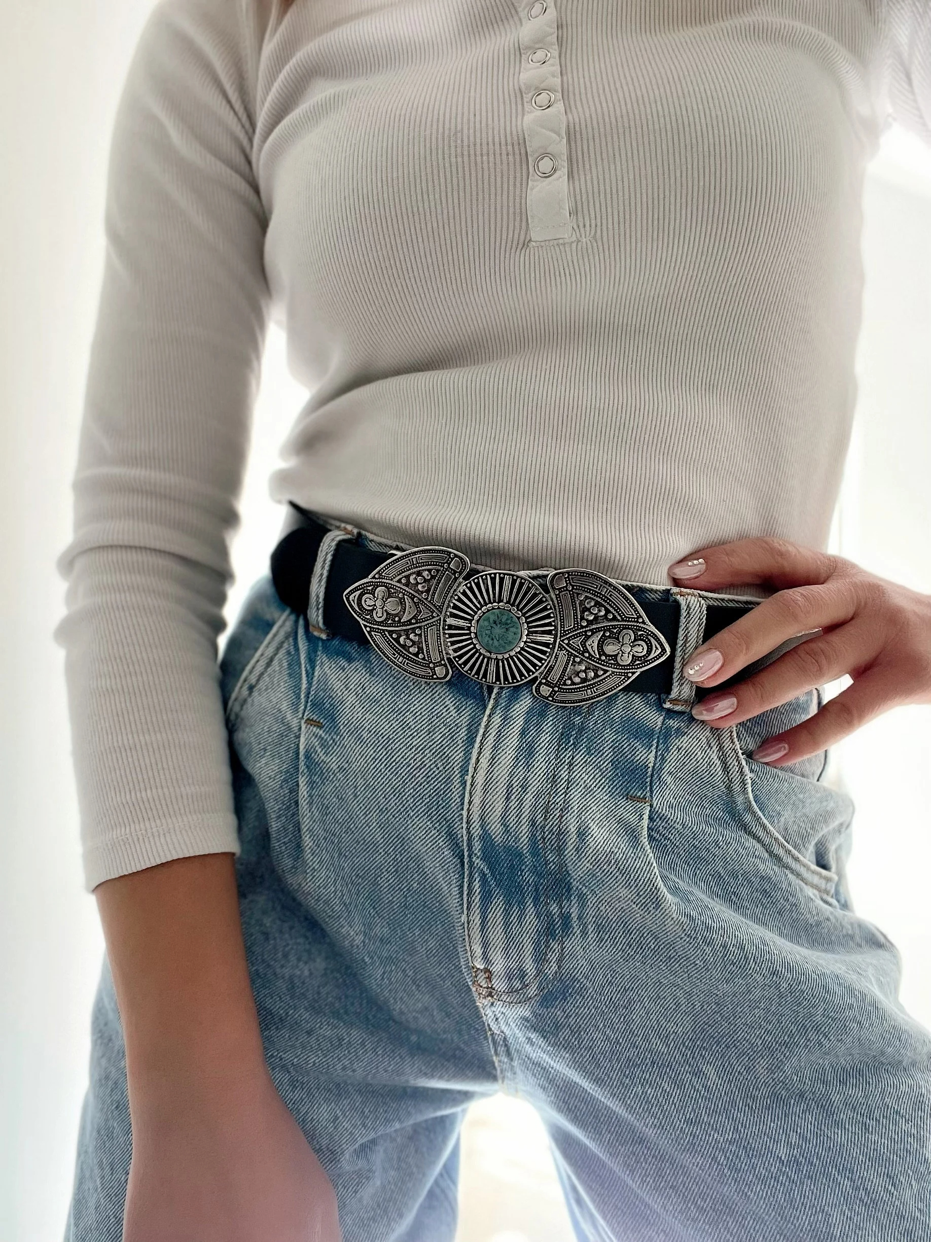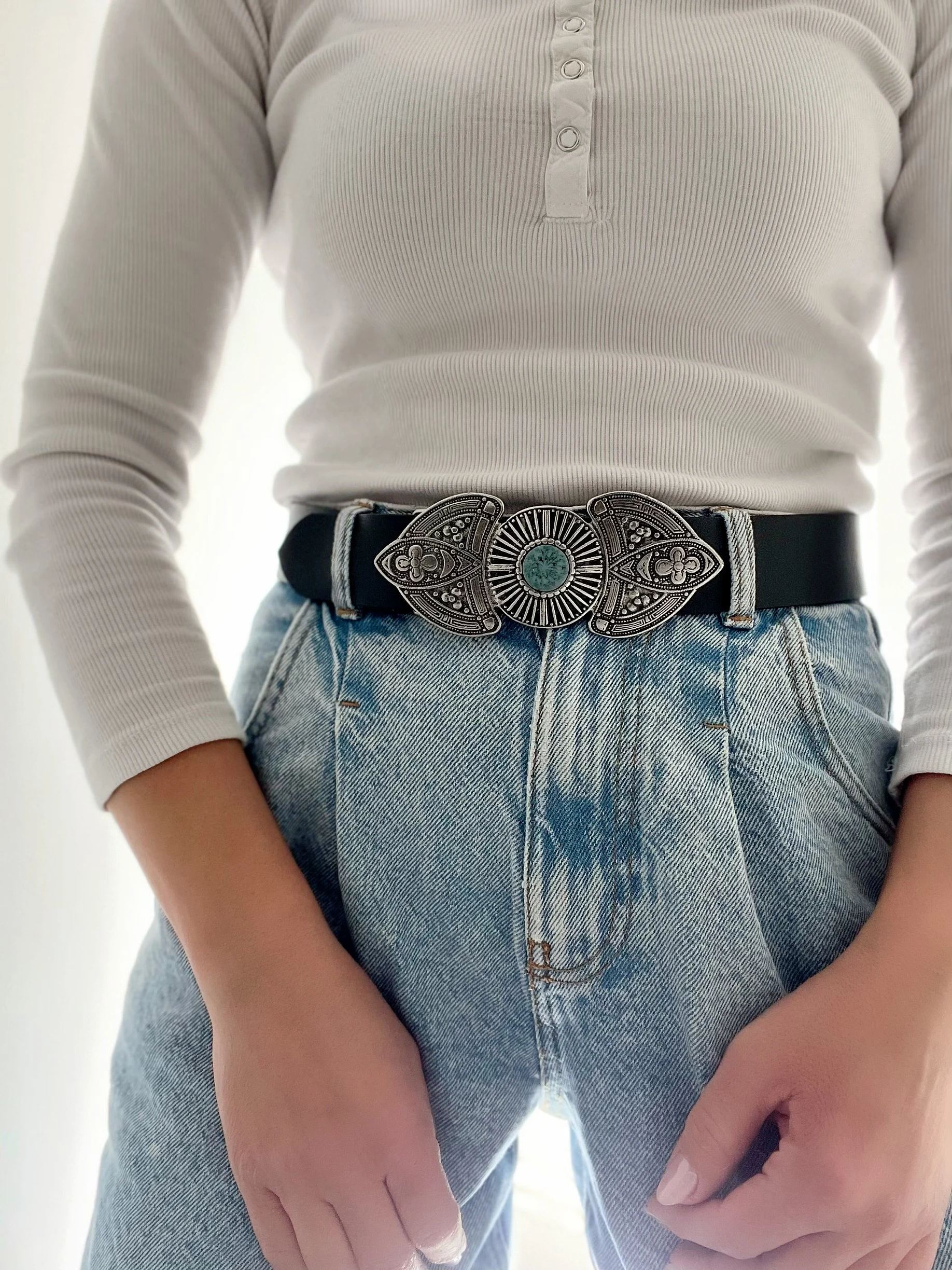 Retro carvings and turquoise accents embody a full-on ethnic vibe: This large, artistic buckle is the centerpiece. Its intricate relief pattern exudes a rich vintage aesthetic, while the turquoise centerpiece imbues it with a bohemian, free-spirited romance. The contrast with the black belt creates a dual aesthetic of “retro” and “ethnic,” elevating the belt from a practical accessory to a statement piece. It adds a storytelling touch to basic outfits like a white top and jeans (as shown), creating a unique retro style.