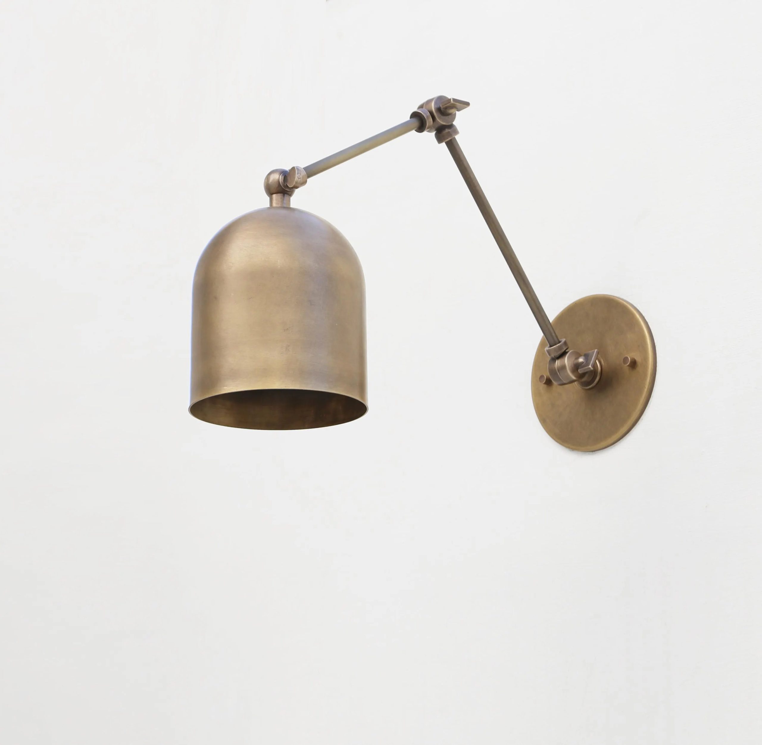 — An oval brass back panel with a two-point articulating arm supports a deep bell-shaped shade for focused, glare-free task lighting.