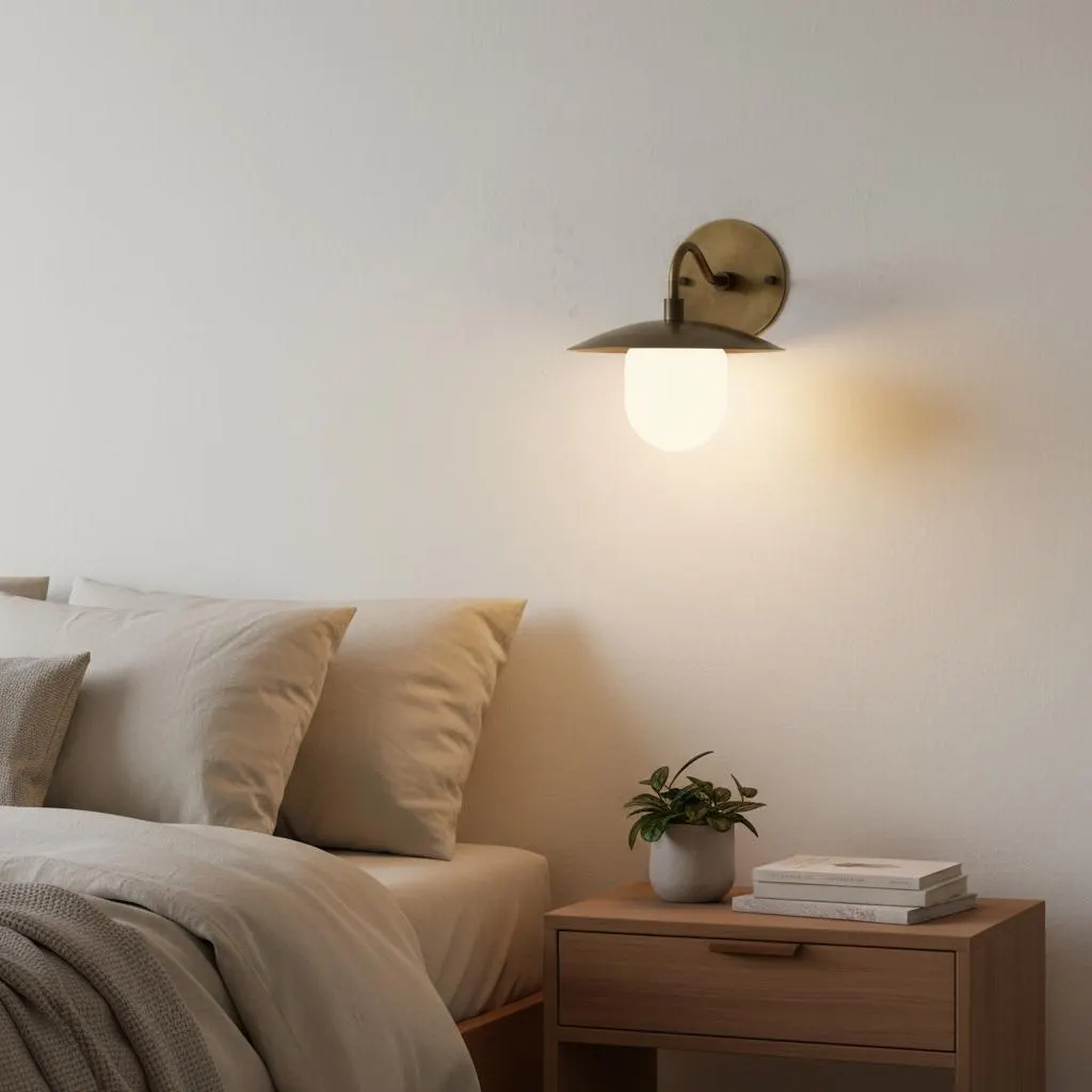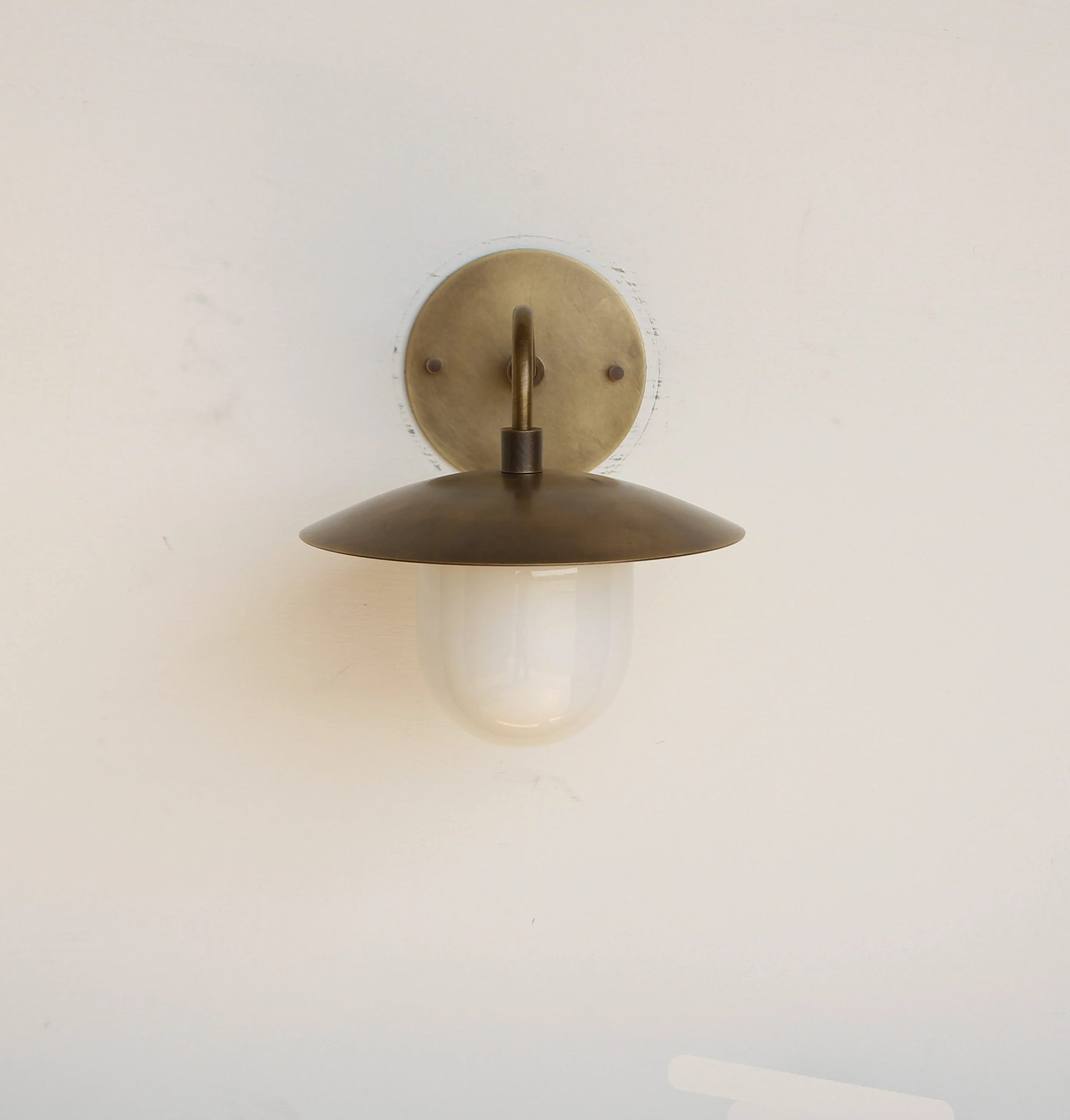 — A round brass back panel with an elegant gooseneck arm supports a discreet, disc-shaped shade and opal capsule diffuser, creating a soft, glare-free downlight.