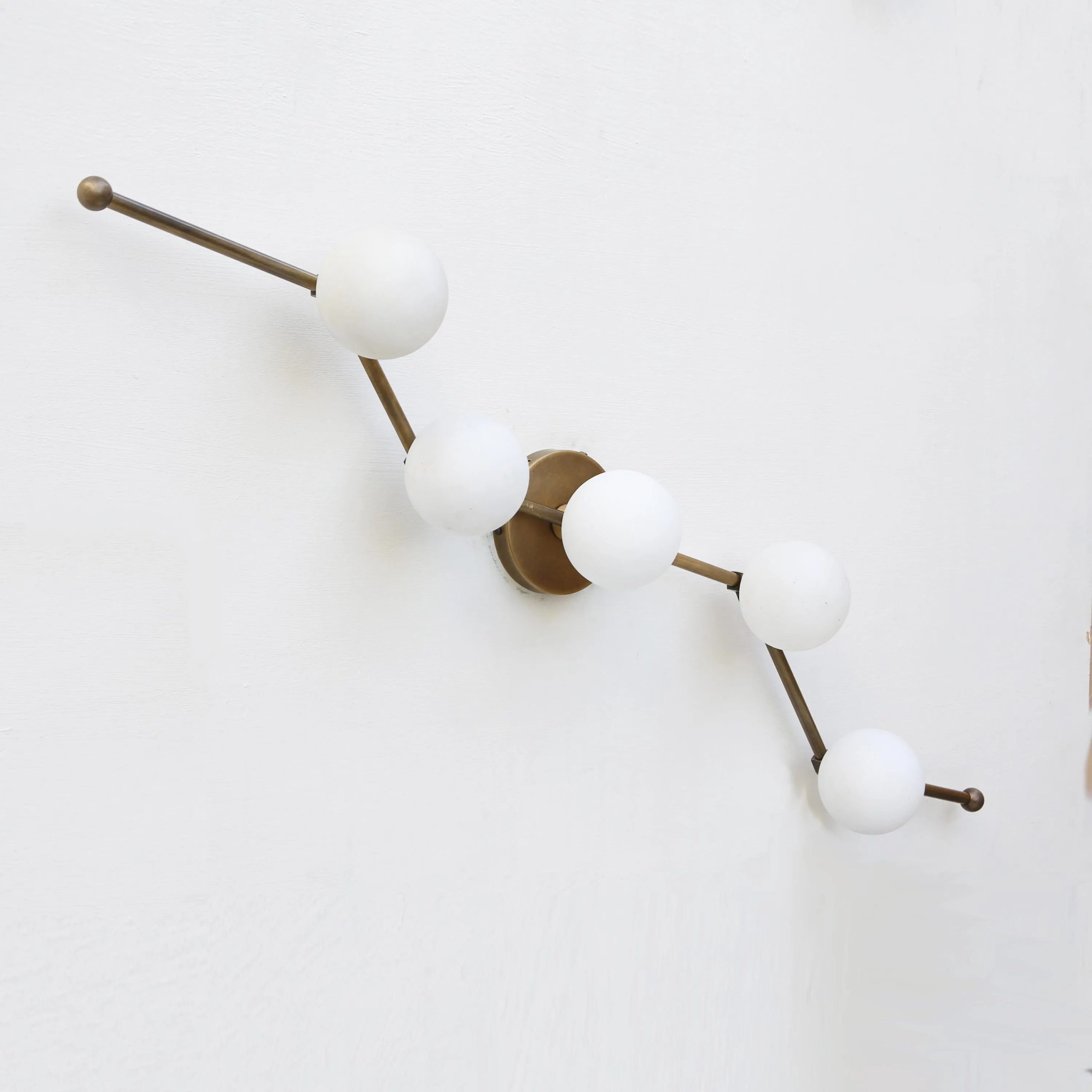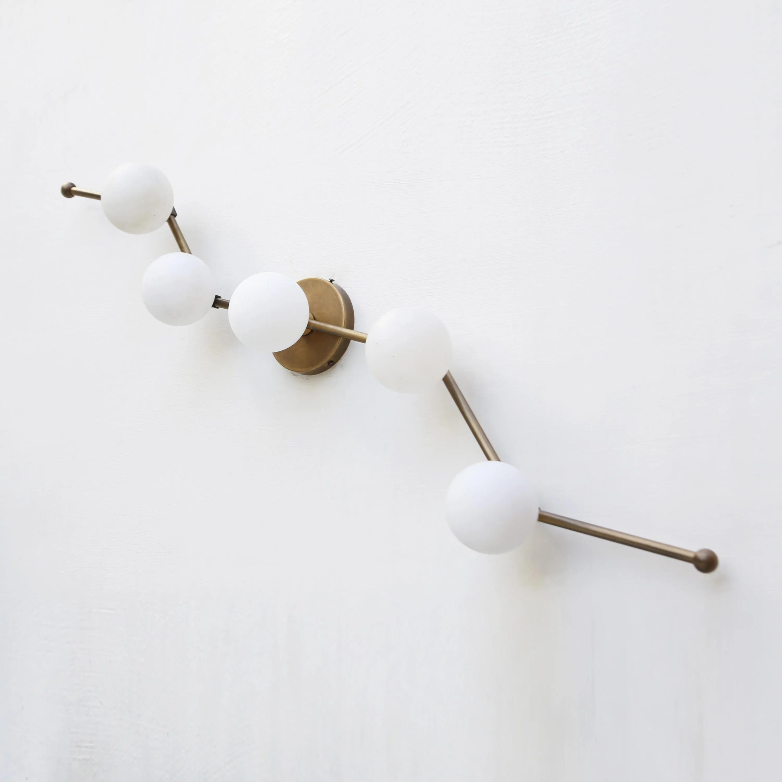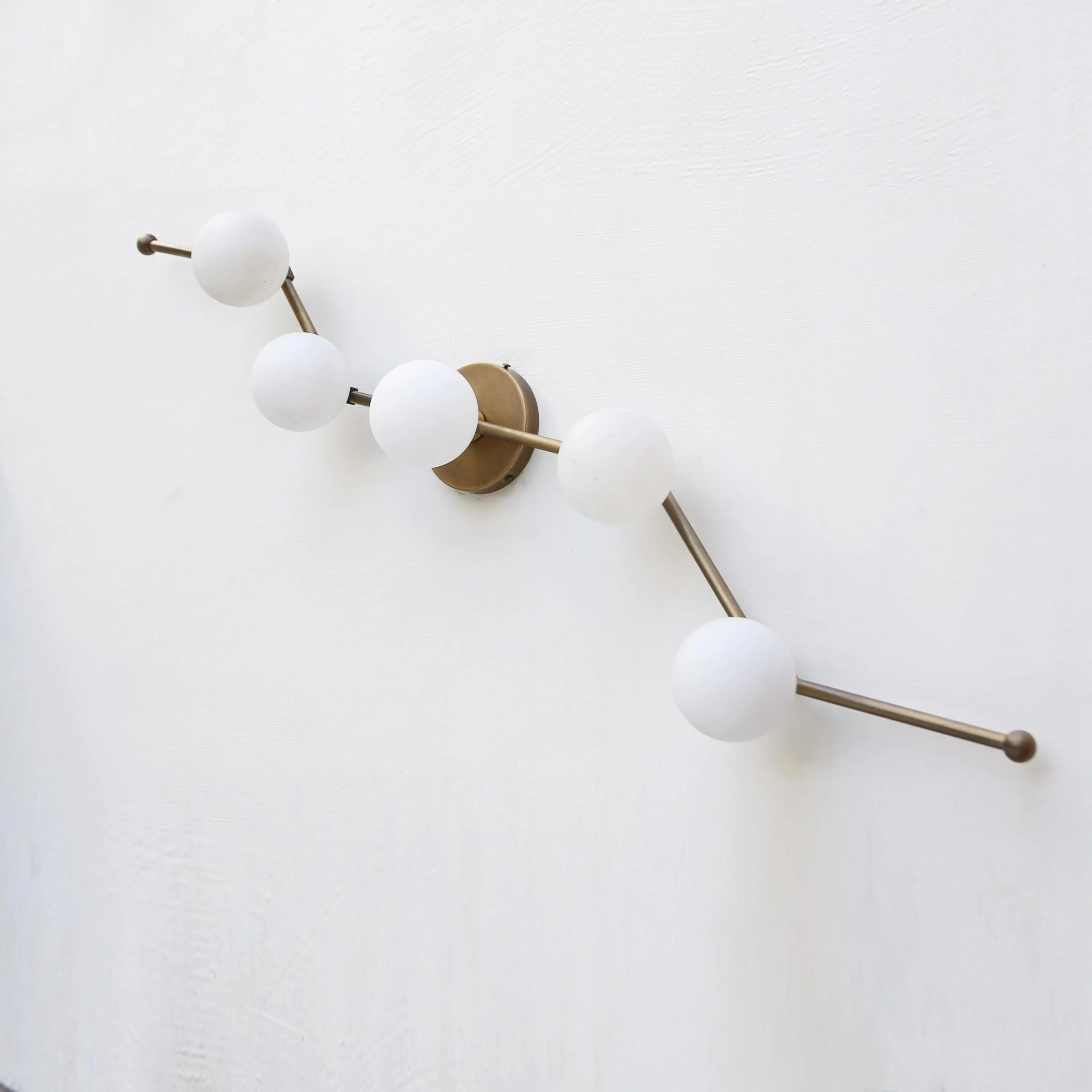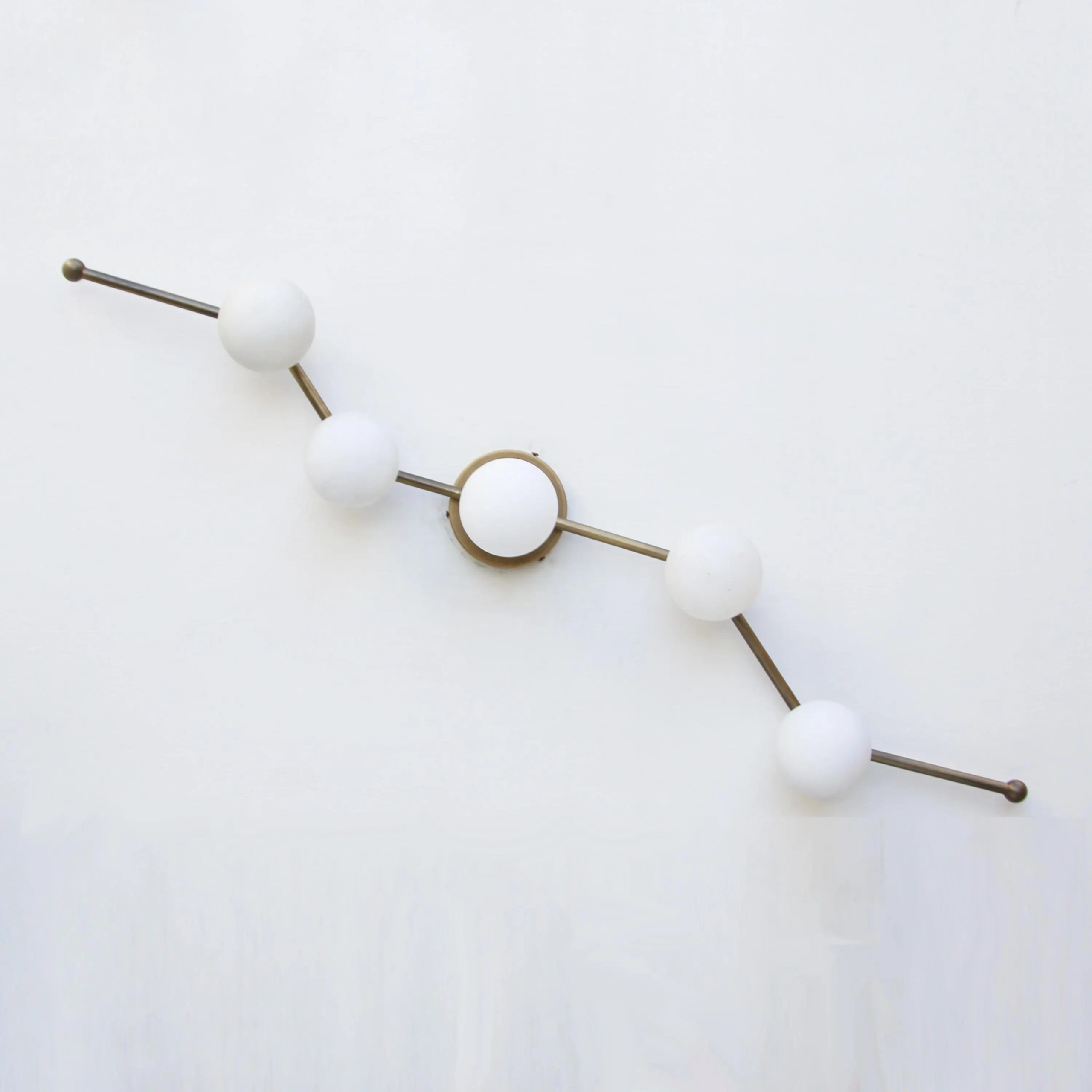 — A circular center ring backplate secures a long, diagonal brass rod adorned with five opal spheres, providing soft, glare-free illumination along the length.