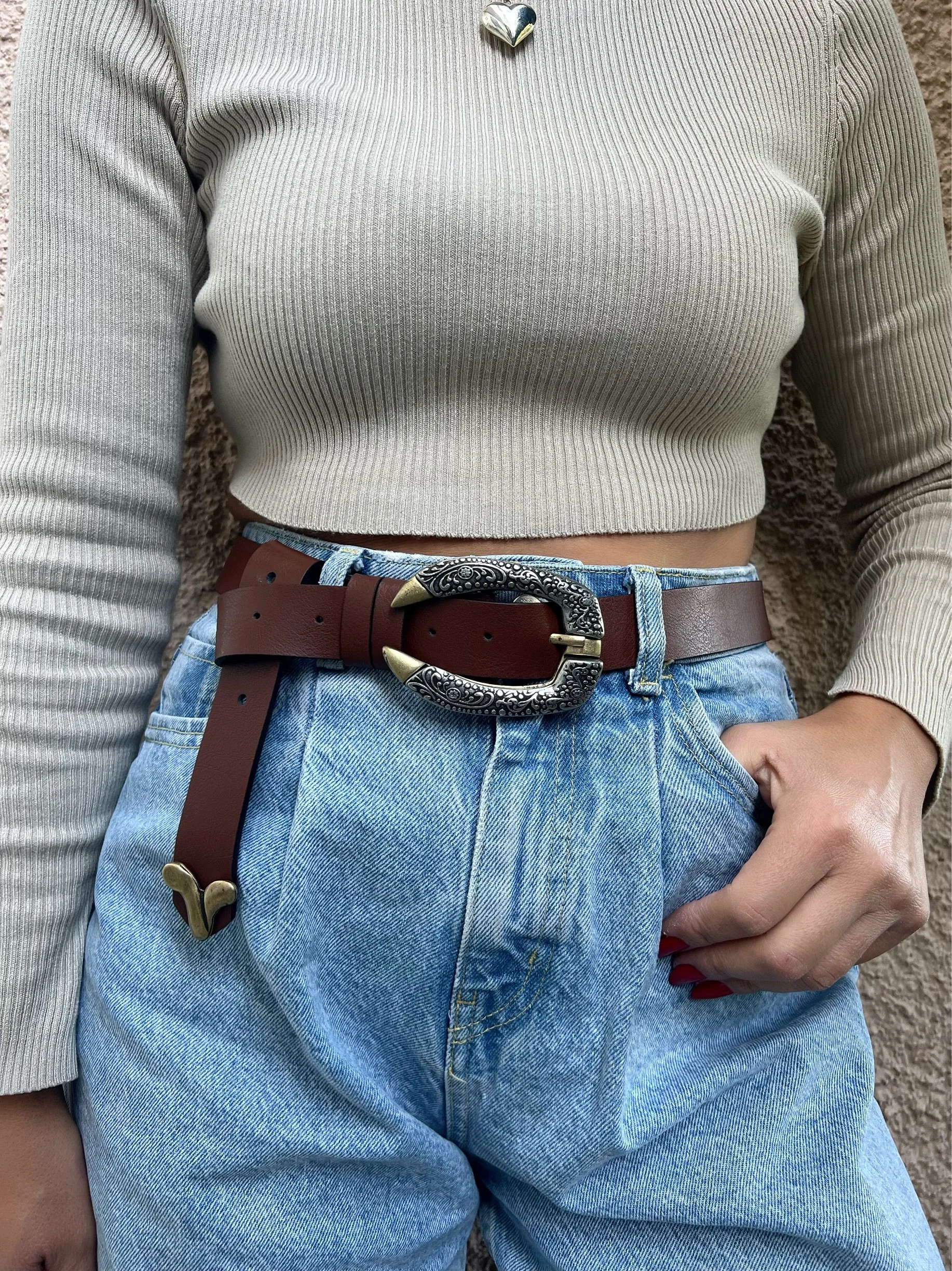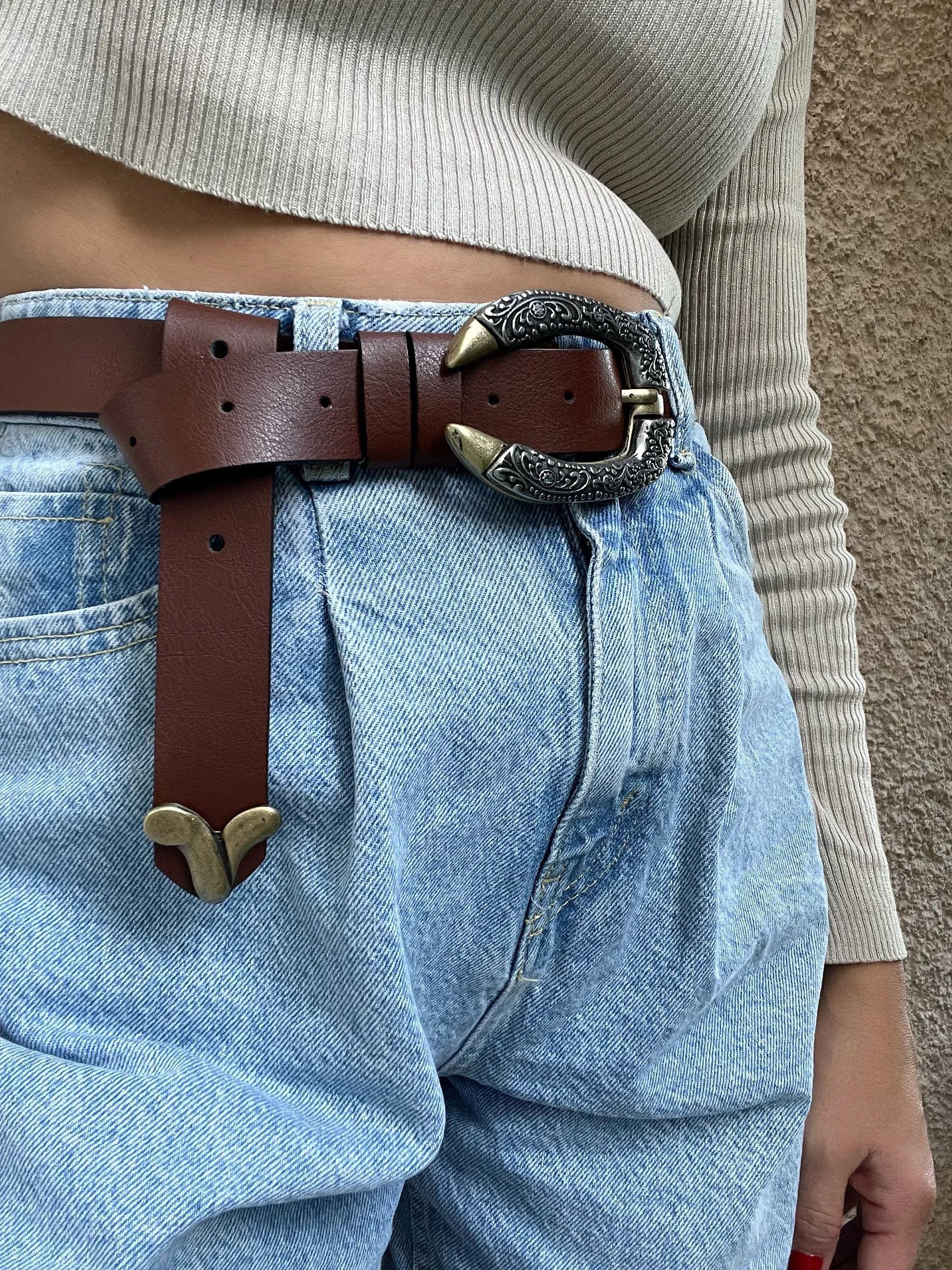 Vintage distressed buckle: Unlike ordinary belt buckles, this buckle resembles a vintage icon straight out of a Western. The rugged texture of distressed metal combined with a curled hem evokes the casual, uninhibited nature of denim while incorporating the refined details of vintage craftsmanship. The contrasting silver and brown color scheme instantly creates a visual anchor for any outfit, transforming the belt from a practical accessory into a style statement.