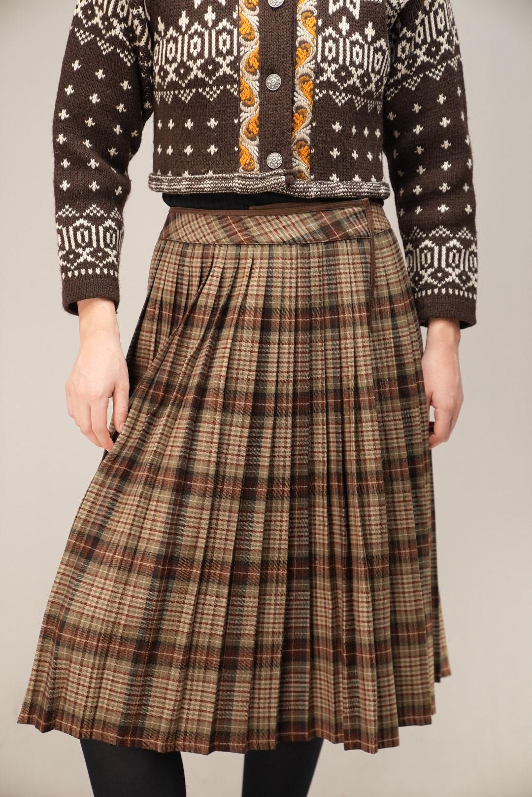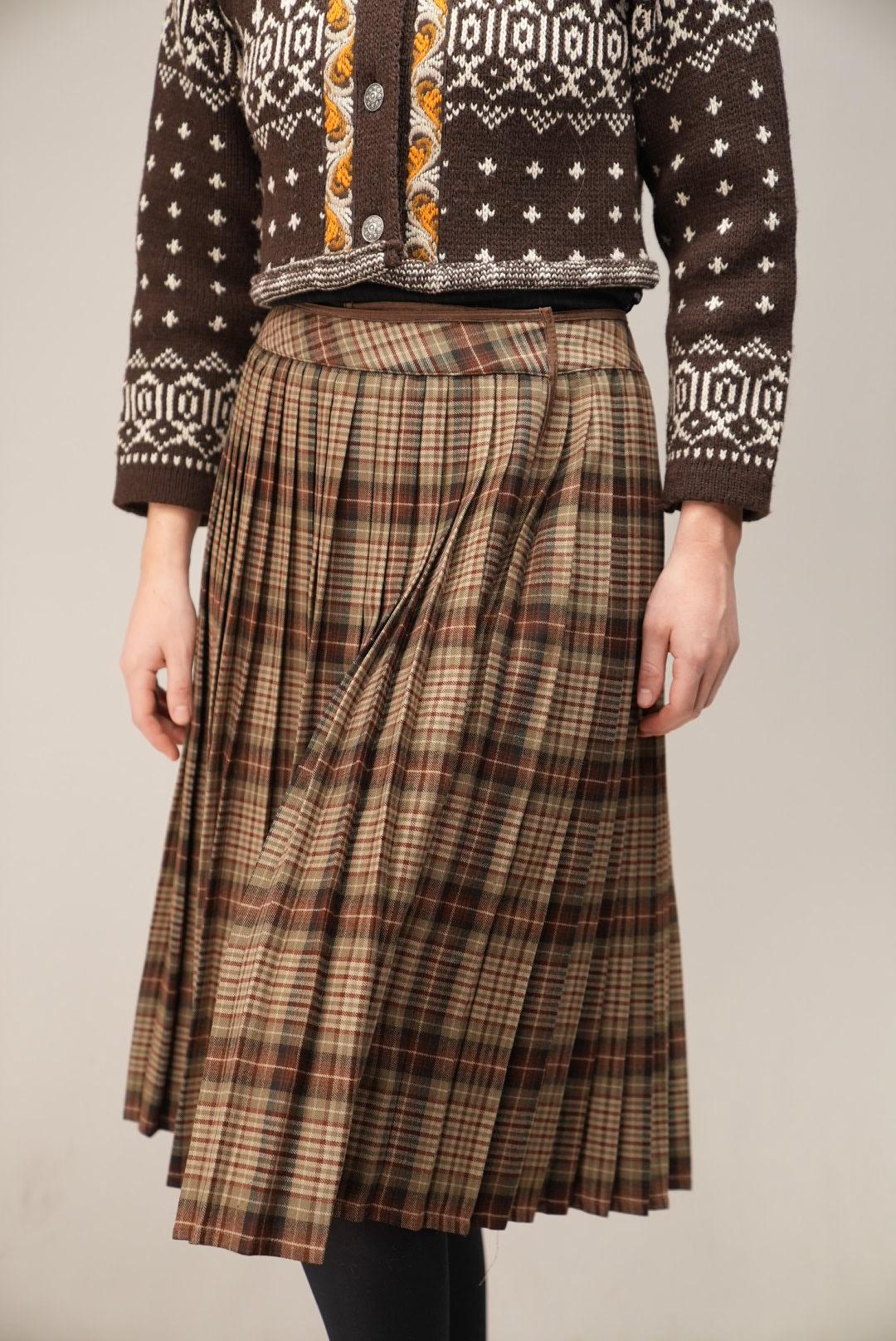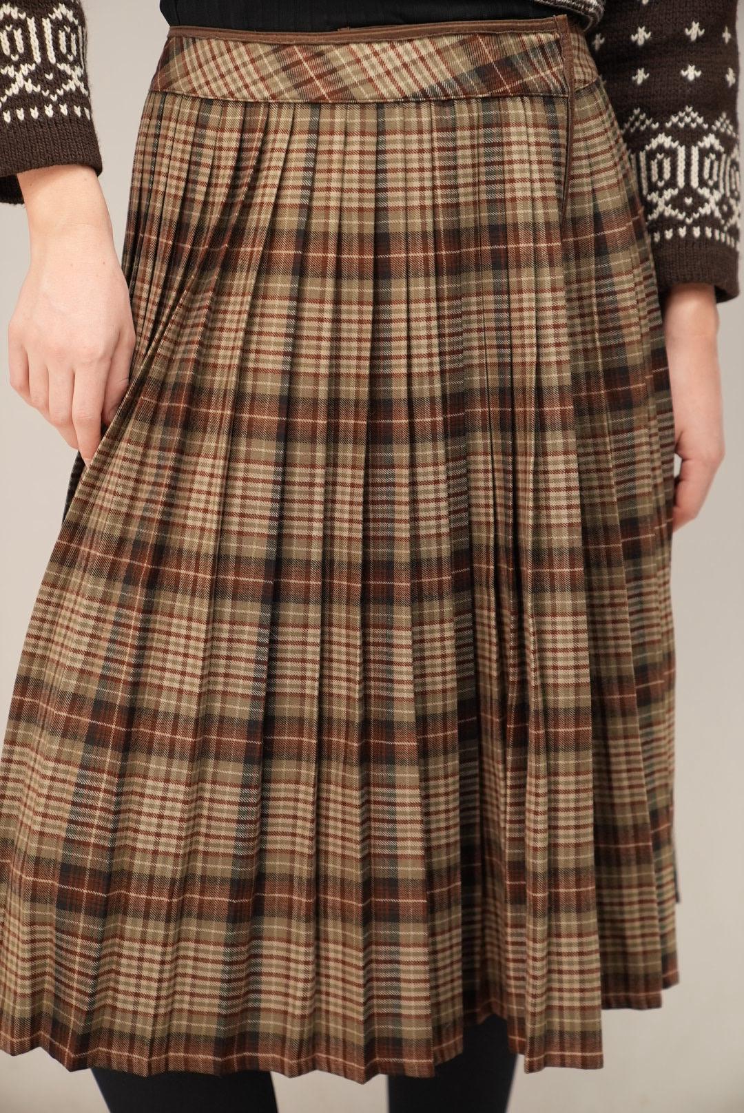 This midi skirt features a classic brown-based tartan in soft shades of tan, chestnut, and moss green, giving it a warm, countryside-inspired feel. The high-waisted cut and all-over pleating create a full, swishy silhouette, while the overlapping front panel adds a subtle kilt-like detail and gentle movement as you walk. It is an easy, timeless piece for autumn and winter outfits.