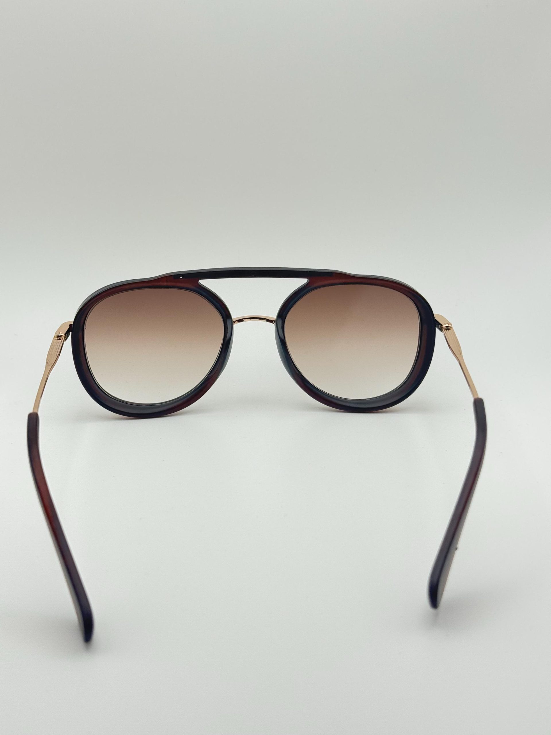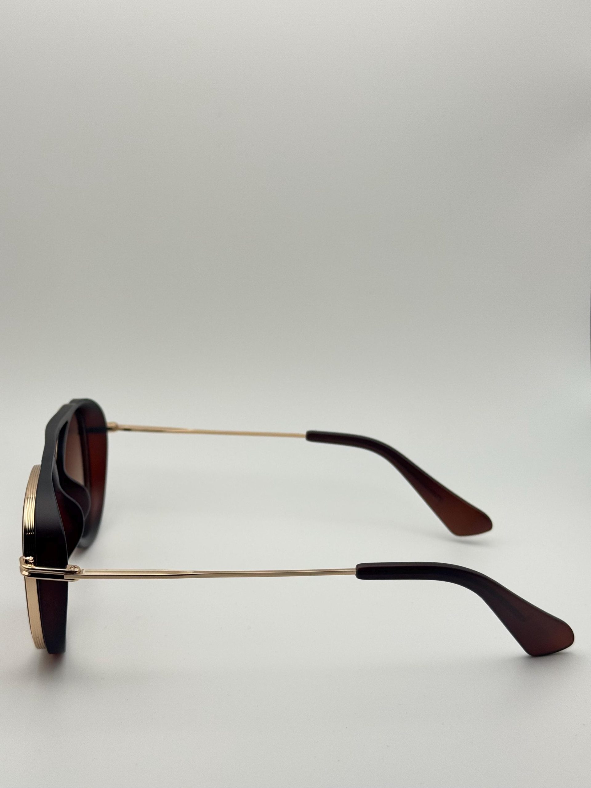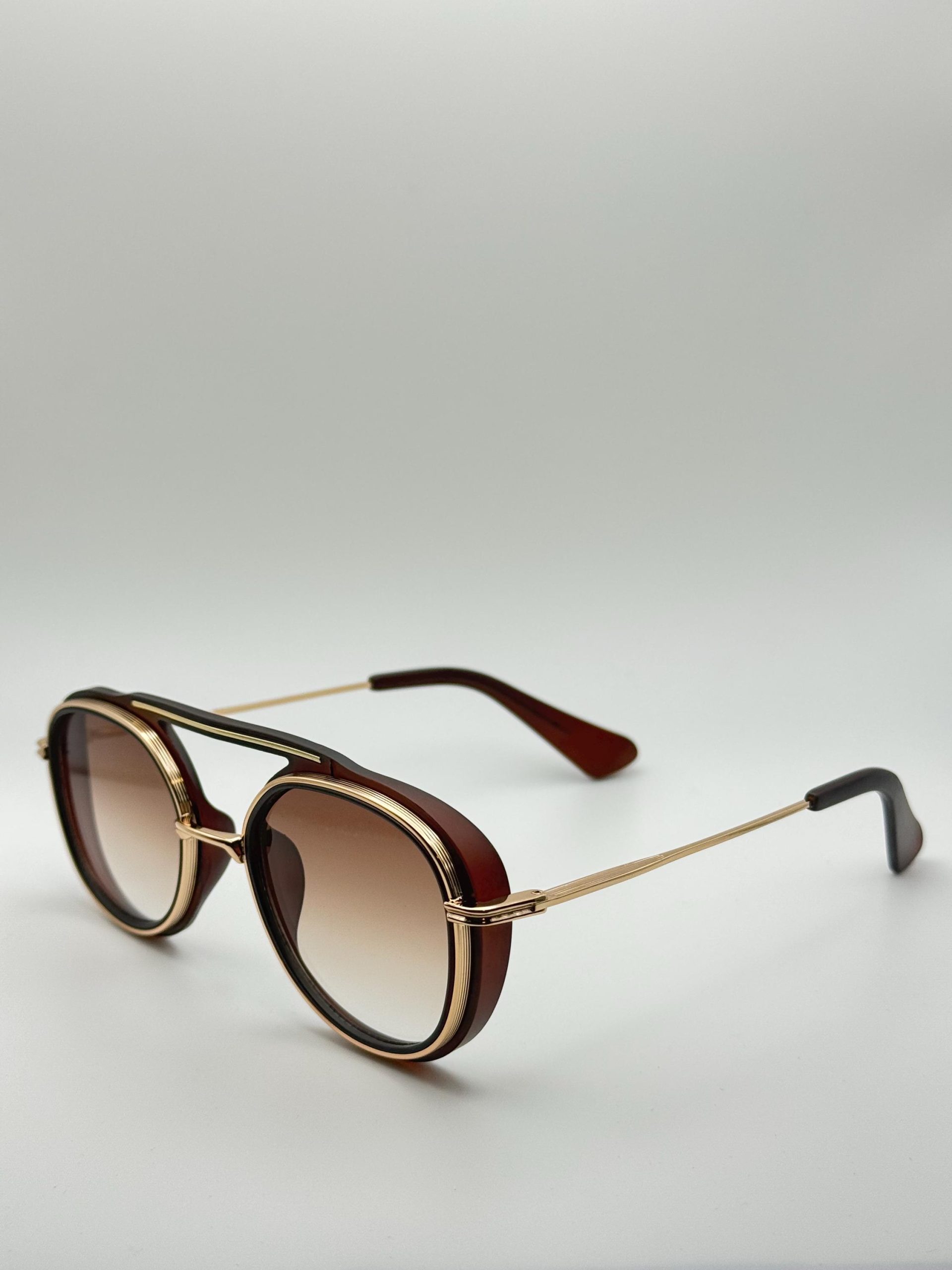 This is a pair of aviator sunglasses featuring a burgundy acetate frame with a gold metal rim, exuding a “retro double-ring luxury aura.” The core design elements include a burgundy acetate frame, gold metal double rings, a classic aviator silhouette, and gradient brown lenses. The aviator style retains a retro feel, while the double-ring structure and contrasting burgundy and gold colors create a luxurious and layered look. The burgundy acetate frame has a warm and textured feel, while the gold metal double rings add a touch of understated luxury. The gradient brown lenses offer both UV400 sun protection and visual softness, blocking glare in strong light and maintaining clarity in low light. It’s a focal point of “retro + luxury”—the double rings add depth, and the burgundy and gold color blocking enhances its presence, easily handling retro parties, sophisticated commutes, and other occasions.