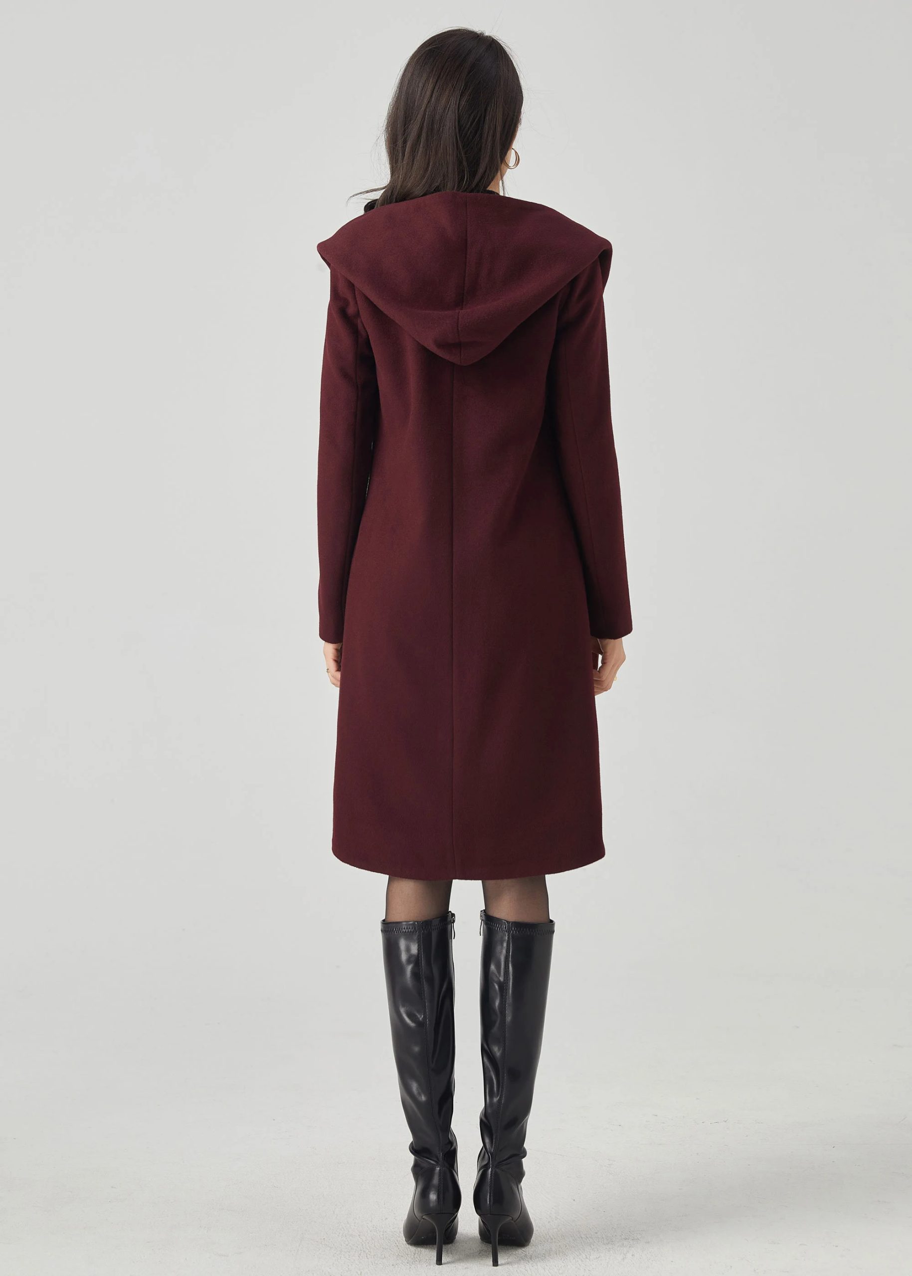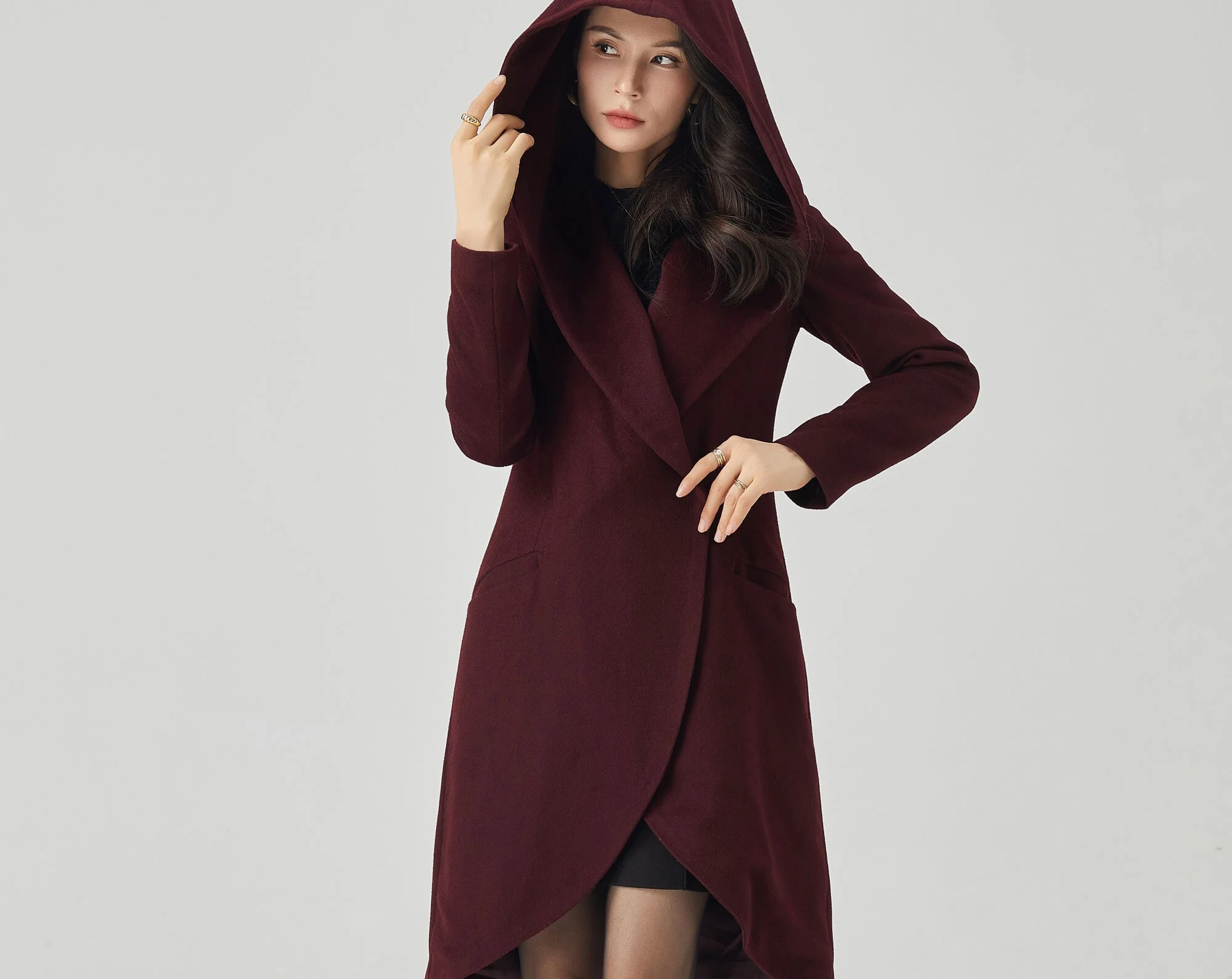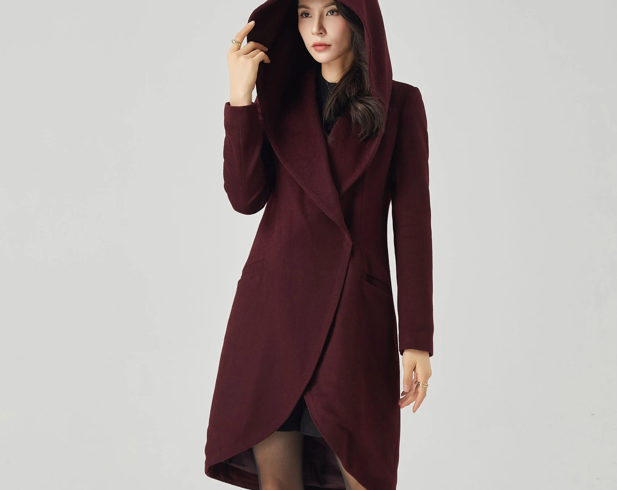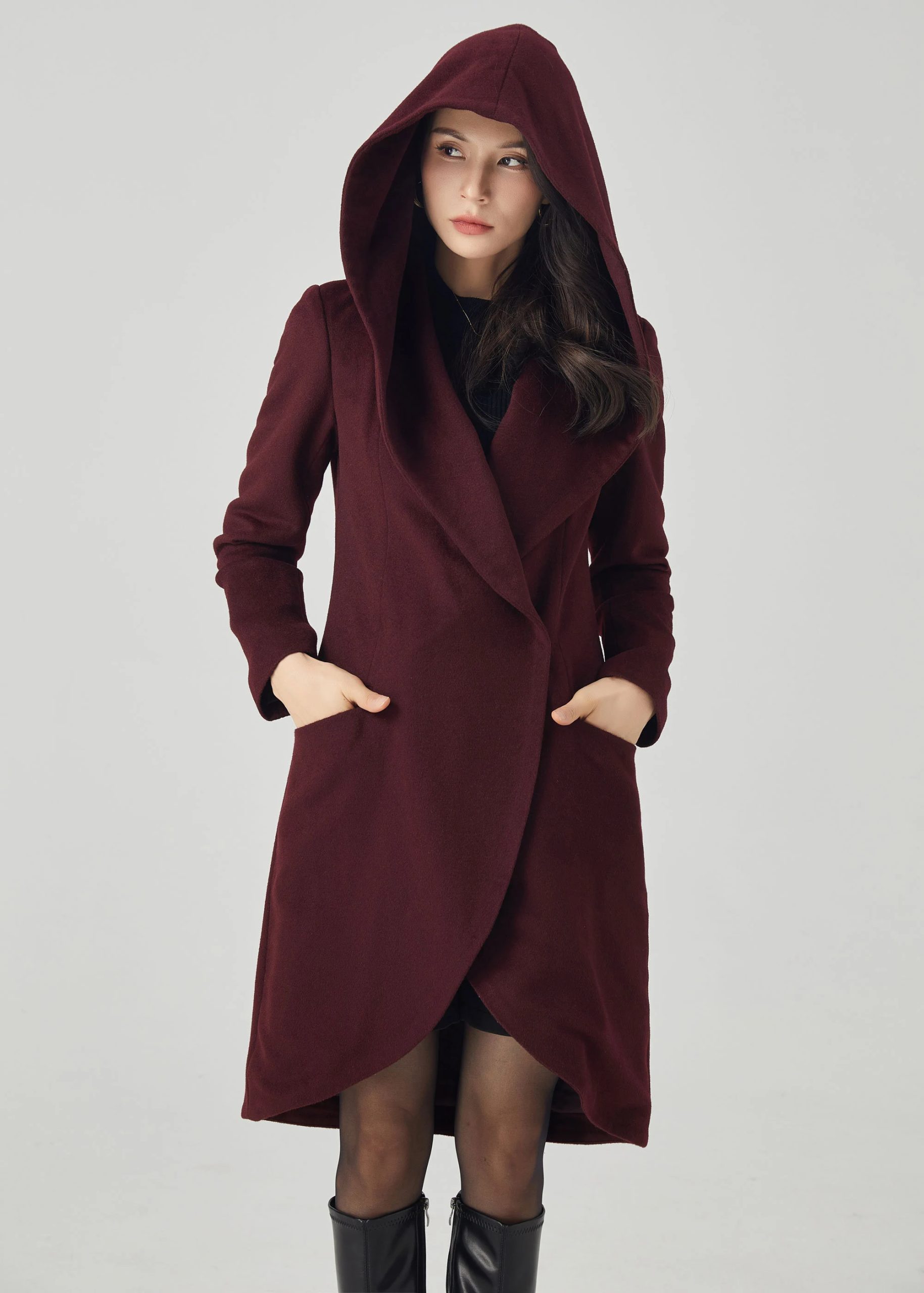 This deep burgundy coat features a soft structure, enhanced by an oversized hood, evoking a charming face from a fairytale. The crisscross front lapels curve around the body, creating an elegant tulip-shaped hem that elongates the silhouette while maintaining a fluid feel. A defined waistband and flowing princess seams enhance the silhouette without creating bulk. Side welt pockets provide warmth without sacrificing a simple silhouette. The overall look is comfortable, feminine, and elegant.
