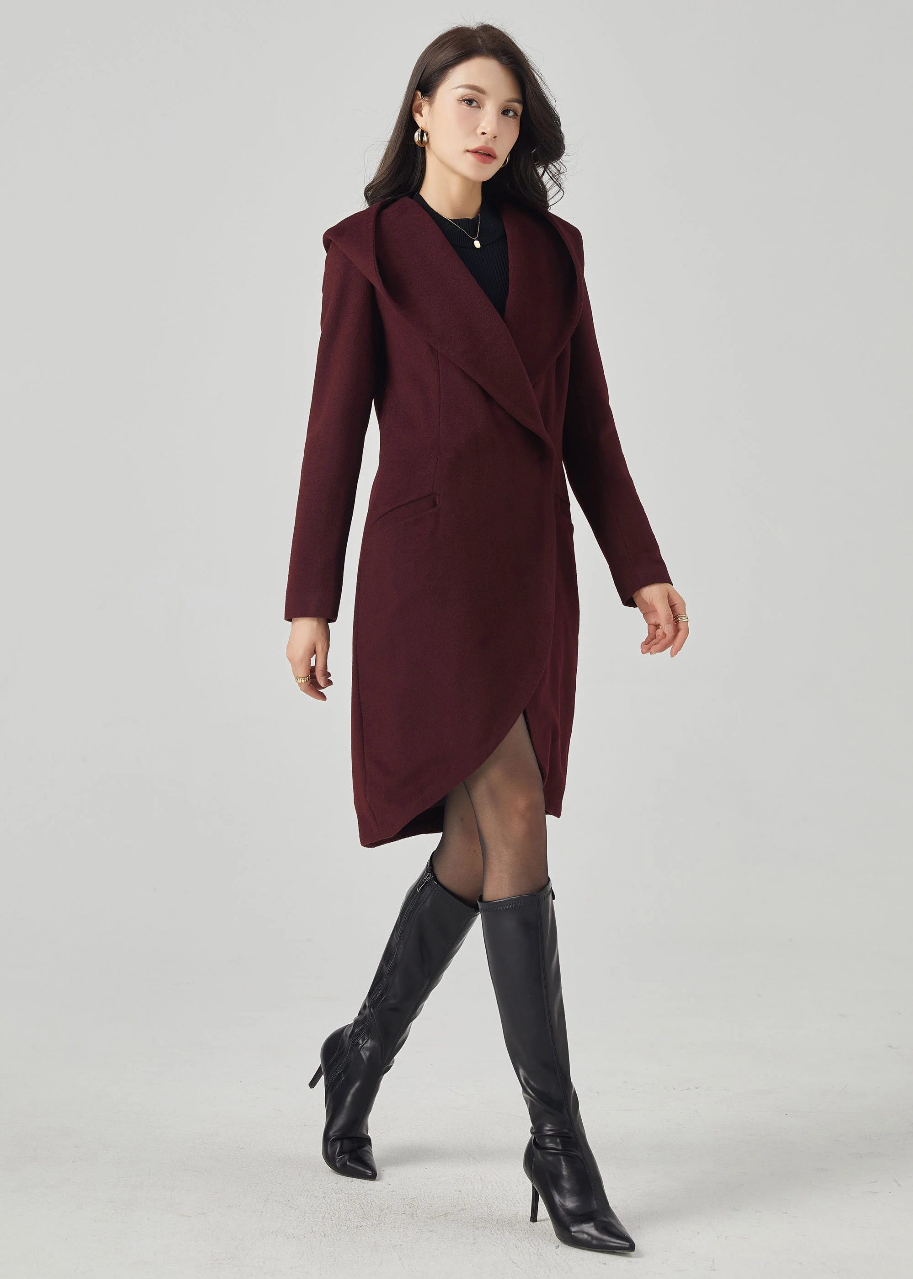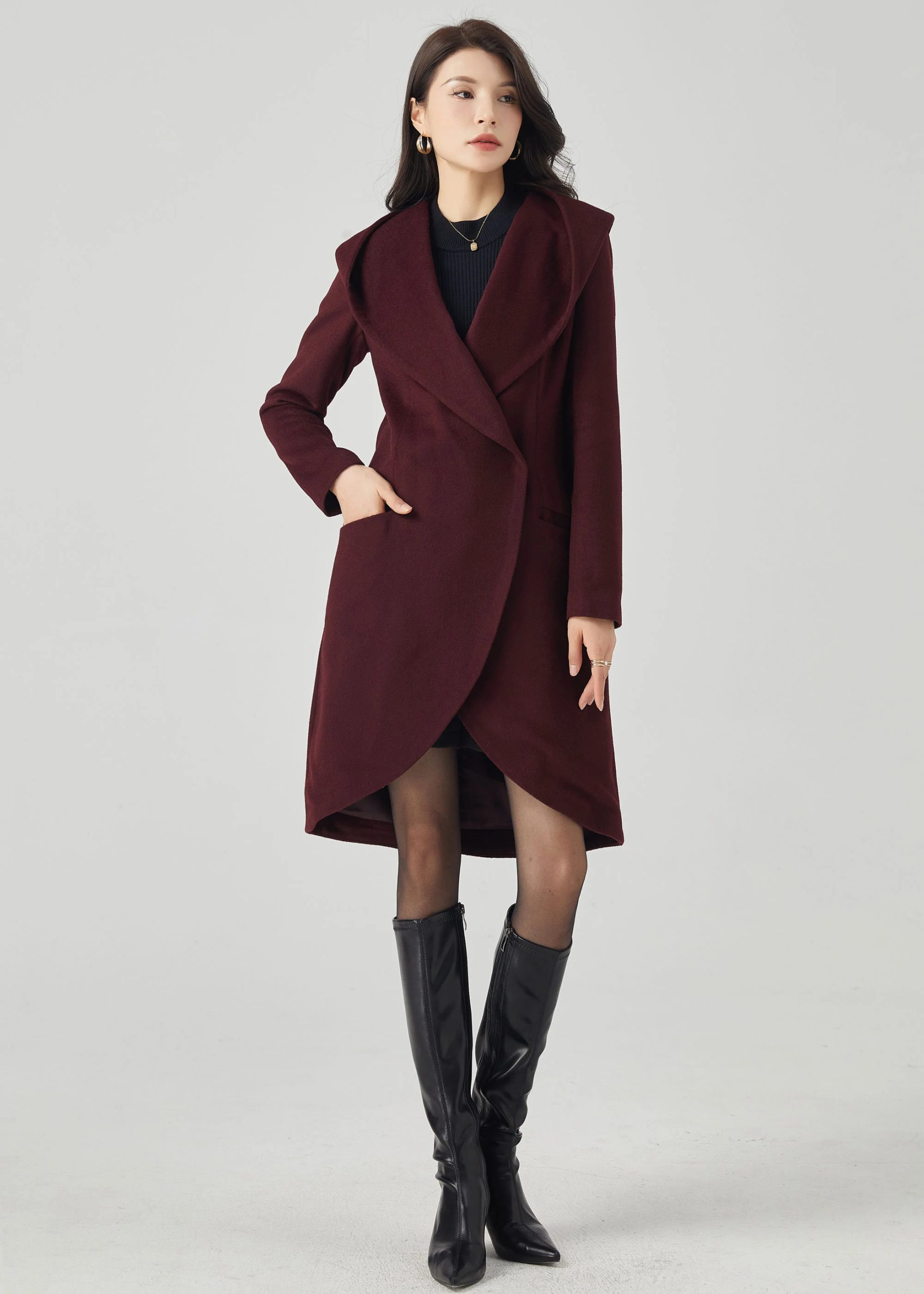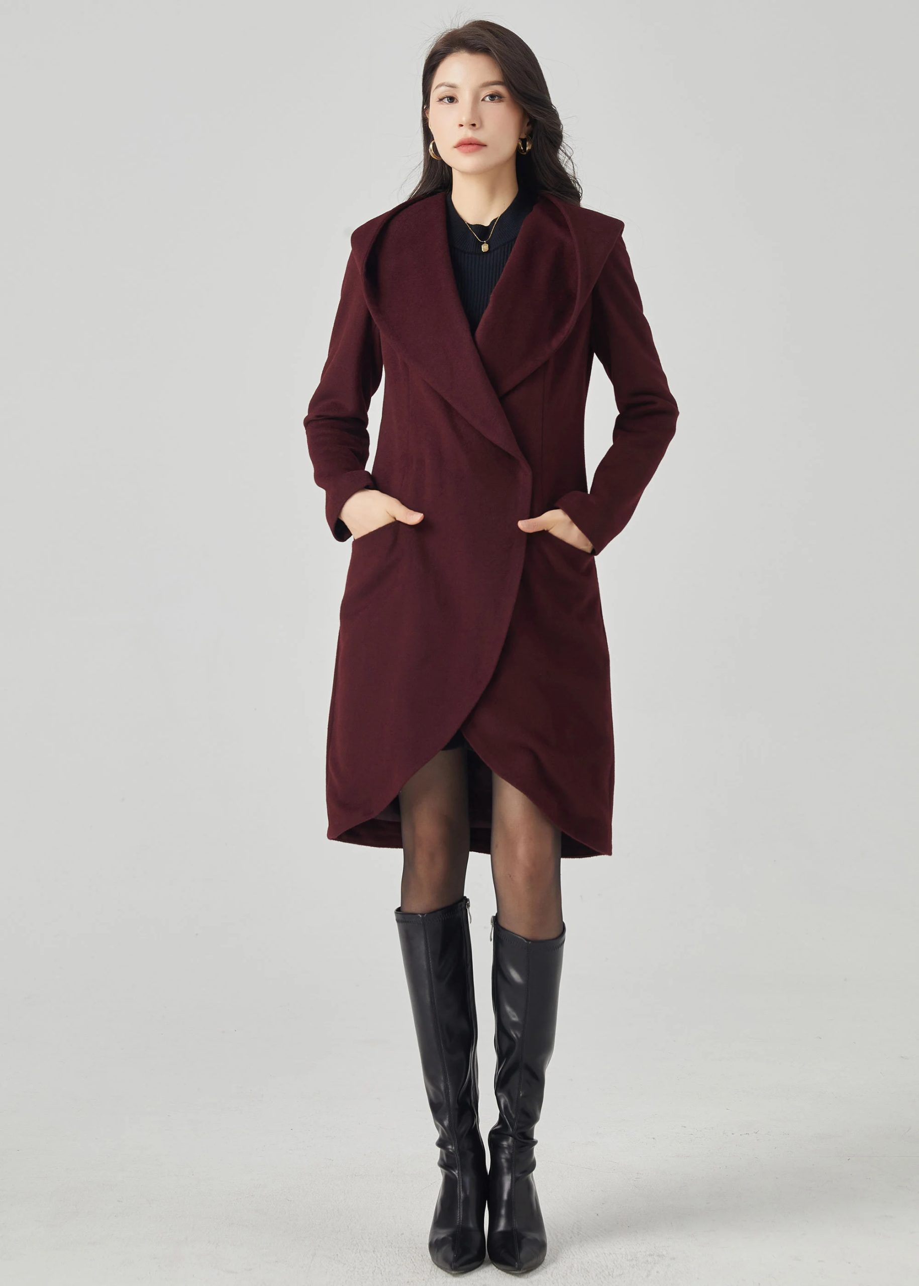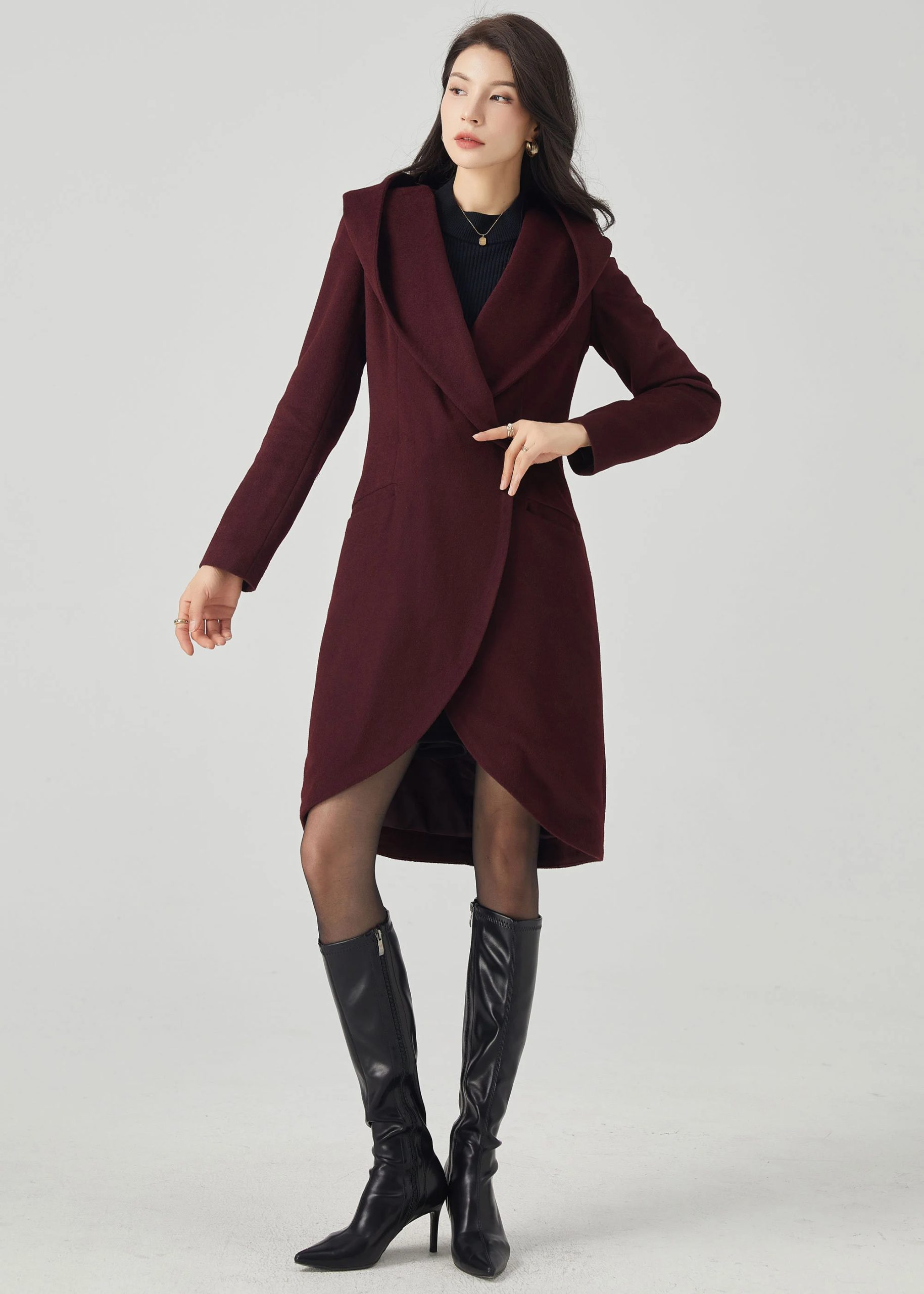 This deep burgundy coat features a soft structure, enhanced by an oversized hood, evoking a charming face from a fairytale. The crisscross front lapels curve around the body, creating an elegant tulip-shaped hem that elongates the silhouette while maintaining a fluid feel. A defined waistband and flowing princess seams enhance the silhouette without creating bulk. Side welt pockets provide warmth without sacrificing a simple silhouette. The overall look is comfortable, feminine, and elegant.