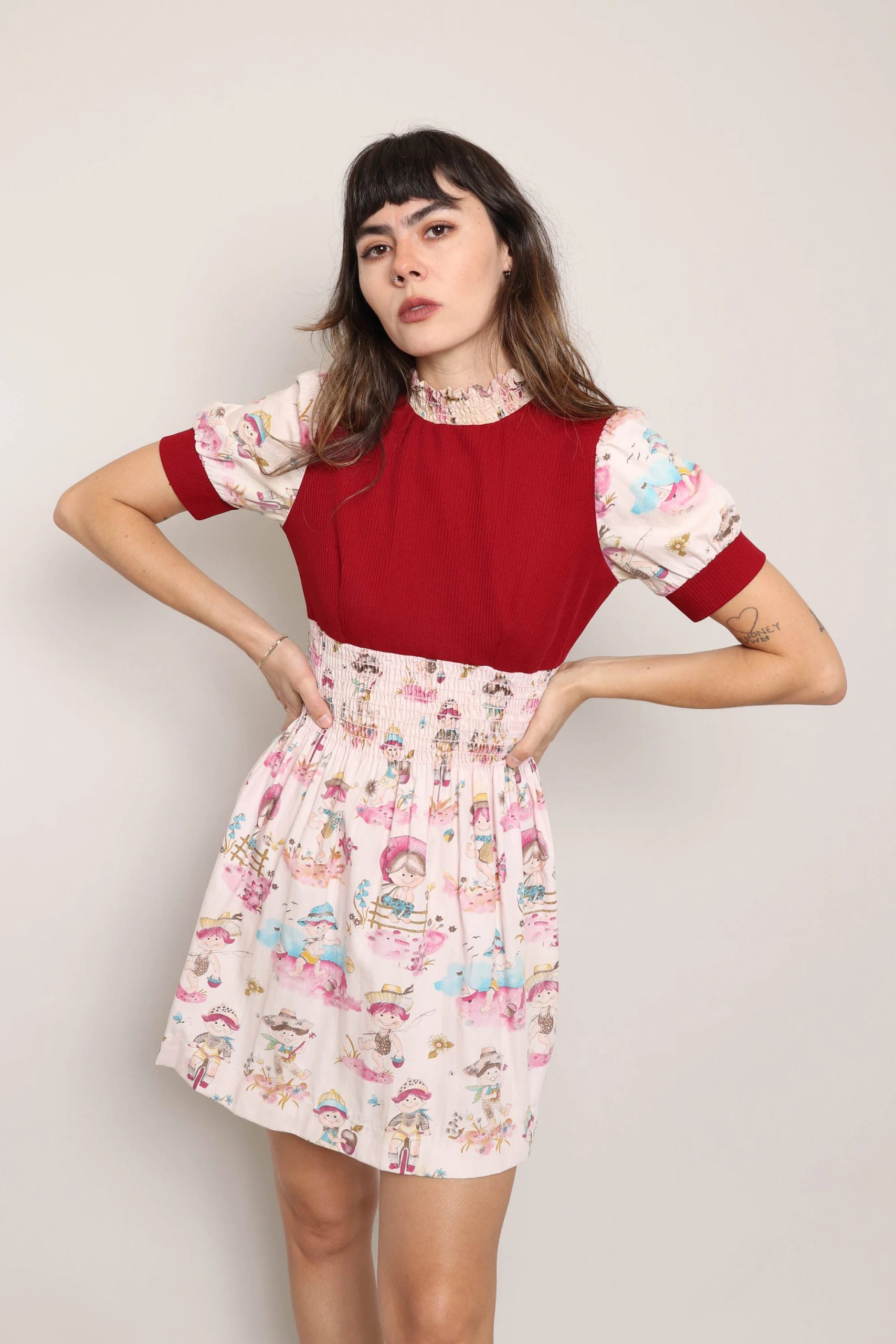 Dress: Light pink cartoon/theme-themed print umbrella skirt radiates from the waist, creating a light and airy sway when walking.