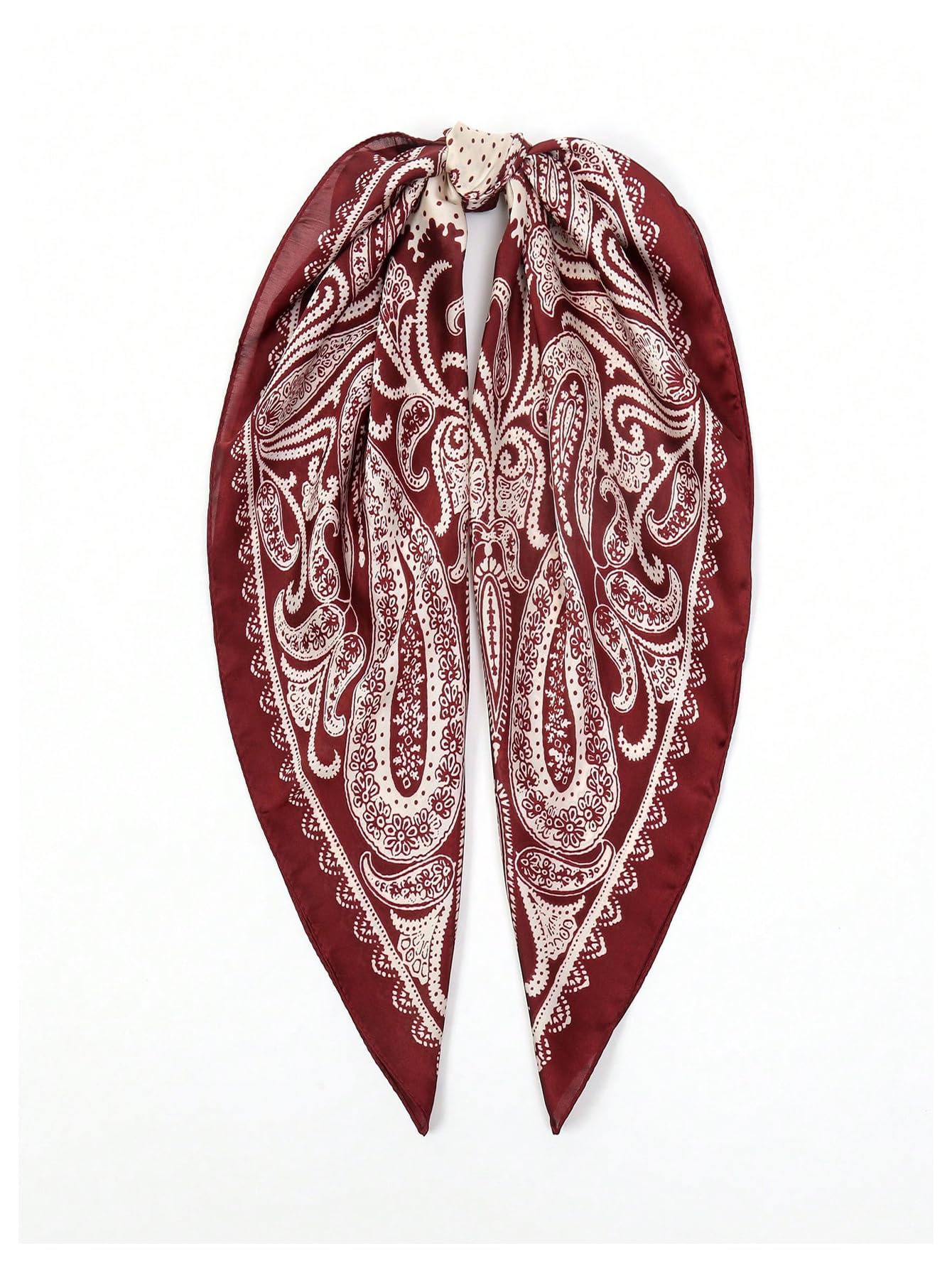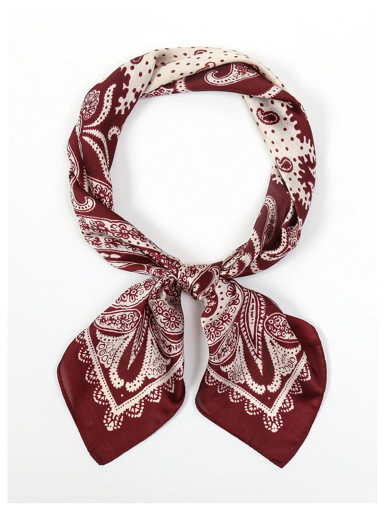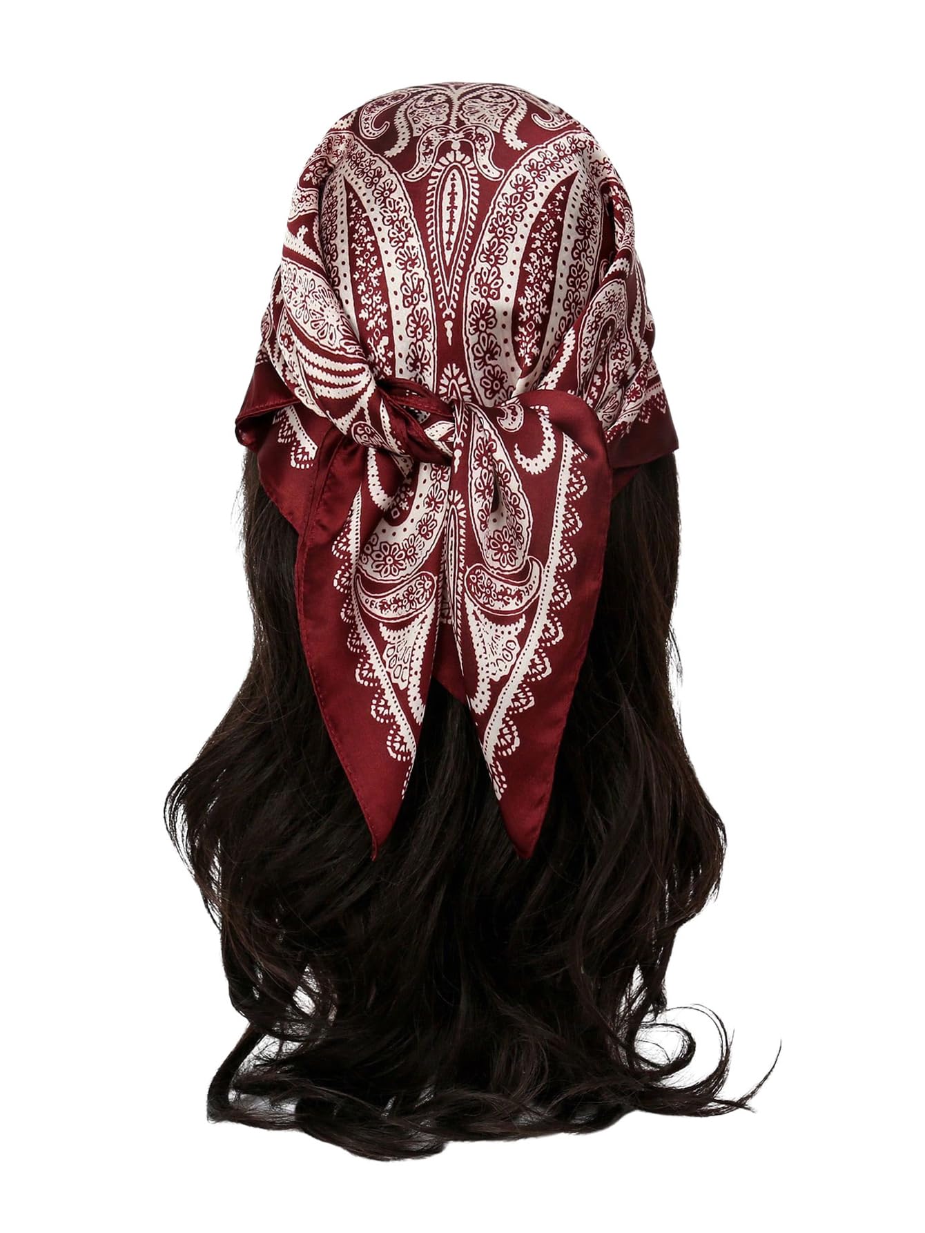 This retro bandana design blends paisley and small polka dots/patterns, featuring a striking contrast between burgundy and off-white for a sophisticated and timeless look. The smooth, subtly sheen fabric drapes beautifully and feels comfortable against the neck without feeling stuffy. Its compact size when folded makes it versatile for commuting, outings, or dates.