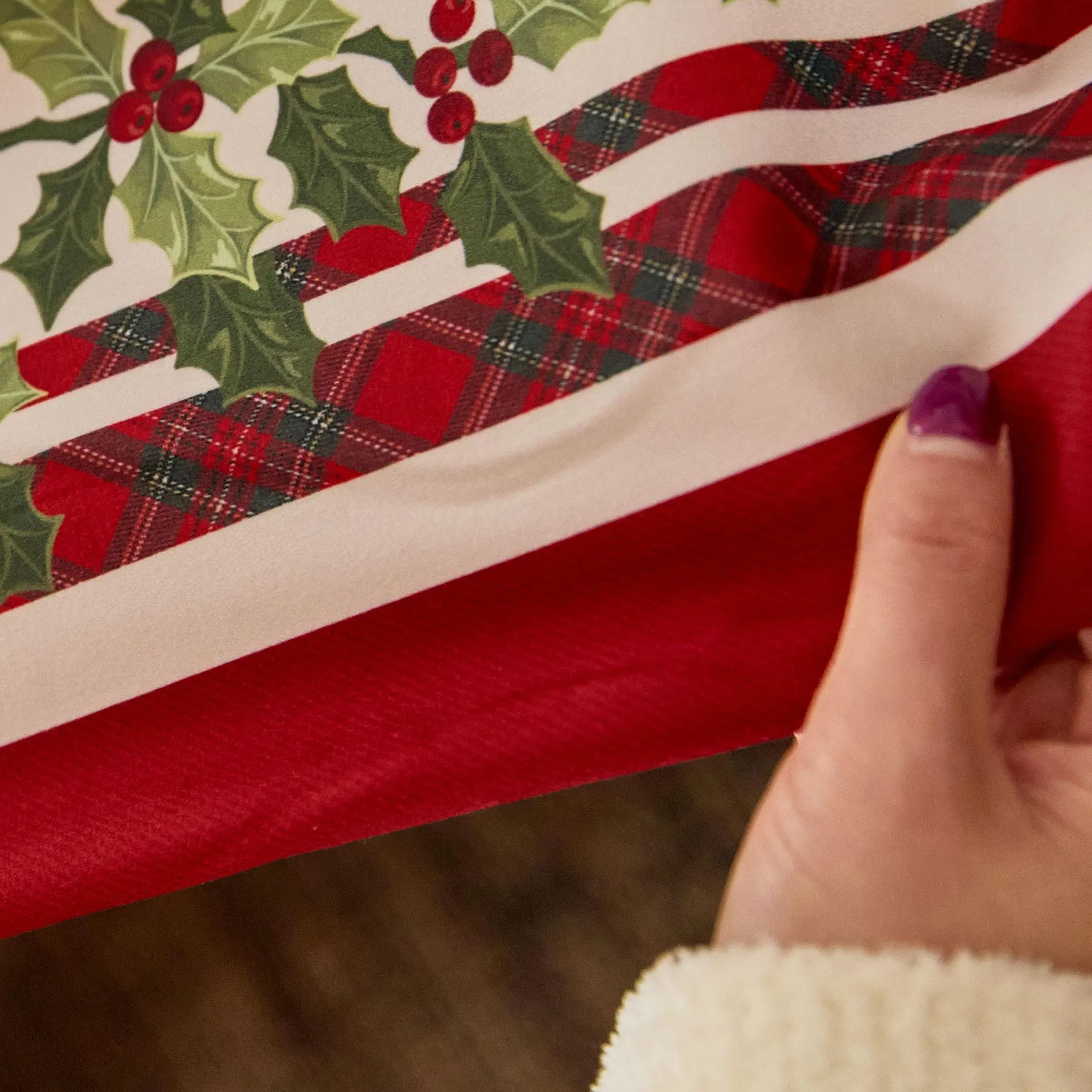 A deep burgundy checkered base is framed by an off-white wavy border, embellished with holly leaves and red berries, and bordered with red and white pinstripe stripes. This design creates a festive yet durable home decor. It instantly creates a warm and inviting home.