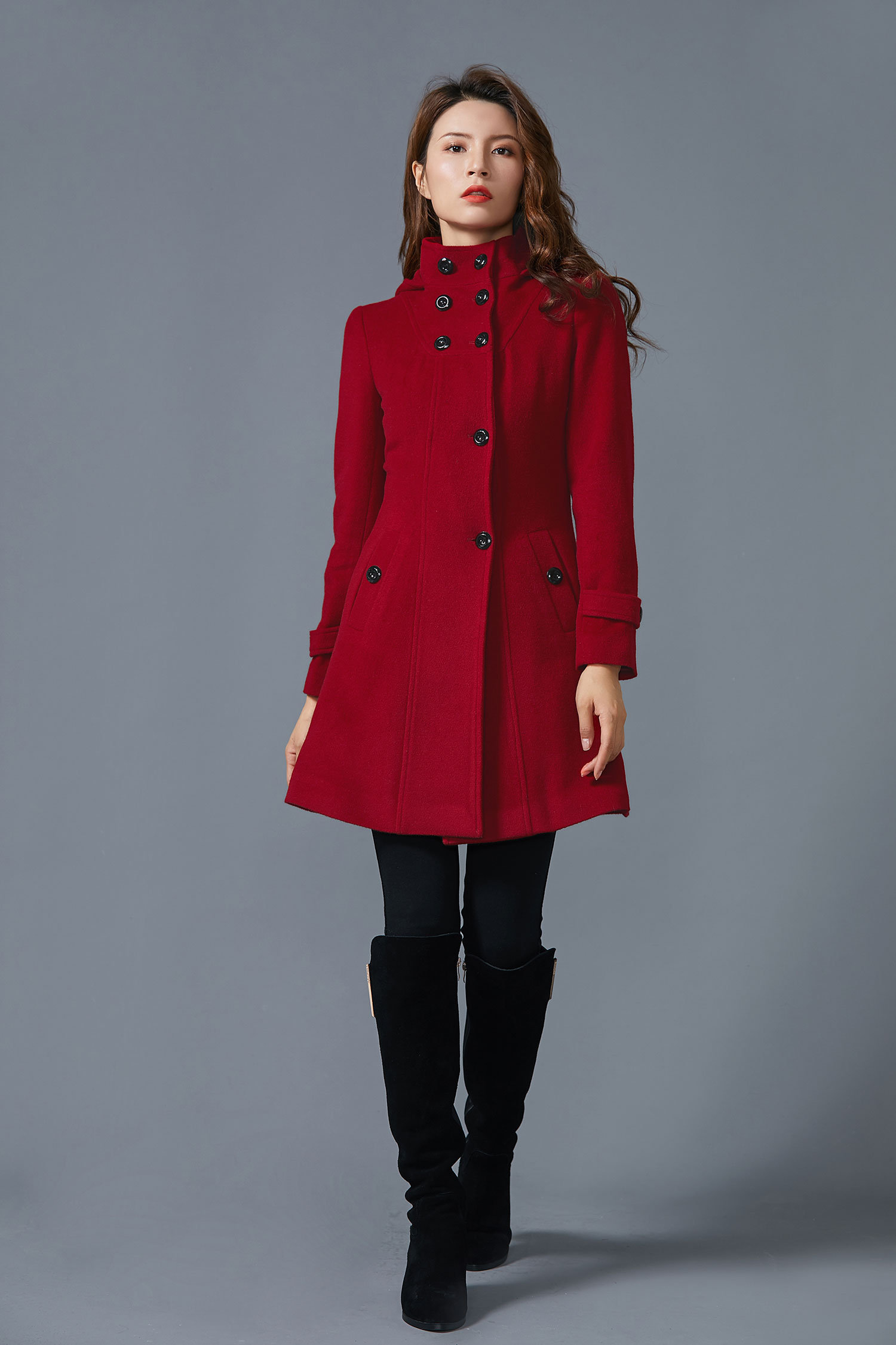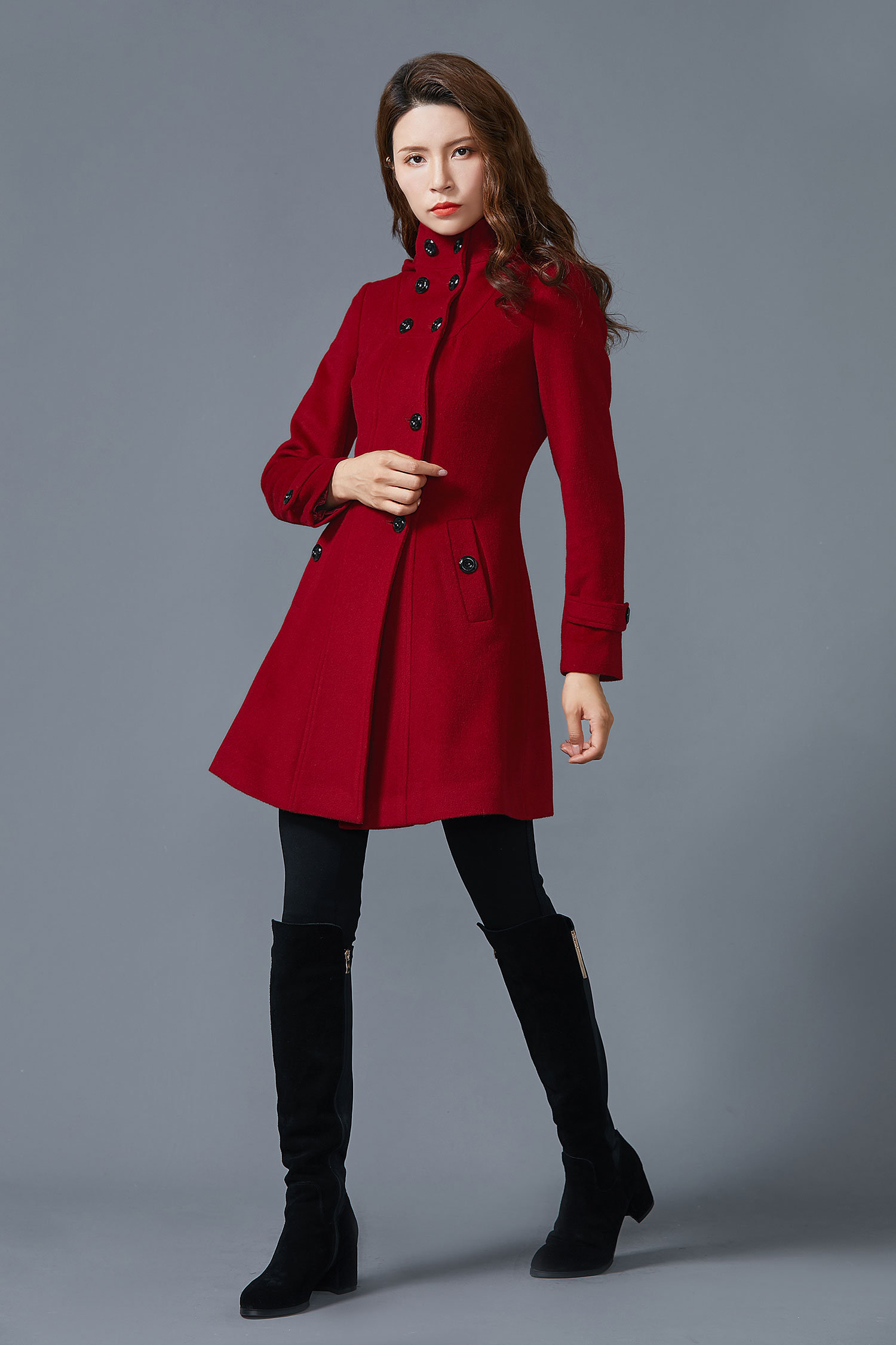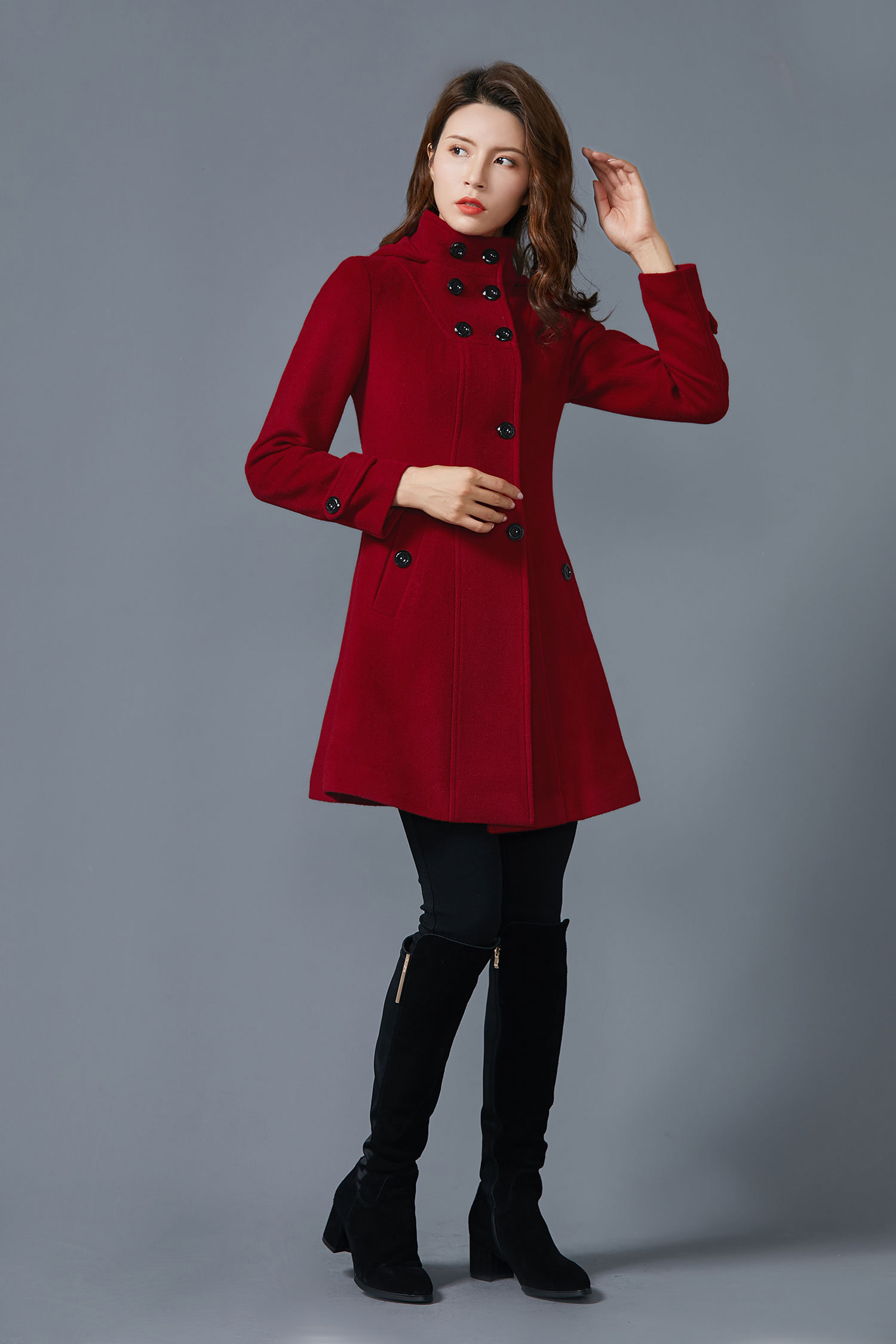 This exquisite, deep burgundy short coat features a tailored, soft silhouette with a defined waist and mid-thigh length. A simple stand-up collar and double-breasted front, accented with shiny black buttons, enhance the sharp, military-inspired look. Princess seams elongate the torso, while the waist is strategically cinched, creating a sleek hourglass silhouette. Practical design features include angled button-flap pockets and banded cuff tabs for added dimension. The overall look is smart, warm, and exudes urban chic.