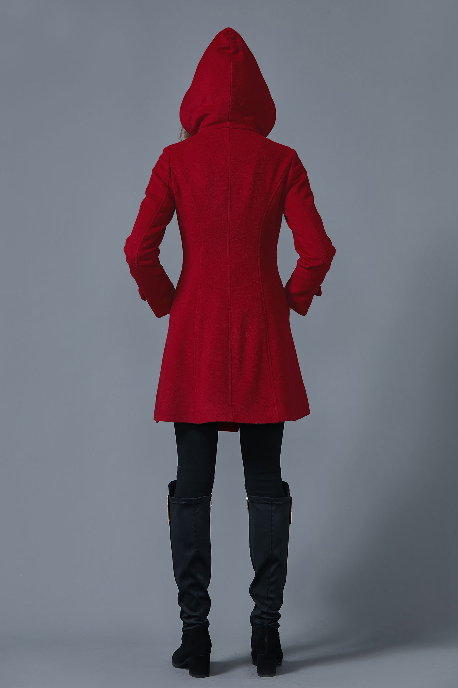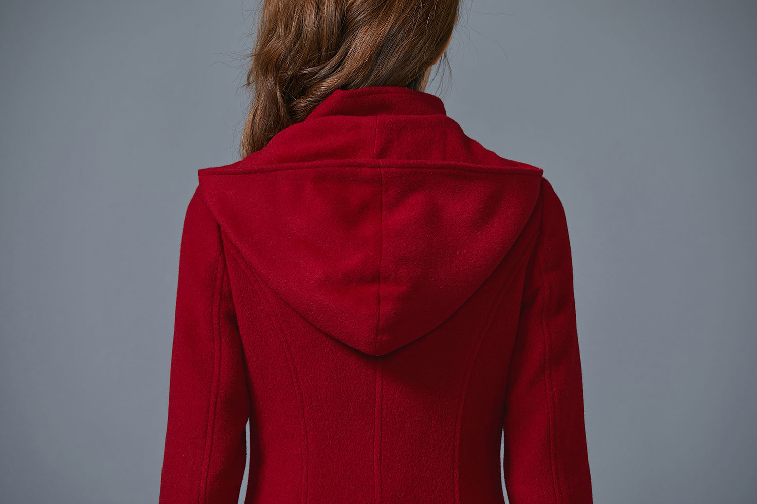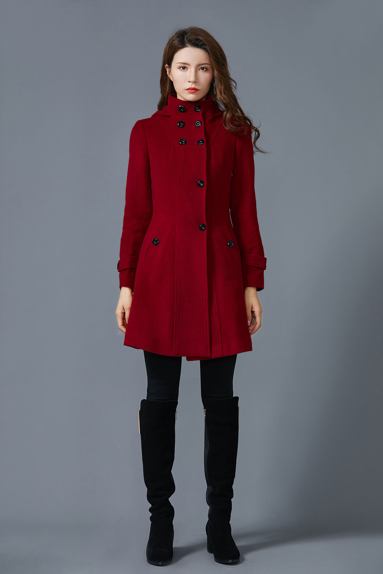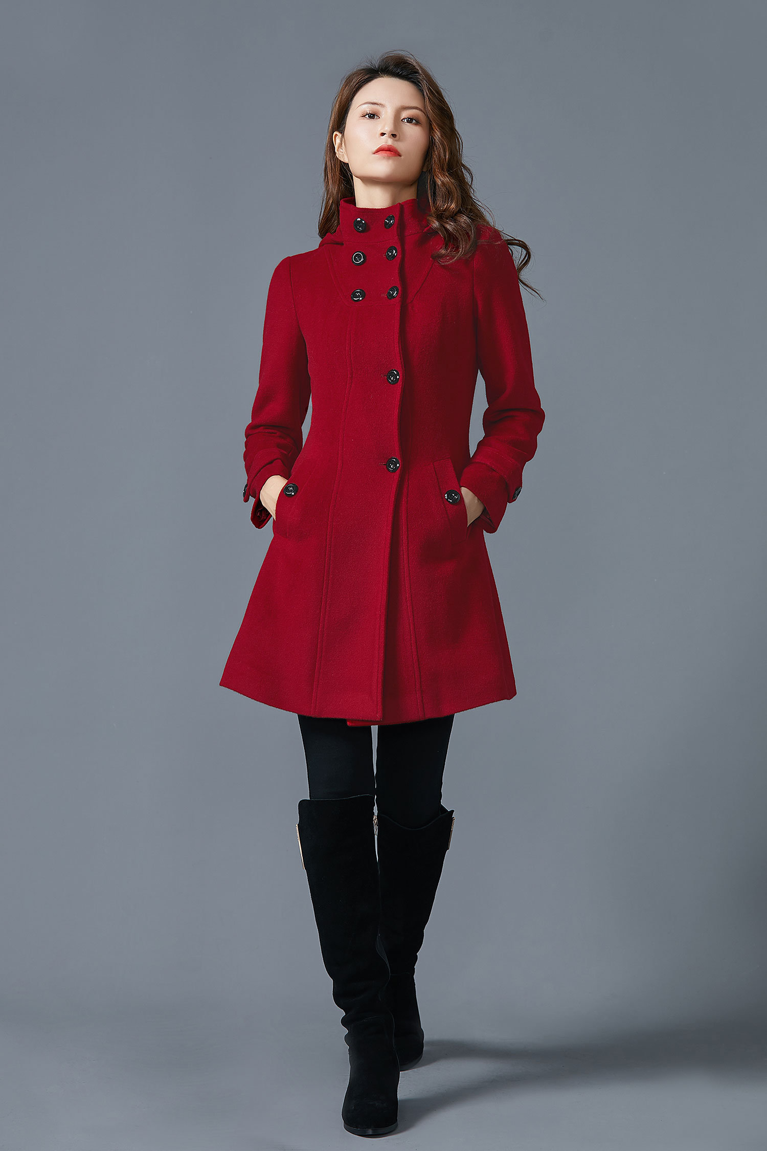 This exquisite, deep burgundy short coat features a tailored, soft silhouette with a defined waist and mid-thigh length. A simple stand-up collar and double-breasted front, accented with shiny black buttons, enhance the sharp, military-inspired look. Princess seams elongate the torso, while the waist is strategically cinched, creating a sleek hourglass silhouette. Practical design features include angled button-flap pockets and banded cuff tabs for added dimension. The overall look is smart, warm, and exudes urban chic.