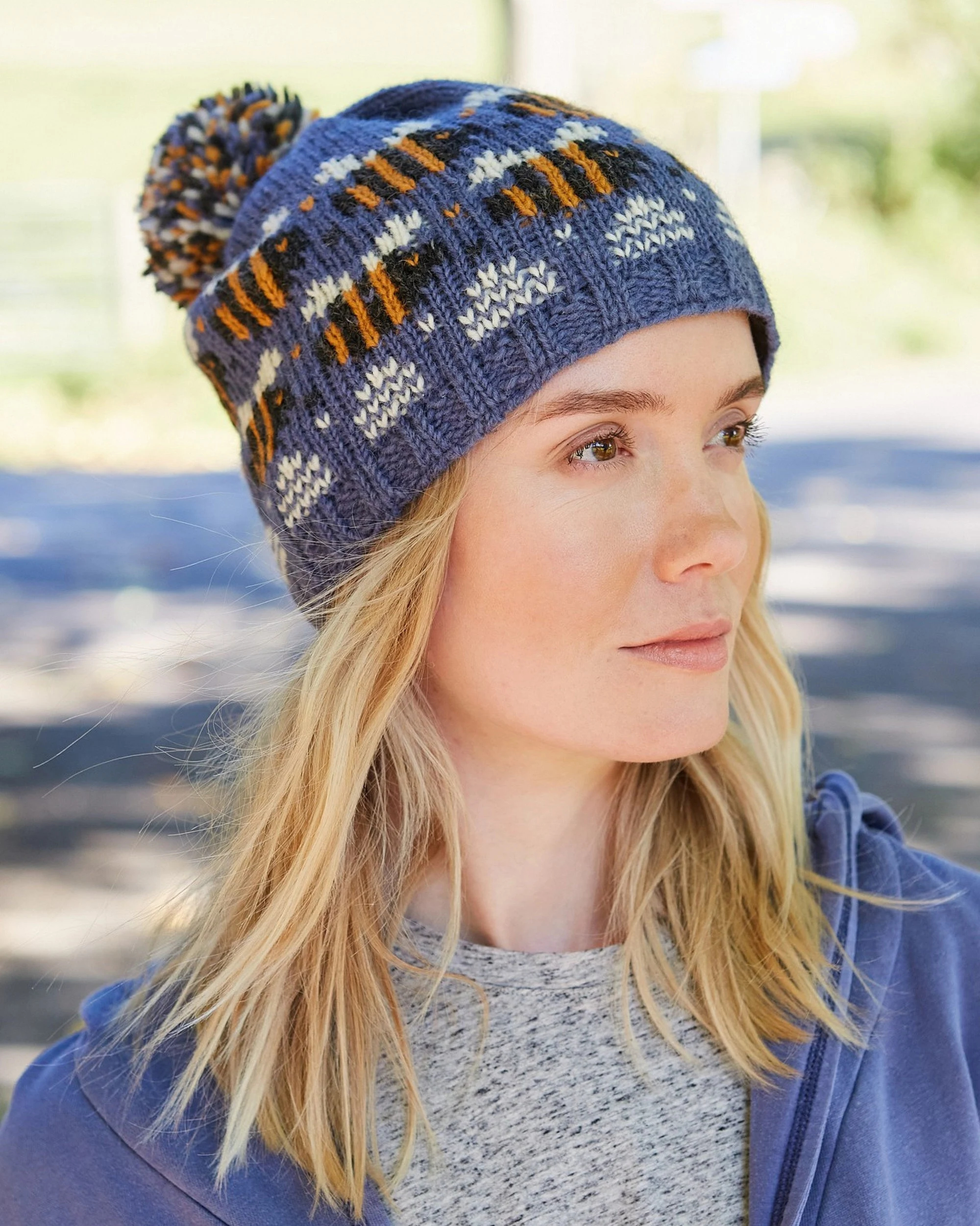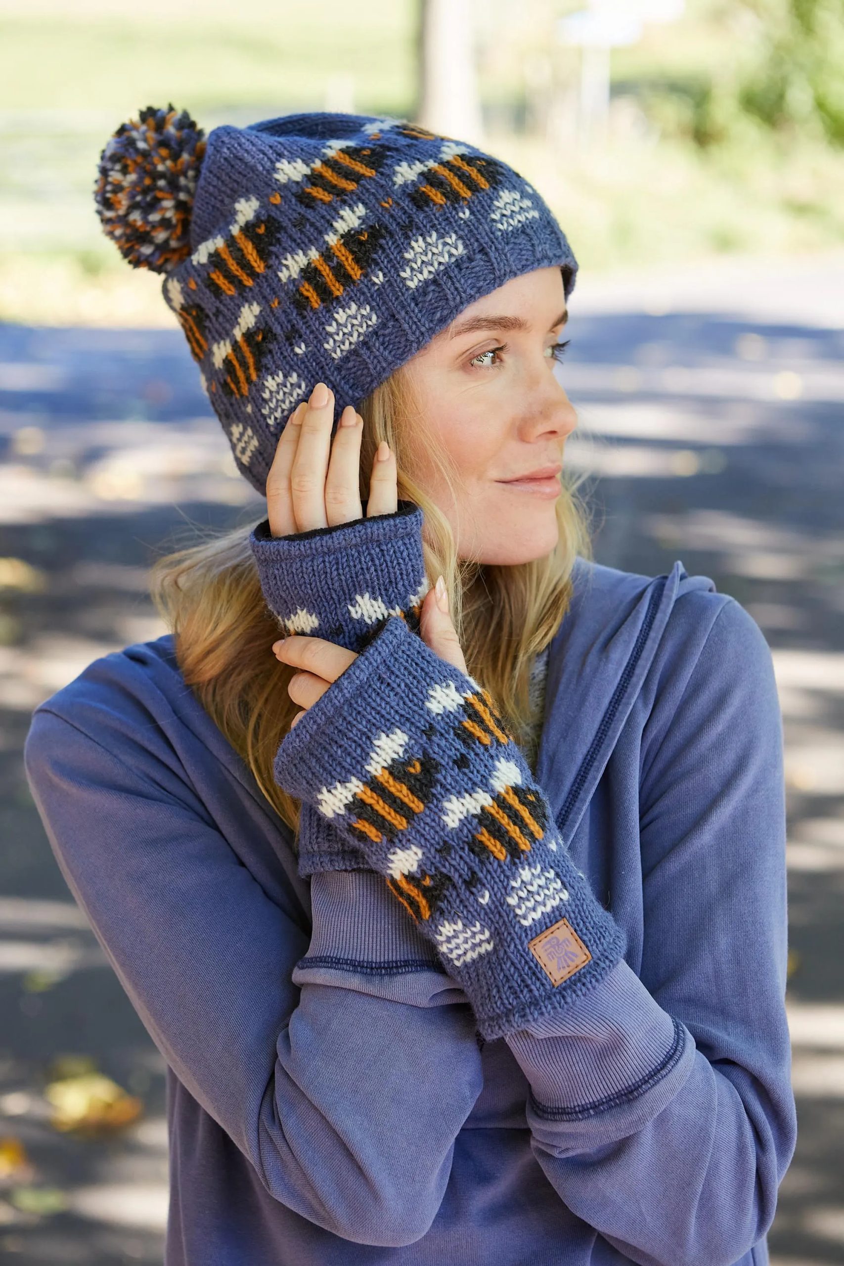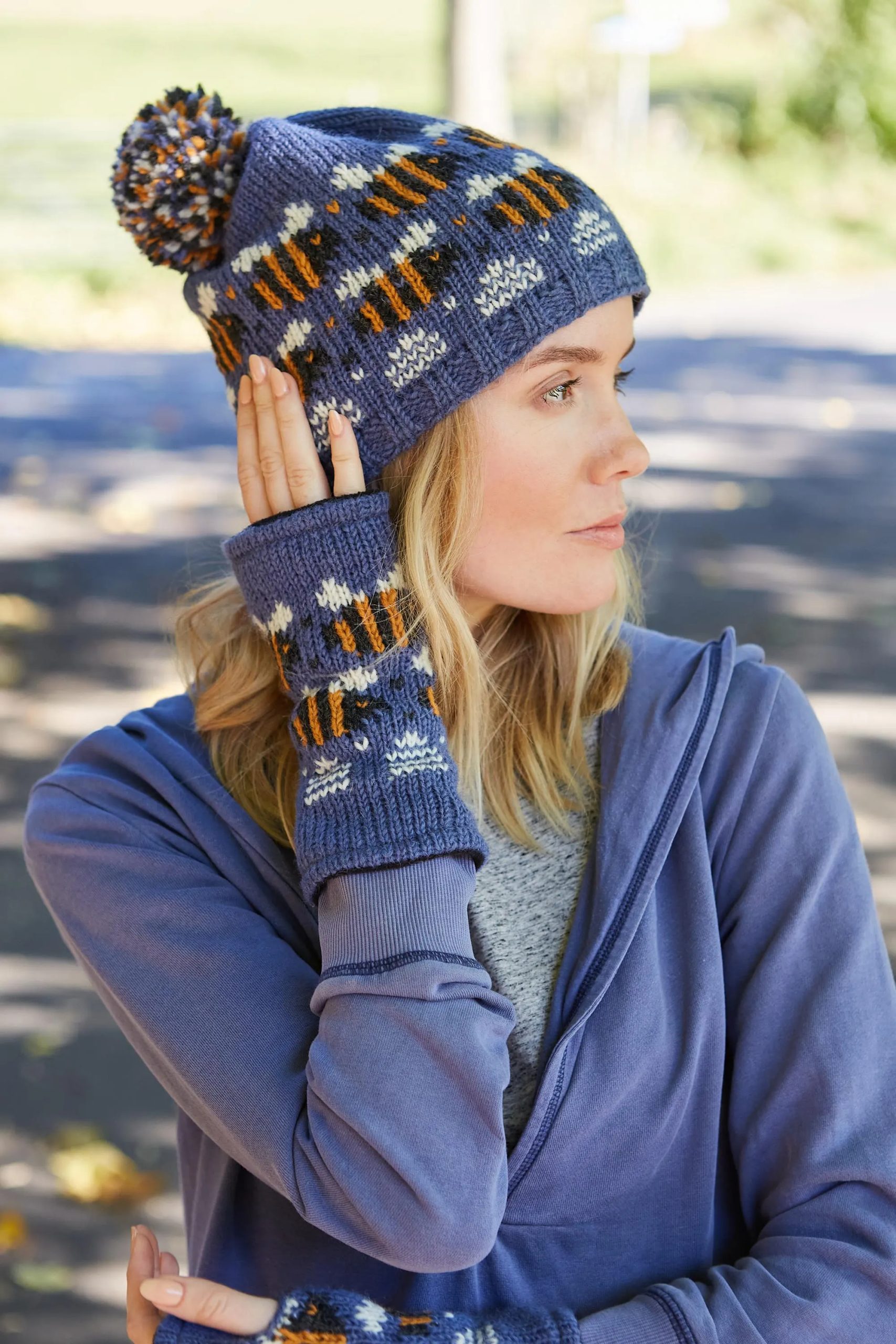 Details: Multi-colored jacquard bee pattern, ribbed cuffs, and securely sewn mixed-color pom-poms.