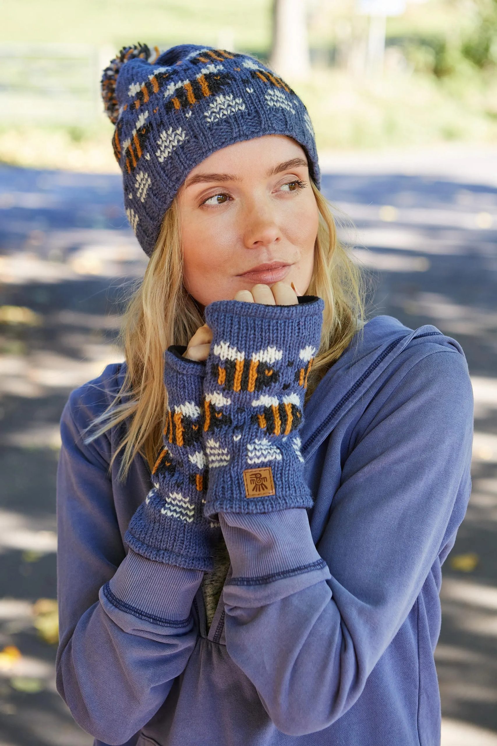 This navy blue knit hat exudes vibrant charm—gold-striped bees and delicate honeycomb knitting, paired with mixed-color pom-poms and a soft folded brim. Comfortable and playful, it’s the perfect choice for a bright winter day.