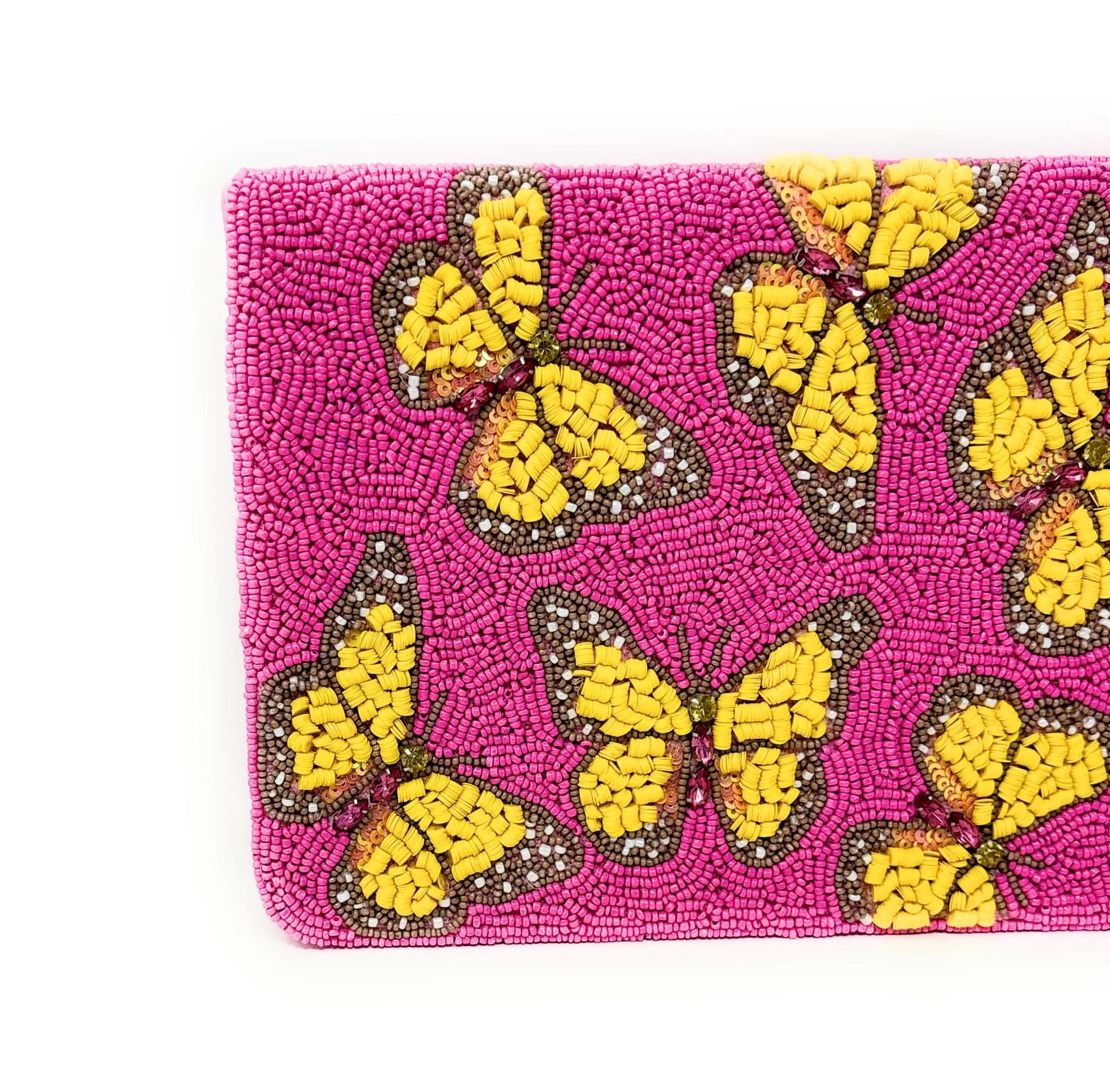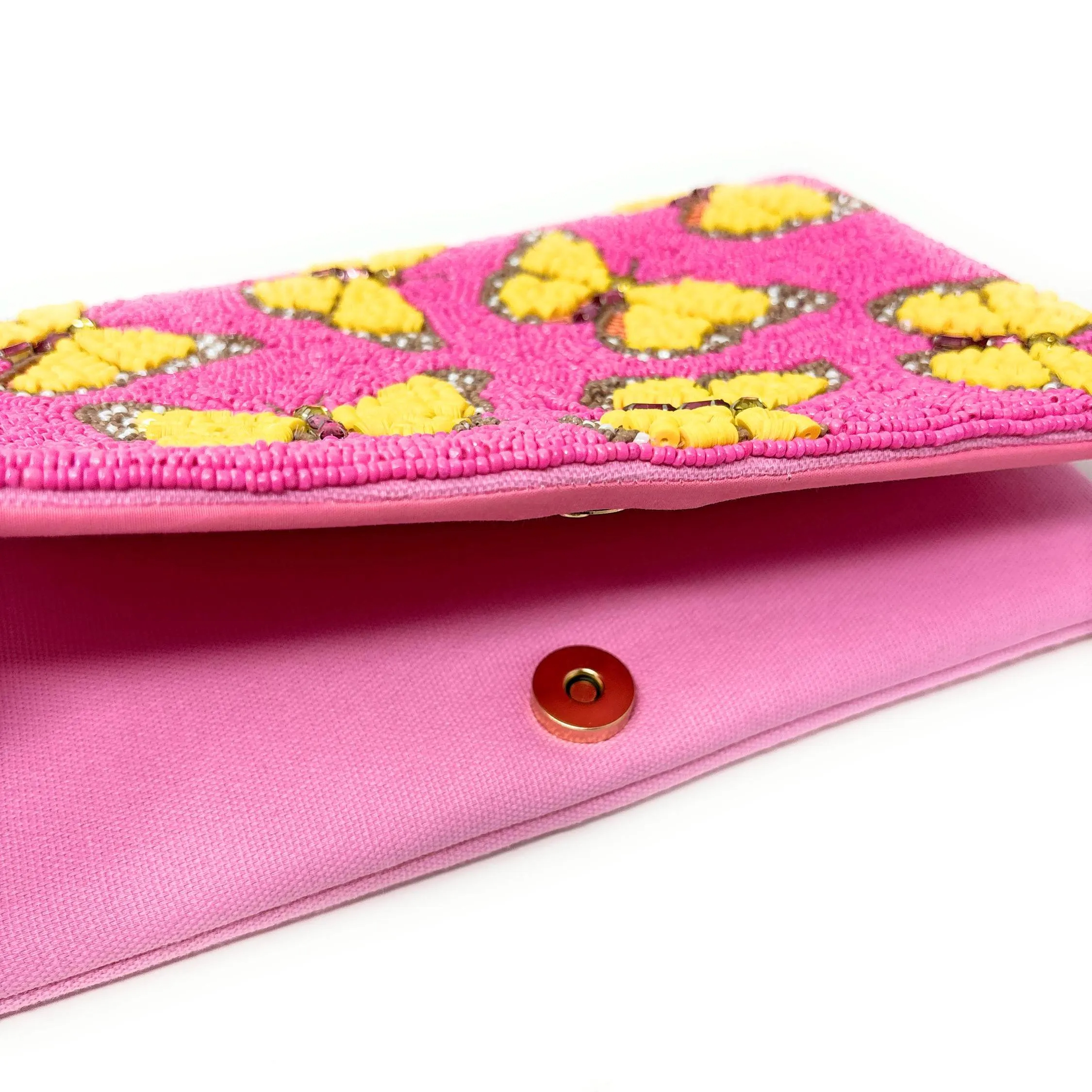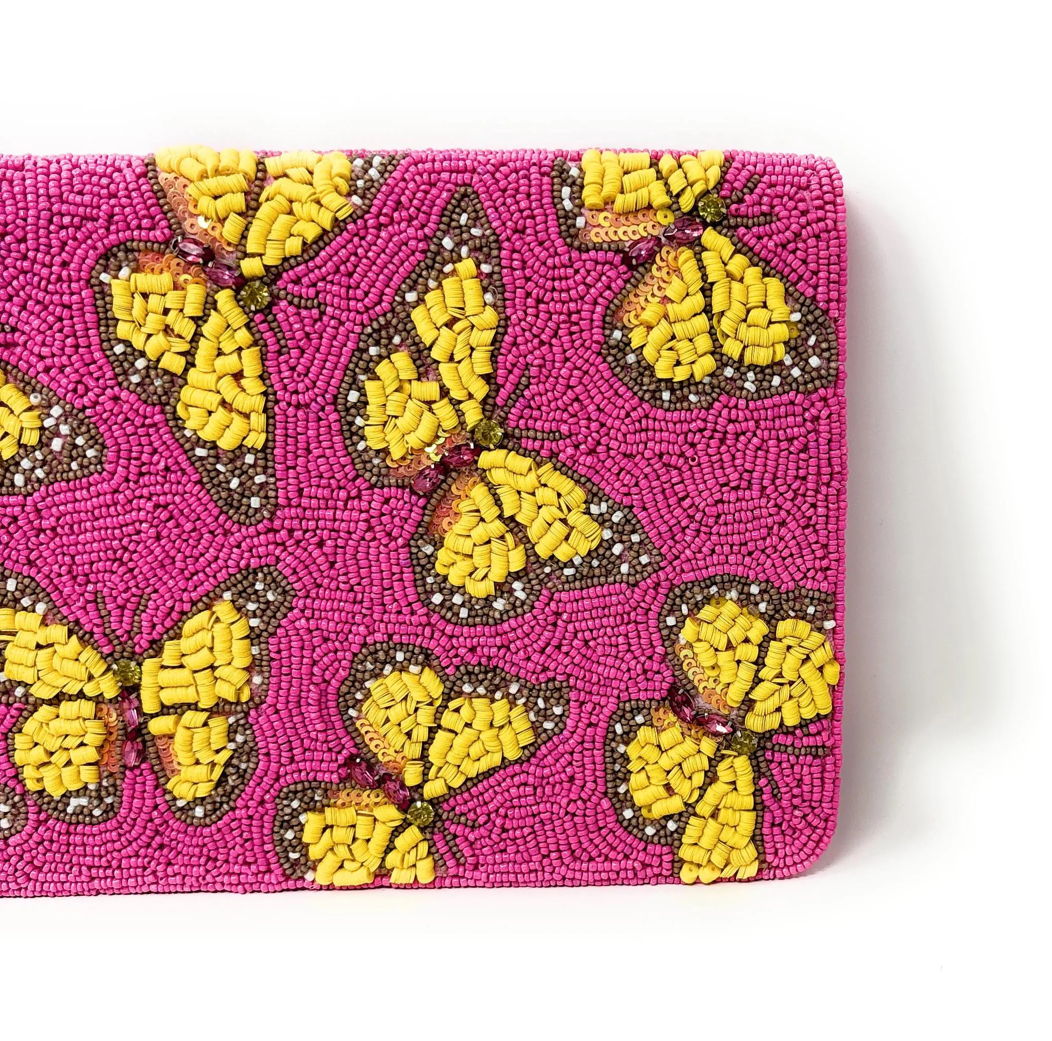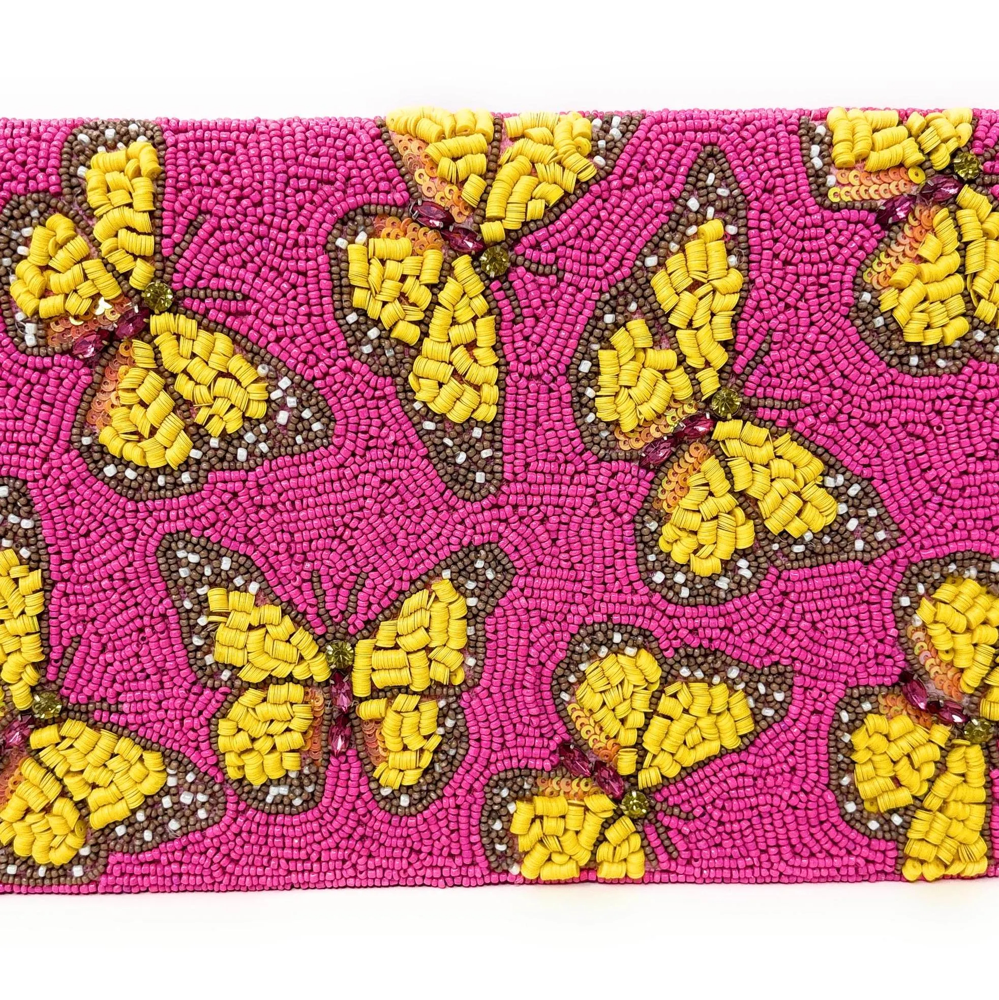 Beading and embellishments: The beadwork is carefully selected from high-gloss glass rice beads and sparkling rhinestones. The yellow beads simulate the vibrant texture of butterfly wings, while rhinestones interspersed between them resemble dewdrops on the wings, reflecting vibrant light. The densely arranged pink base beads create a delicate and soft base.
