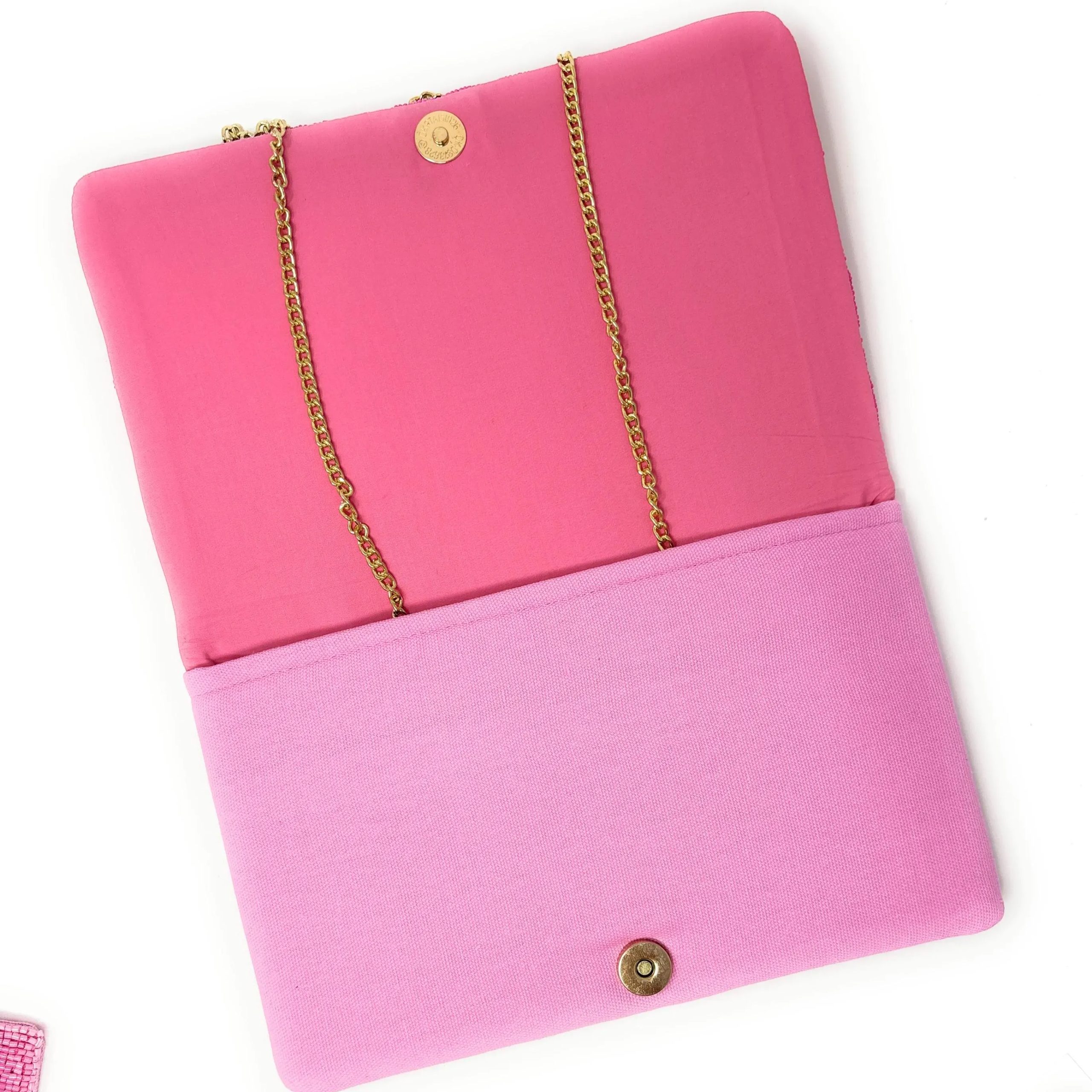 Base and Structure: The base of the bag is crafted from high-density pink satin, creating a crisp, stylish, and luxurious feel. The flap design is simple and elegant, allowing for easy opening and closing, and features a built-in secret pocket for securely storing small items.