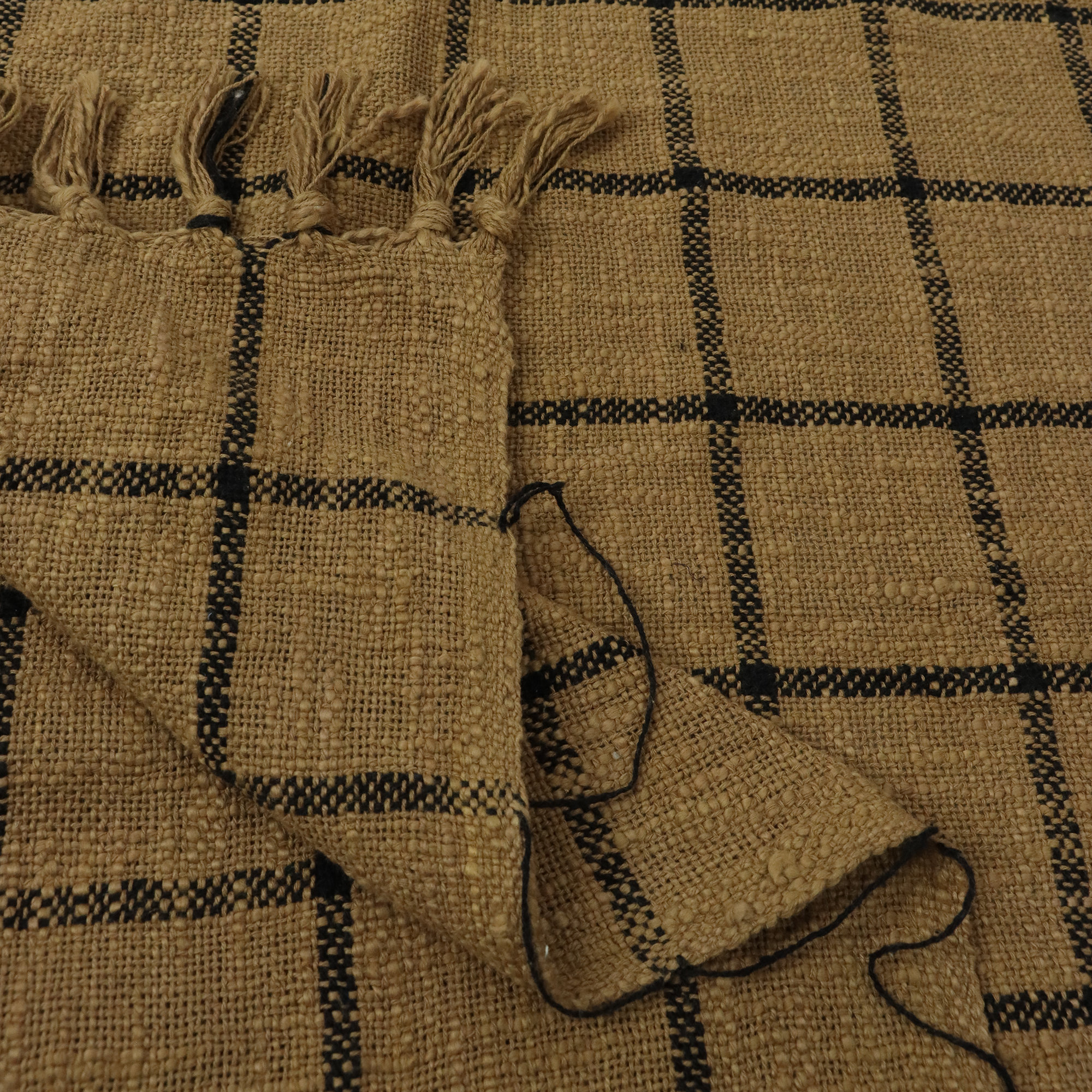 The camel and black windowpane check pattern creates a sophisticated, menswear-inspired look that pairs well with neutrals, leather, and wood tones. Drape it over the armrest of a sofa or fold it at the foot of a bed to add a warm, understated touch.