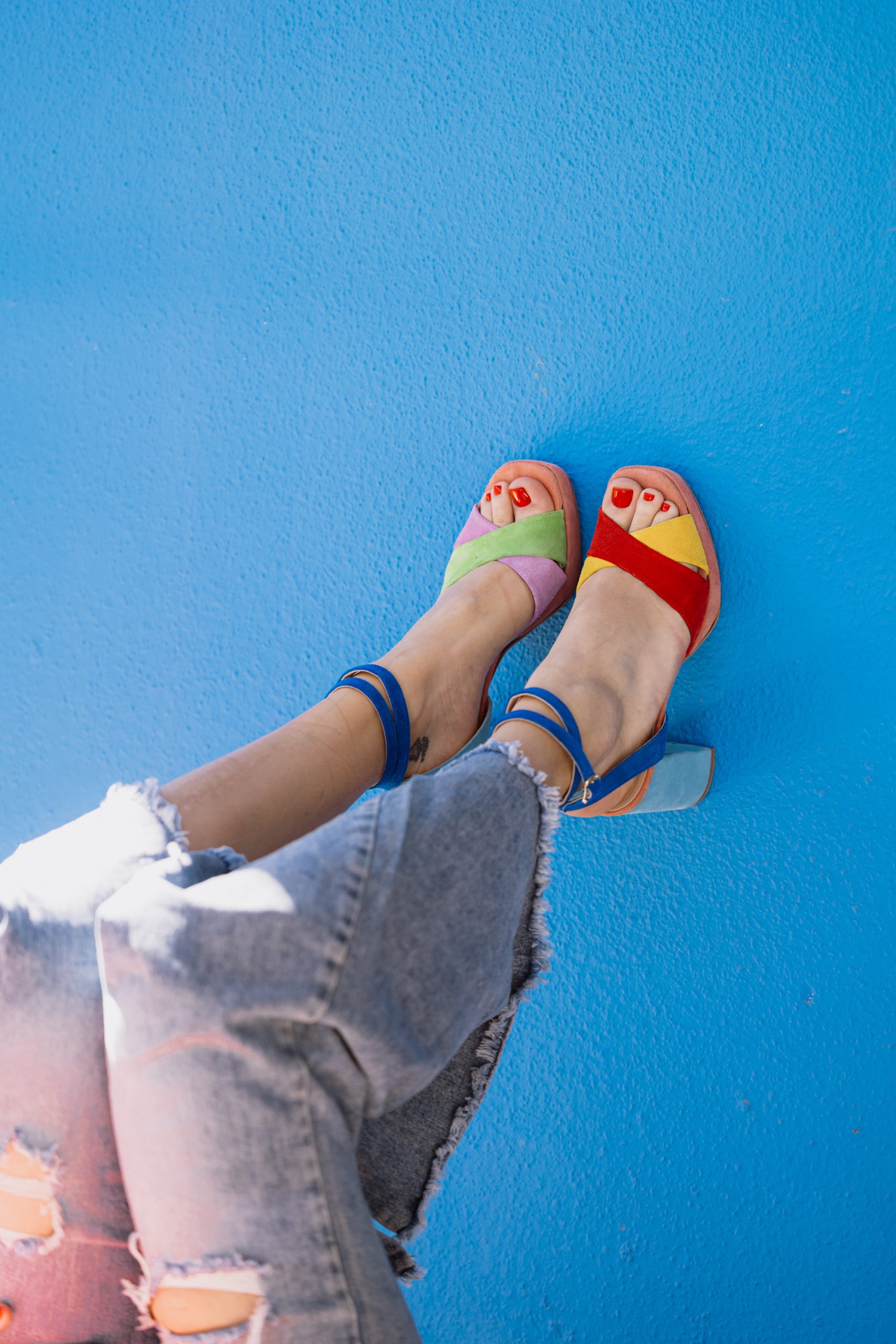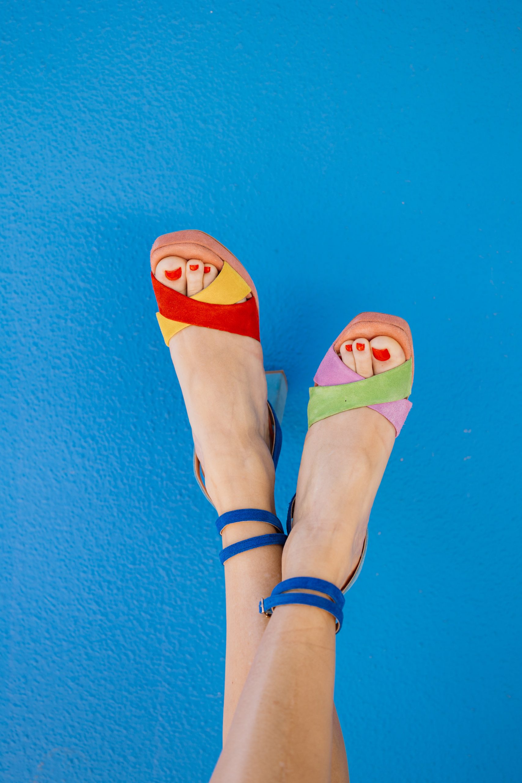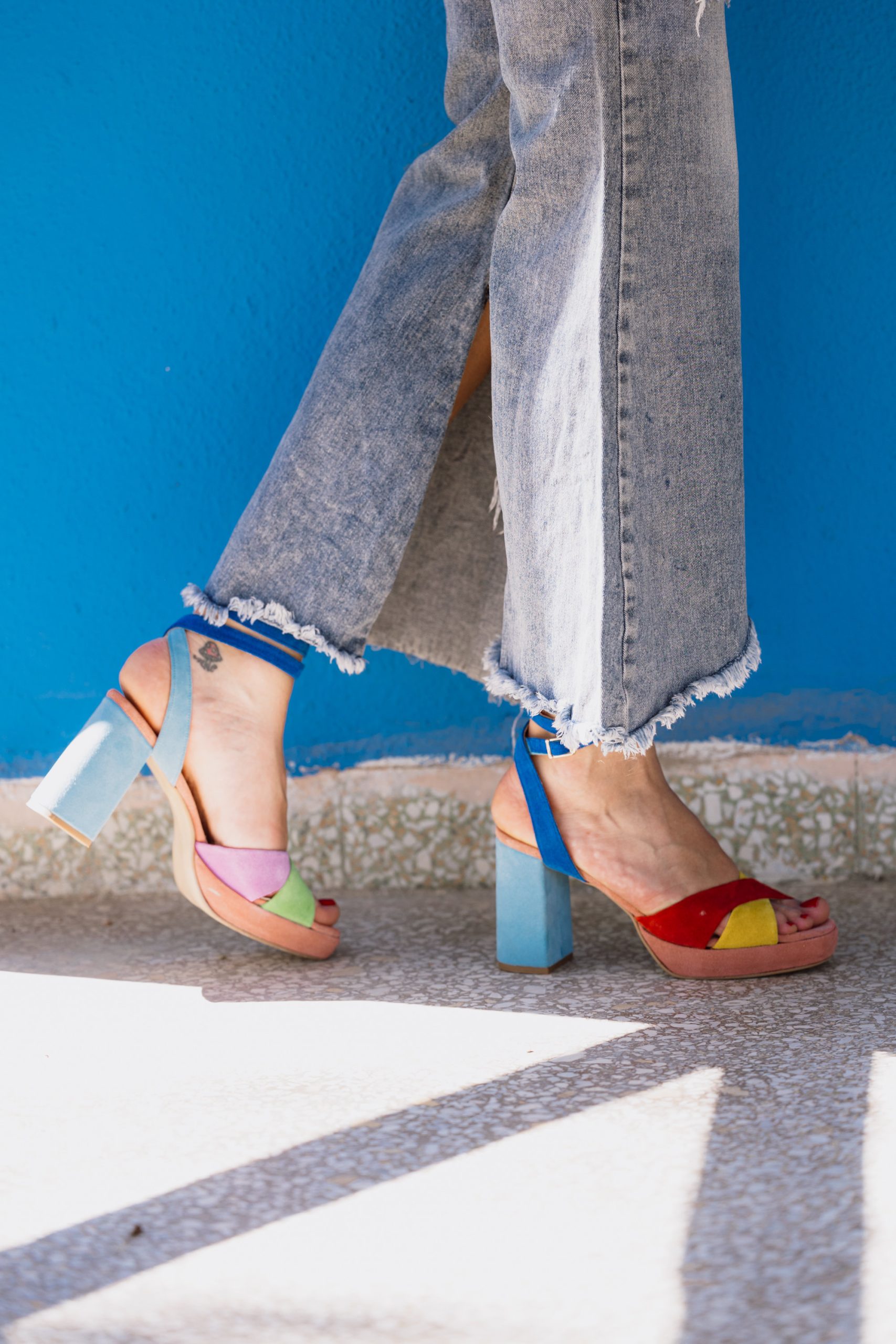 These sandals are crafted from velvety soft suede in a patchwork of cherry red, sunny yellow, lime green, and pale purple, paired with a stylish cobalt blue ankle strap and a matching chunky heel. The crisscross straps accentuate the foot’s contours, while the slightly boxy open-toe upper adds a modern touch. The balanced chunky heel provides effortless height, and the softly cushioned sole ensures comfort from brunch to seaside evenings.