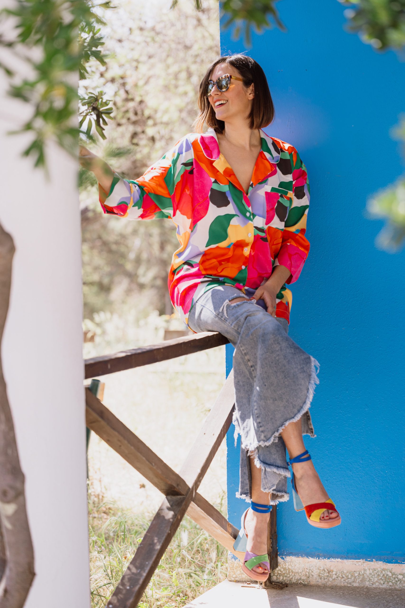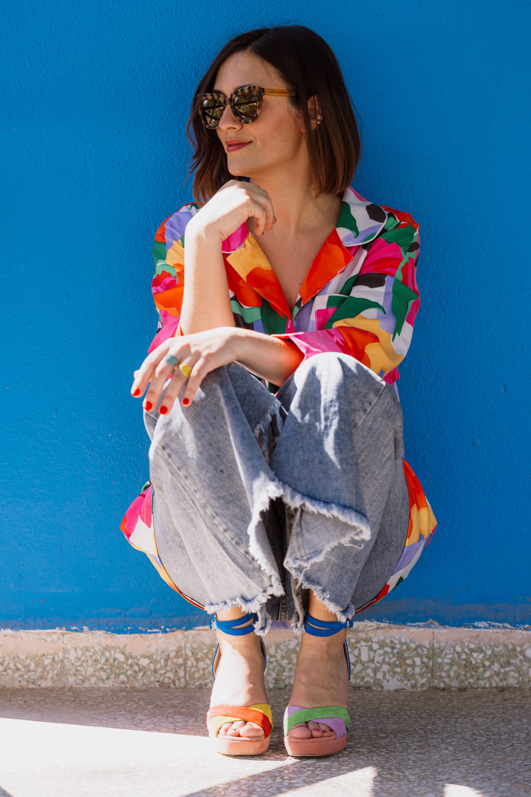 Complement the shoe’s color scheme with white linen or denim pieces, or choose a bag or top that echoes the shoe’s color—red, yellow, lime, pale purple, or cobalt blue—for an effortlessly harmonious look. A straw tote bag adds a touch of holiday style.