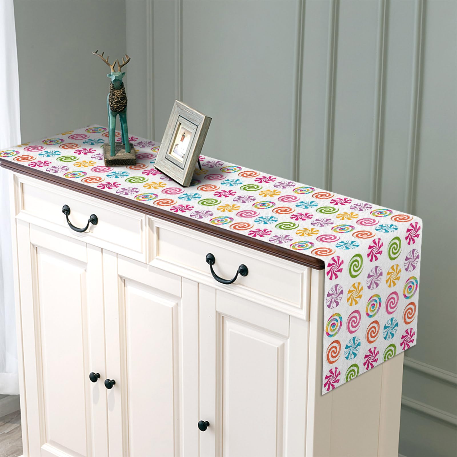 Add a touch of sweetness to your table with this candy swirl table runner. A playful all-over pattern instantly adds energy to any party, while the linen-and-polyester blend offers a texture you’ll love with everyday durability. Perfect for dessert tables, birthday parties, or holiday buffets—the bright color scheme easily complements disposable party favors and classic white tableware.