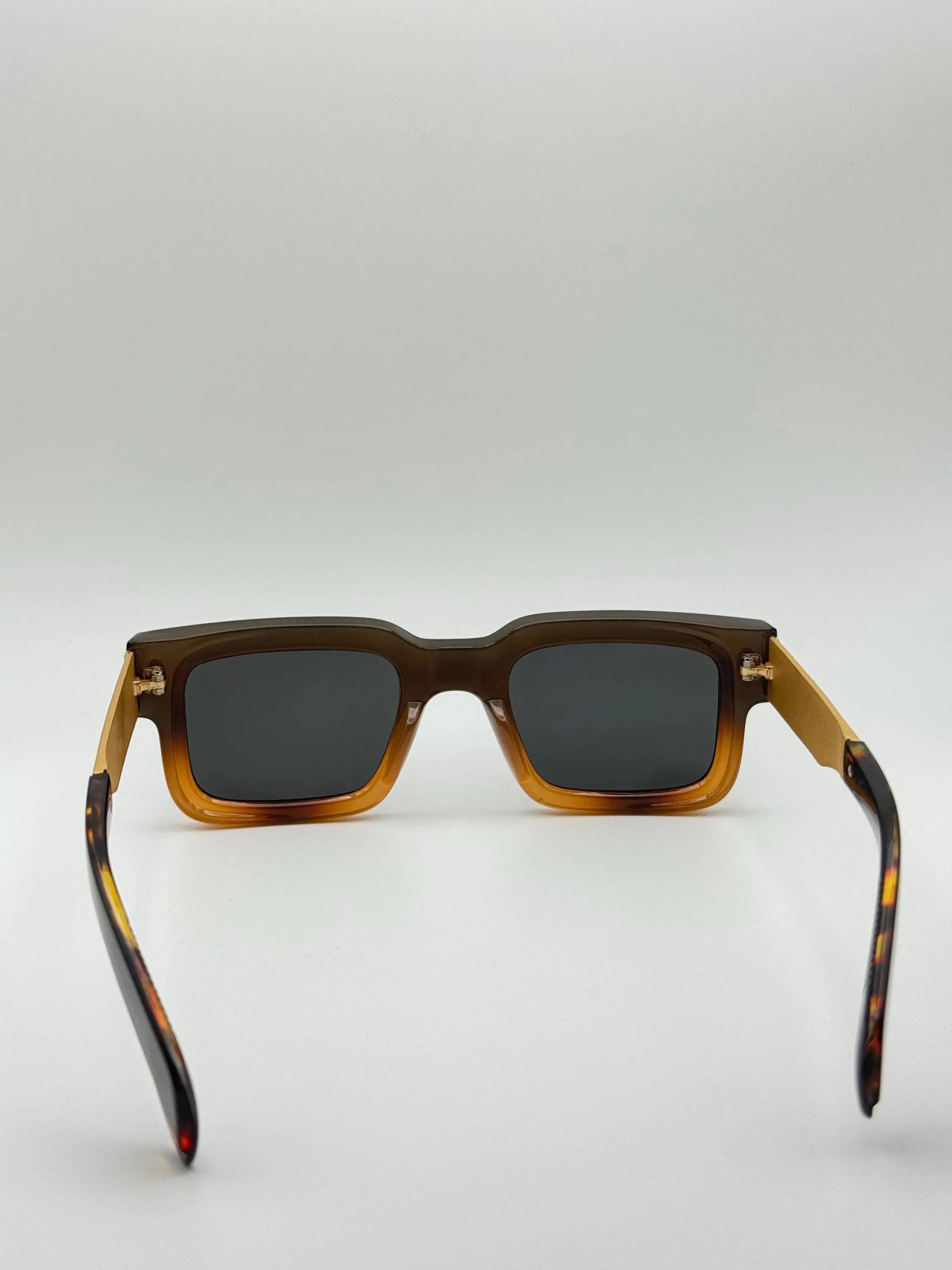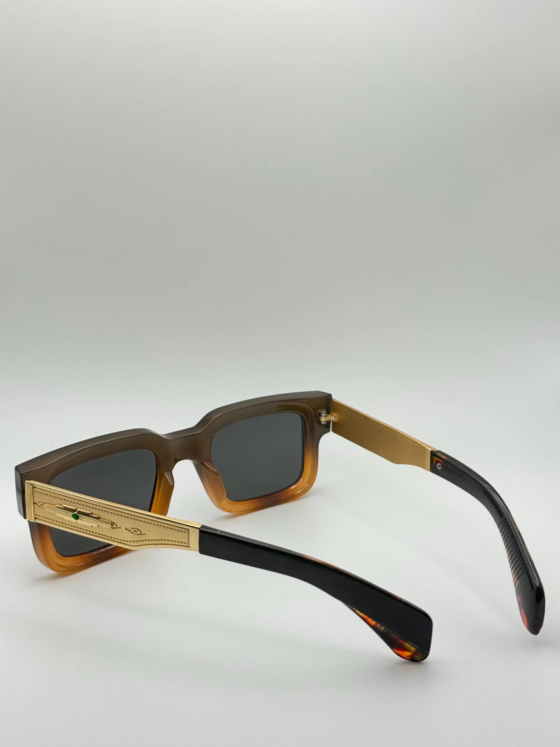 This is a pair of square-framed sunglasses that emphasizes a “retro, understated luxury” feel. It features a black-to-brown gradient tortoiseshell acetate frame as its base, paired with gold-engraved temples and detailed embellishments. The black-to-brown gradient tortoiseshell texture is achieved through a deep-dyeing process, creating a naturally transitioning pattern and recreating the warm, smooth feel of vintage accessories. The square frame flatters facial features (slimming round faces and softening angular features), while the gold-engraved details on the temples (paired with delicate decorative elements) enhance its refined and distinctive look, avoiding the monotony of a basic style without being overly ostentatious. The dark gray full-light lenses are suitable for bright lighting conditions, giving the overall style both “everyday practicality” and “styling flair”—making it the ideal accessory for retro enthusiasts to create sophisticated looks for commuting or casual dates. The combination of the retro tortoiseshell texture and the understated luxury of the gold engravings effortlessly elevates the sophistication of any outfit.