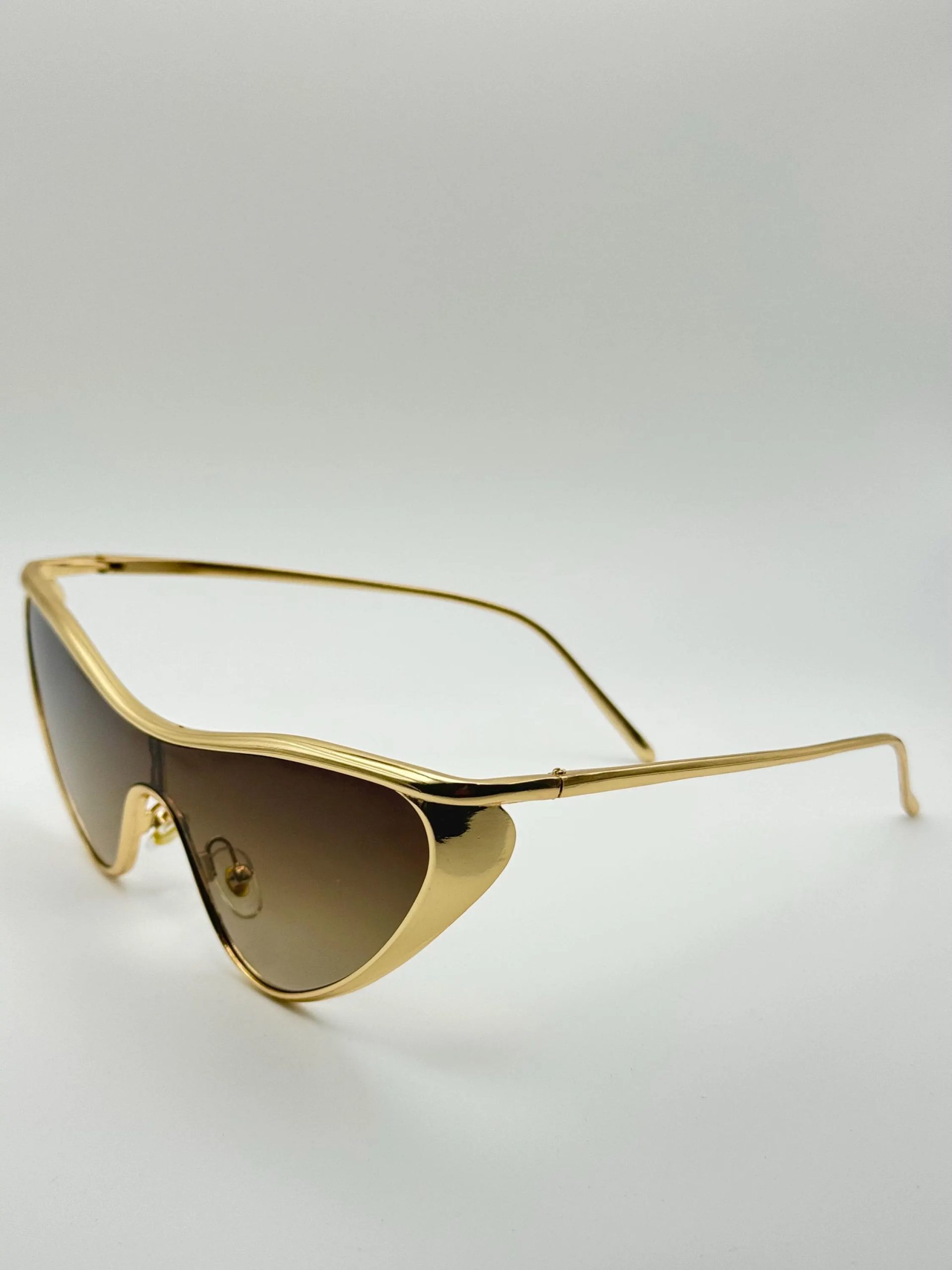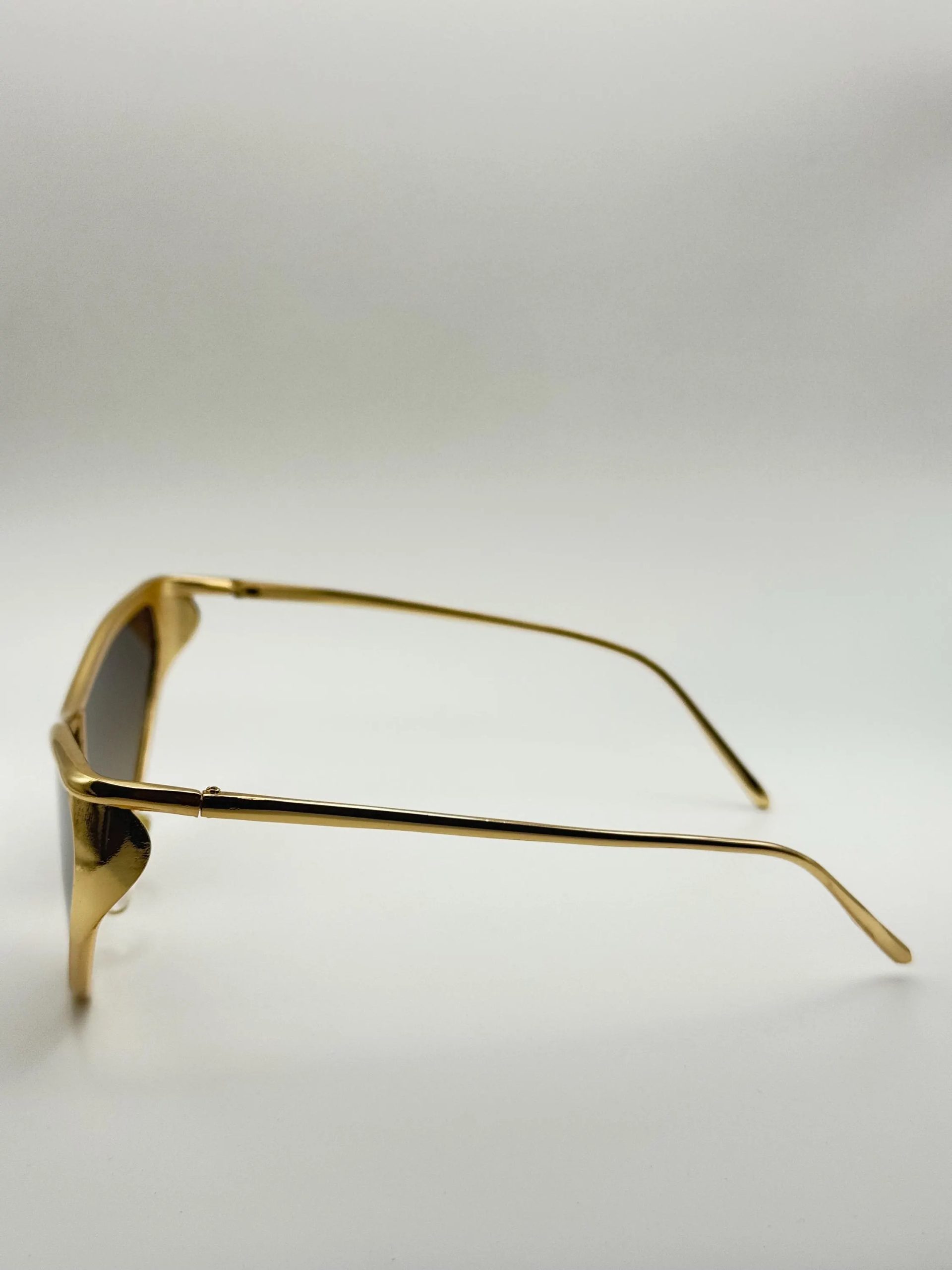 This is a pair of cat-eye wing-shaped sunglasses that emphasizes a “retro vibe with a touch of understated luxury.” Its core design features a bright gold metallic wing-shaped frame and gradient brown lenses. The classic cat-eye shape’s upward sweeping lines slim the jawline, while the extended wing-shaped structure enhances visual tension, exuding an eye-catching retro party aura. The bright gold metallic frame undergoes a multi-layer electroplating process to achieve a rich luster, highlighting a luxurious feel through its clean lines without unnecessary embellishments. The gradient brown lenses transition from light to dark brown, ensuring both sun protection in strong sunlight and maintaining visual clarity in low-light environments. It’s not only a practical sun protection item for outdoor scenes with strong sunlight, but also a key accessory for creating a “sexy retro” or “mature yet sophisticated” look—the delicate feel of the metallic wing shape combined with the retro vibe of the cat-eye easily becomes the visual focus of your outfit.