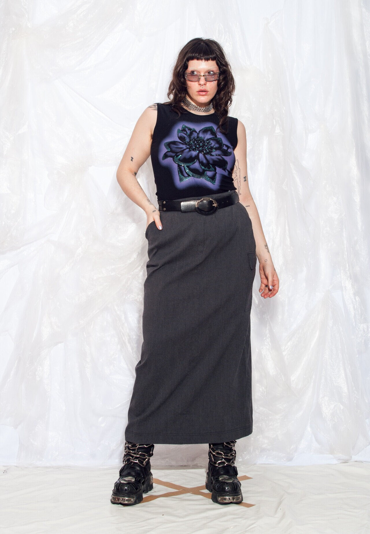 This simple, minimalist tube skirt features a dark charcoal hue. Its long, straight lines are sleek and stylish, while the flowing drape makes it perfect for day or night. Wear it with a T-shirt and sneakers, or a crisp shirt and boots for a sophisticated and casual look.