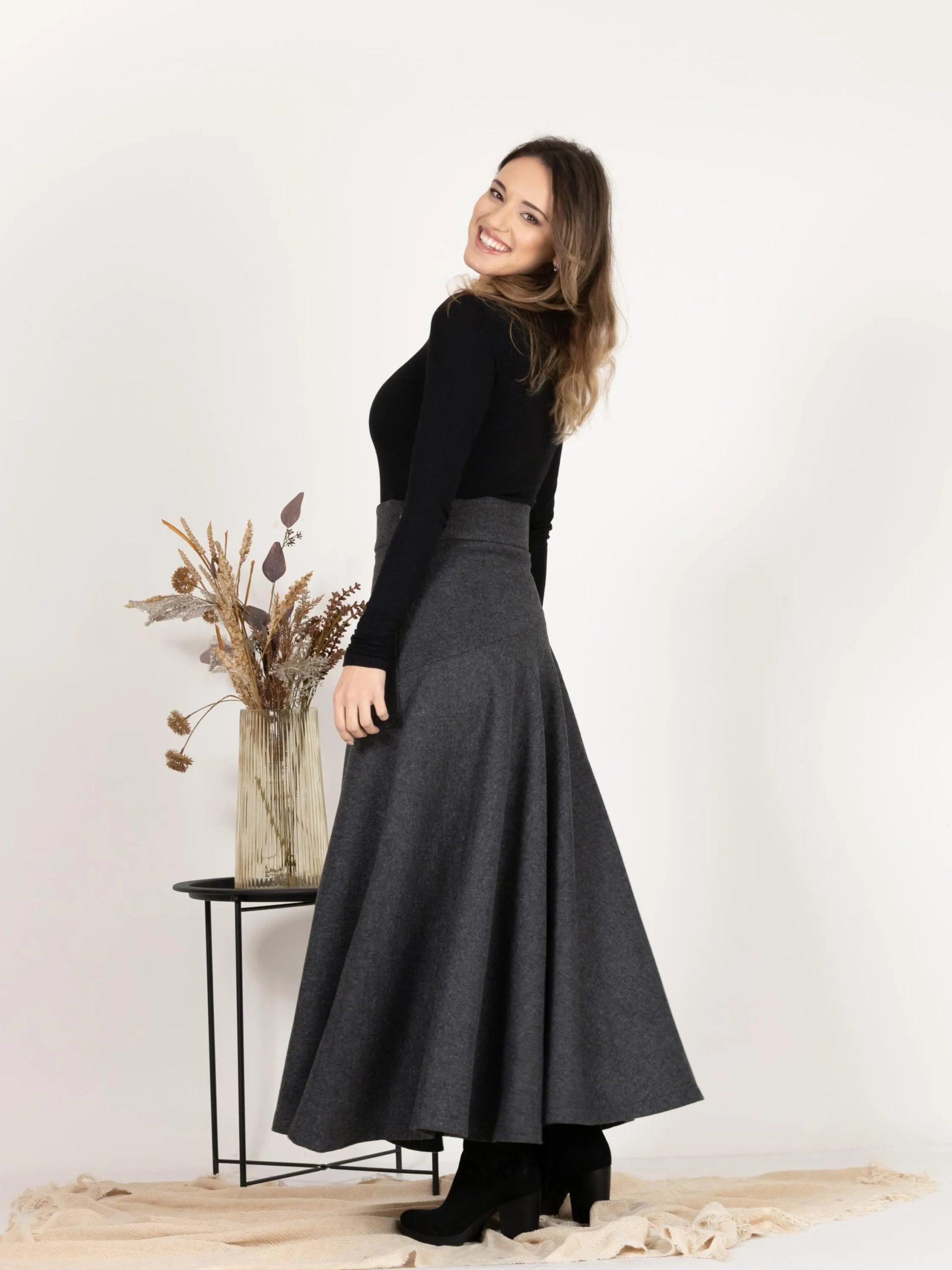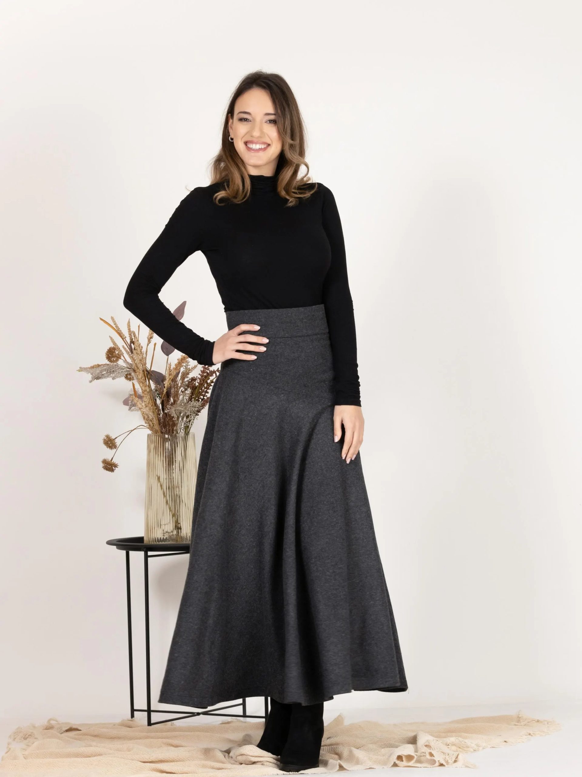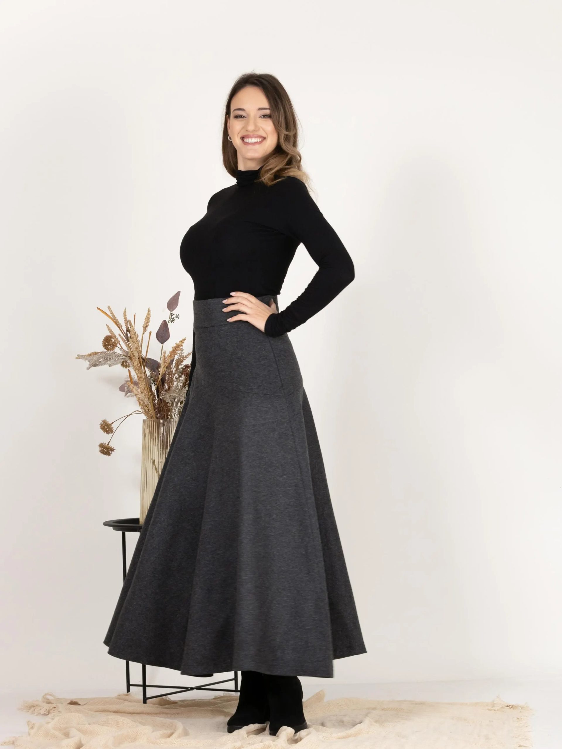 This charcoal gray flared midi skirt is elegant and versatile, blending minimalism with a dynamic feel. Its fluid structure flows effortlessly with every step, making it a classic piece for cooler weather.