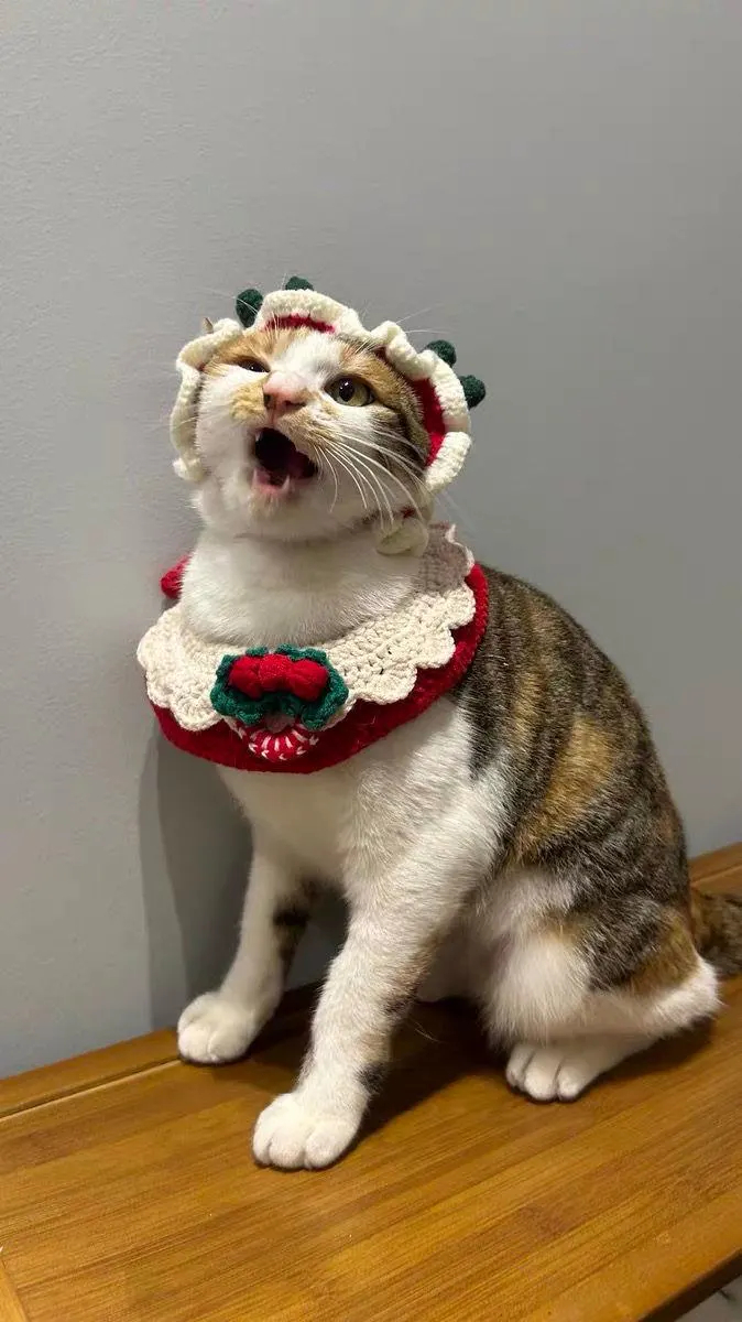 This set is crafted entirely from fine, high-elastic crochet yarn, boasting a soft and delicate texture that’s irresistibly inviting to touch. The crochet yarn is made from a pet-friendly, soft material, feeling warm and soft like a Christmas hot cocoa blanket. Without any stiff crochet burrs, it won’t snag or cause itching around the ears and neck of short-haired cats like tabby cats. It also prevents snagging on the fur of long-haired cats, ensuring comfort and freedom of movement.