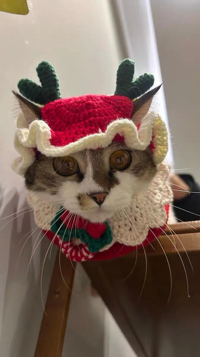 This Christmas reindeer crochet cat hat and scarf set is a limited-edition “adorable Christmas reindeer outfit” tailor-made for felines. Featuring a red crochet base with green crocheted antlers, fluffy lace, and a textured neckerchief, it evokes the image of a “cute little reindeer in a Christmas forest.” Whether for Christmas family photos, everyday adorable snapshots, or pet Christmas parties, it will instantly transform your cat into the “cute focus of the holiday atmosphere,” easily melting your heart.