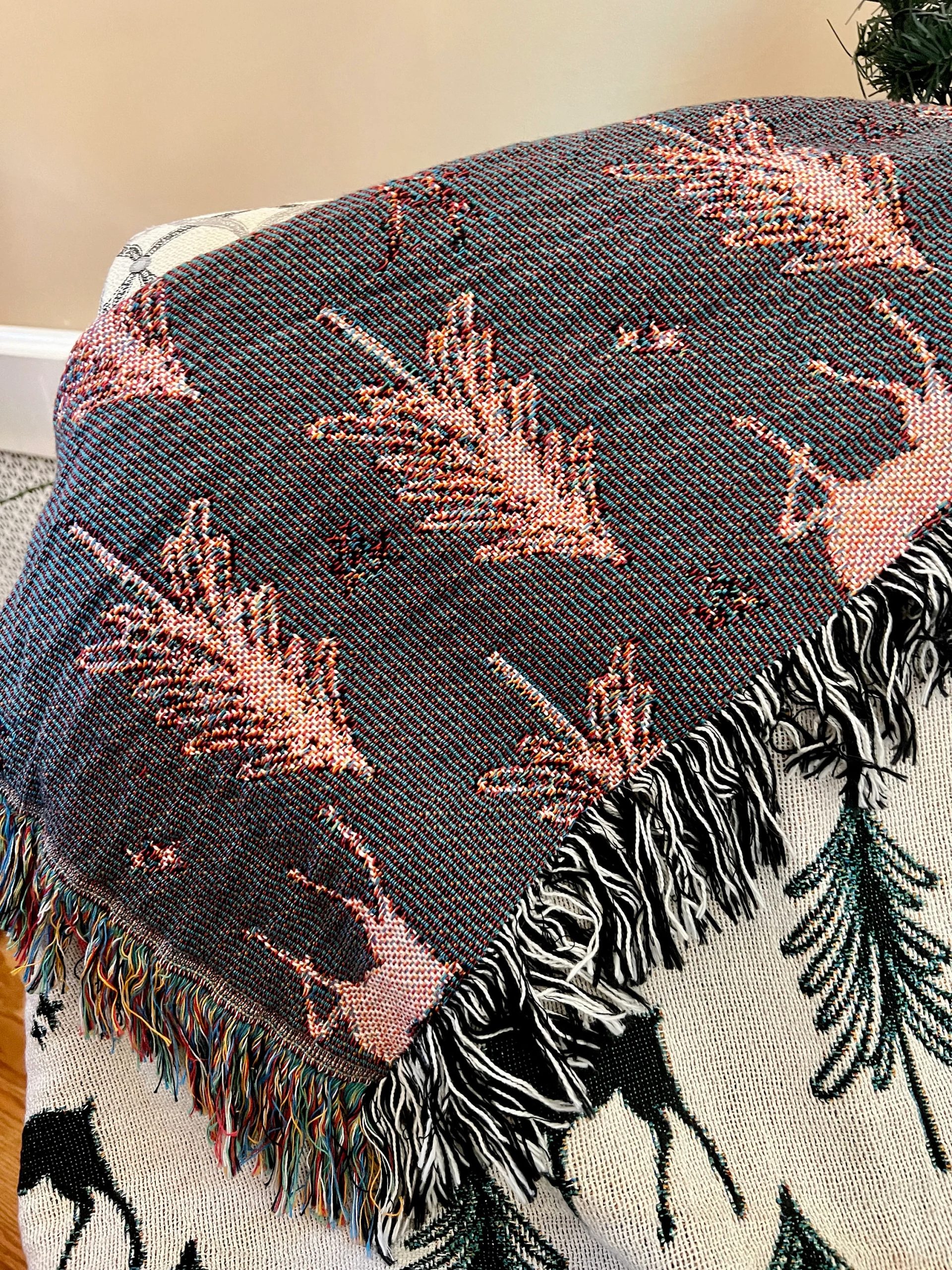 Retro Tassel Edge: Handmade tassels adorn the blanket’s edge, creating a vintage, handcrafted feel that complements the Christmas-themed elk and pine trees. The gentle sway of the tassels adds a touch of winter retro charm, elevating the blanket from a practical item to a Christmas art piece. The details showcase festive style and craftsmanship.